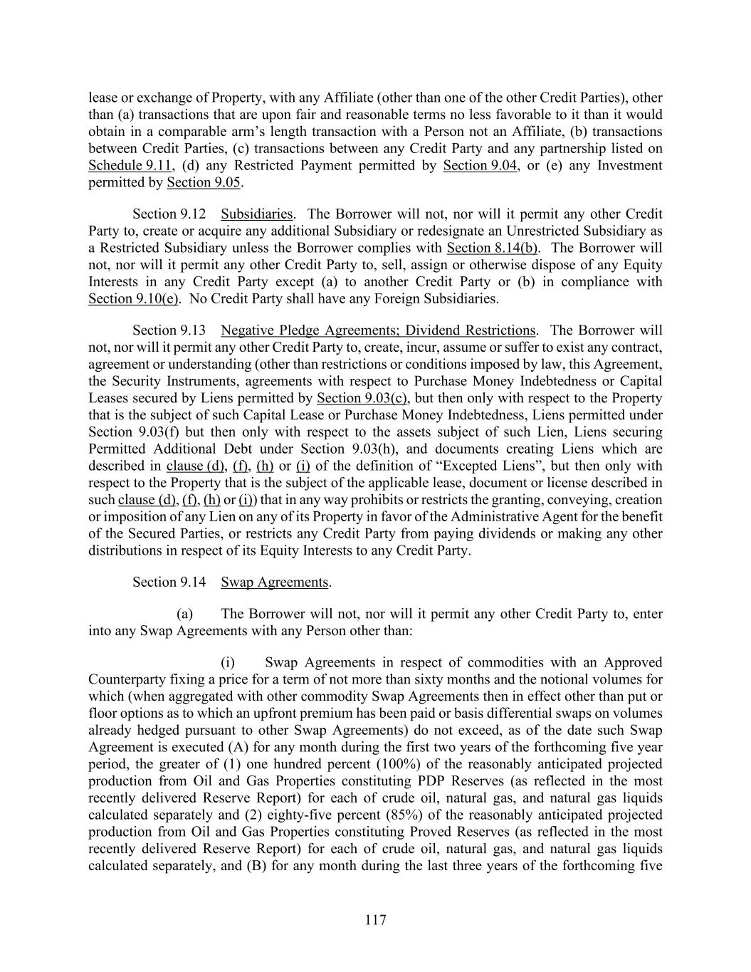 117 lease or exchange of Property, with any Affiliate (other than one of the other Credit Parties), other than (a) transactions that are upon fair and reasonable terms no less favorable to it than it would obtain in a comparable arm’s length transaction with a Person not an Affiliate, (b) transactions between Credit Parties, (c) transactions between any Credit Party and any partnership listed on Schedule 9.11, (d) any Restricted Payment permitted by Section 9.04, or (e) any Investment permitted by Section 9.05. Section 9.12 Subsidiaries. The Borrower will not, nor will it permit any other Credit Party to, create or acquire any additional Subsidiary or redesignate an Unrestricted Subsidiary as a Restricted Subsidiary unless the Borrower complies with Section 8.14(b). The Borrower will not, nor will it permit any other Credit Party to, sell, assign or otherwise dispose of any Equity Interests in any Credit Party except (a) to another Credit Party or (b) in compliance with Section 9.10(e). No Credit Party shall have any Foreign Subsidiaries. Section 9.13 Negative Pledge Agreements; Dividend Restrictions. The Borrower will not, nor will it permit any other Credit Party to, create, incur, assume or suffer to exist any contract, agreement or understanding (other than restrictions or conditions imposed by law, this Agreement, the Security Instruments, agreements with respect to Purchase Money Indebtedness or Capital Leases secured by Liens permitted by Section 9.03(c), but then only with respect to the Property that is the subject of such Capital Lease or Purchase Money Indebtedness, Liens permitted under Section 9.03(f) but then only with respect to the assets subject of such Lien, Liens securing Permitted Additional Debt under Section 9.03(h), and documents creating Liens which are described in clause (d), (f), (h) or (i) of the definition of “Excepted Liens”, but then only with respect to the Property that is the subject of the applicable lease, document or license described in such clause (d), (f), (h) or (i)) that in any way prohibits or restricts the granting, conveying, creation or imposition of any Lien on any of its Property in favor of the Administrative Agent for the benefit of the Secured Parties, or restricts any Credit Party from paying dividends or making any other distributions in respect of its Equity Interests to any Credit Party. Section 9.14 Swap Agreements. (a) The Borrower will not, nor will it permit any other Credit Party to, enter into any Swap Agreements with any Person other than: (i) Swap Agreements in respect of commodities with an Approved Counterparty fixing a price for a term of not more than sixty months and the notional volumes for which (when aggregated with other commodity Swap Agreements then in effect other than put or floor options as to which an upfront premium has been paid or basis differential swaps on volumes already hedged pursuant to other Swap Agreements) do not exceed, as of the date such Swap Agreement is executed (A) for any month during the first two years of the forthcoming five year period, the greater of (1) one hundred percent (100%) of the reasonably anticipated projected production from Oil and Gas Properties constituting PDP Reserves (as reflected in the most recently delivered Reserve Report) for each of crude oil, natural gas, and natural gas liquids calculated separately and (2) eighty-five percent (85%) of the reasonably anticipated projected production from Oil and Gas Properties constituting Proved Reserves (as reflected in the most recently delivered Reserve Report) for each of crude oil, natural gas, and natural gas liquids calculated separately, and (B) for any month during the last three years of the forthcoming five