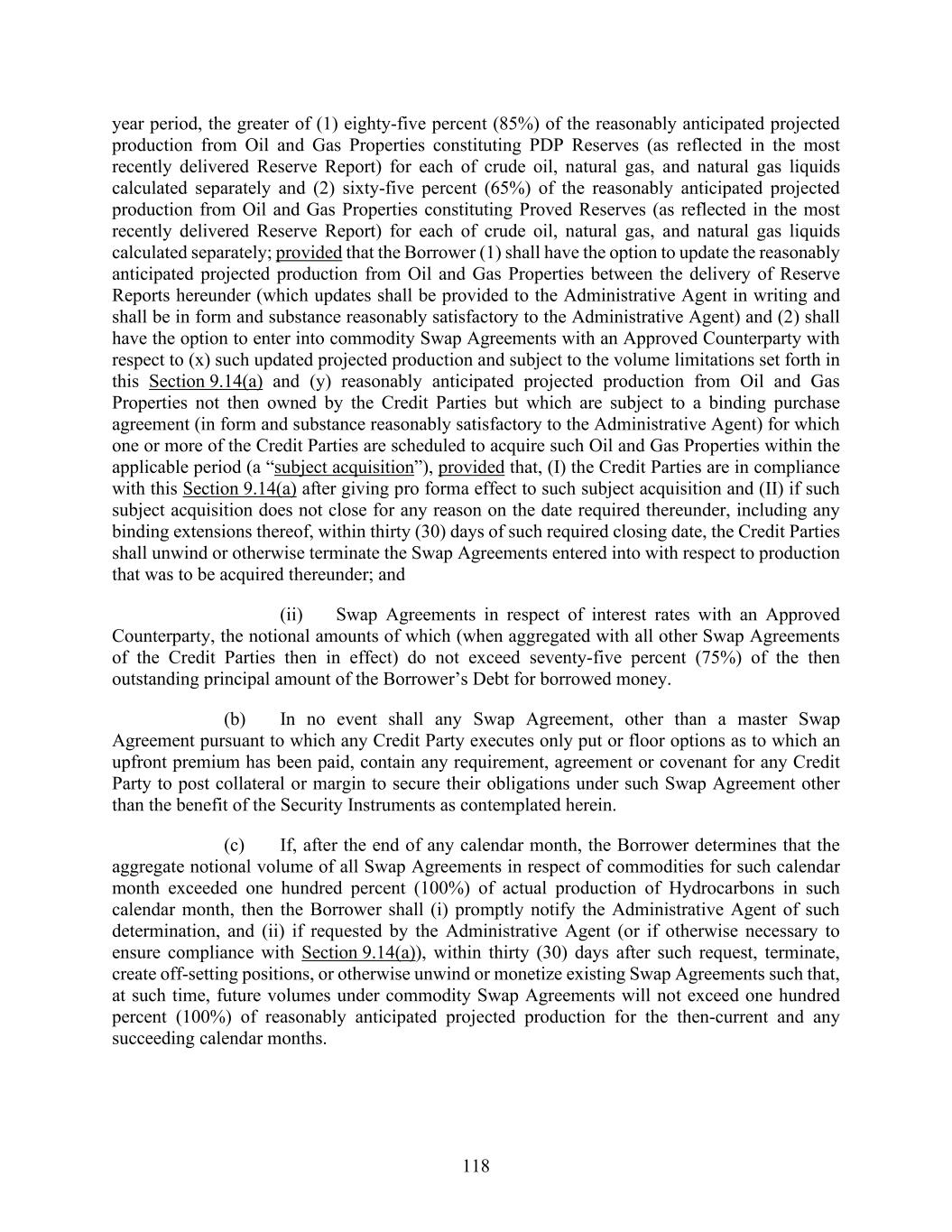 118 year period, the greater of (1) eighty-five percent (85%) of the reasonably anticipated projected production from Oil and Gas Properties constituting PDP Reserves (as reflected in the most recently delivered Reserve Report) for each of crude oil, natural gas, and natural gas liquids calculated separately and (2) sixty-five percent (65%) of the reasonably anticipated projected production from Oil and Gas Properties constituting Proved Reserves (as reflected in the most recently delivered Reserve Report) for each of crude oil, natural gas, and natural gas liquids calculated separately; provided that the Borrower (1) shall have the option to update the reasonably anticipated projected production from Oil and Gas Properties between the delivery of Reserve Reports hereunder (which updates shall be provided to the Administrative Agent in writing and shall be in form and substance reasonably satisfactory to the Administrative Agent) and (2) shall have the option to enter into commodity Swap Agreements with an Approved Counterparty with respect to (x) such updated projected production and subject to the volume limitations set forth in this Section 9.14(a) and (y) reasonably anticipated projected production from Oil and Gas Properties not then owned by the Credit Parties but which are subject to a binding purchase agreement (in form and substance reasonably satisfactory to the Administrative Agent) for which one or more of the Credit Parties are scheduled to acquire such Oil and Gas Properties within the applicable period (a “subject acquisition”), provided that, (I) the Credit Parties are in compliance with this Section 9.14(a) after giving pro forma effect to such subject acquisition and (II) if such subject acquisition does not close for any reason on the date required thereunder, including any binding extensions thereof, within thirty (30) days of such required closing date, the Credit Parties shall unwind or otherwise terminate the Swap Agreements entered into with respect to production that was to be acquired thereunder; and (ii) Swap Agreements in respect of interest rates with an Approved Counterparty, the notional amounts of which (when aggregated with all other Swap Agreements of the Credit Parties then in effect) do not exceed seventy-five percent (75%) of the then outstanding principal amount of the Borrower’s Debt for borrowed money. (b) In no event shall any Swap Agreement, other than a master Swap Agreement pursuant to which any Credit Party executes only put or floor options as to which an upfront premium has been paid, contain any requirement, agreement or covenant for any Credit Party to post collateral or margin to secure their obligations under such Swap Agreement other than the benefit of the Security Instruments as contemplated herein. (c) If, after the end of any calendar month, the Borrower determines that the aggregate notional volume of all Swap Agreements in respect of commodities for such calendar month exceeded one hundred percent (100%) of actual production of Hydrocarbons in such calendar month, then the Borrower shall (i) promptly notify the Administrative Agent of such determination, and (ii) if requested by the Administrative Agent (or if otherwise necessary to ensure compliance with Section 9.14(a)), within thirty (30) days after such request, terminate, create off-setting positions, or otherwise unwind or monetize existing Swap Agreements such that, at such time, future volumes under commodity Swap Agreements will not exceed one hundred percent (100%) of reasonably anticipated projected production for the then-current and any succeeding calendar months.