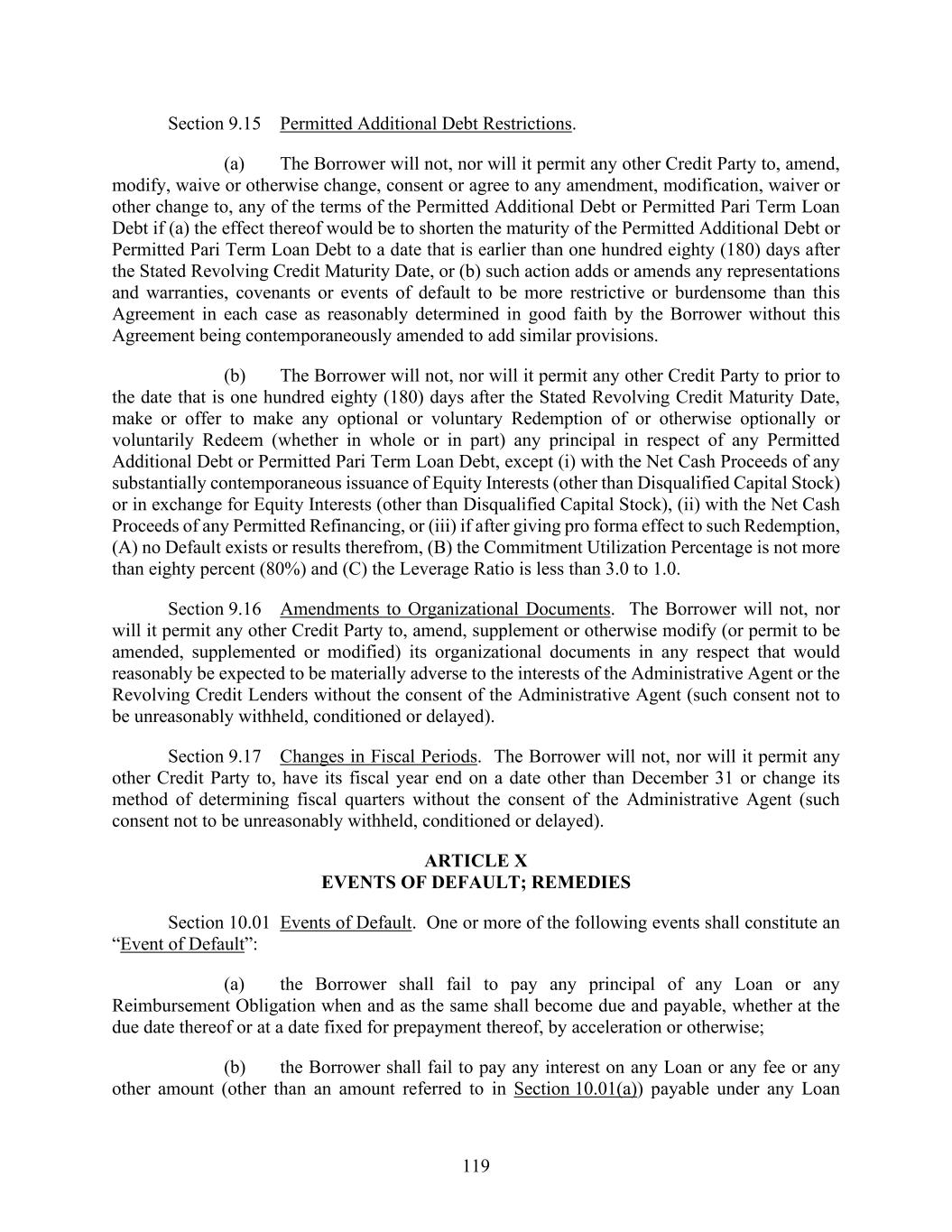 119 Section 9.15 Permitted Additional Debt Restrictions. (a) The Borrower will not, nor will it permit any other Credit Party to, amend, modify, waive or otherwise change, consent or agree to any amendment, modification, waiver or other change to, any of the terms of the Permitted Additional Debt or Permitted Pari Term Loan Debt if (a) the effect thereof would be to shorten the maturity of the Permitted Additional Debt or Permitted Pari Term Loan Debt to a date that is earlier than one hundred eighty (180) days after the Stated Revolving Credit Maturity Date, or (b) such action adds or amends any representations and warranties, covenants or events of default to be more restrictive or burdensome than this Agreement in each case as reasonably determined in good faith by the Borrower without this Agreement being contemporaneously amended to add similar provisions. (b) The Borrower will not, nor will it permit any other Credit Party to prior to the date that is one hundred eighty (180) days after the Stated Revolving Credit Maturity Date, make or offer to make any optional or voluntary Redemption of or otherwise optionally or voluntarily Redeem (whether in whole or in part) any principal in respect of any Permitted Additional Debt or Permitted Pari Term Loan Debt, except (i) with the Net Cash Proceeds of any substantially contemporaneous issuance of Equity Interests (other than Disqualified Capital Stock) or in exchange for Equity Interests (other than Disqualified Capital Stock), (ii) with the Net Cash Proceeds of any Permitted Refinancing, or (iii) if after giving pro forma effect to such Redemption, (A) no Default exists or results therefrom, (B) the Commitment Utilization Percentage is not more than eighty percent (80%) and (C) the Leverage Ratio is less than 3.0 to 1.0. Section 9.16 Amendments to Organizational Documents. The Borrower will not, nor will it permit any other Credit Party to, amend, supplement or otherwise modify (or permit to be amended, supplemented or modified) its organizational documents in any respect that would reasonably be expected to be materially adverse to the interests of the Administrative Agent or the Revolving Credit Lenders without the consent of the Administrative Agent (such consent not to be unreasonably withheld, conditioned or delayed). Section 9.17 Changes in Fiscal Periods. The Borrower will not, nor will it permit any other Credit Party to, have its fiscal year end on a date other than December 31 or change its method of determining fiscal quarters without the consent of the Administrative Agent (such consent not to be unreasonably withheld, conditioned or delayed). ARTICLE X EVENTS OF DEFAULT; REMEDIES Section 10.01 Events of Default. One or more of the following events shall constitute an “Event of Default”: (a) the Borrower shall fail to pay any principal of any Loan or any Reimbursement Obligation when and as the same shall become due and payable, whether at the due date thereof or at a date fixed for prepayment thereof, by acceleration or otherwise; (b) the Borrower shall fail to pay any interest on any Loan or any fee or any other amount (other than an amount referred to in Section 10.01(a)) payable under any Loan