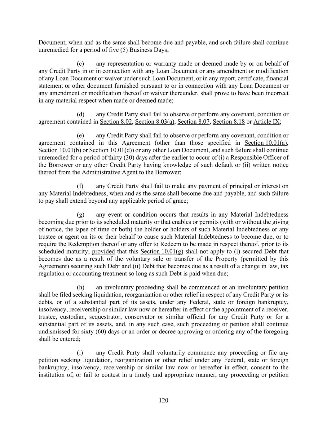 120 Document, when and as the same shall become due and payable, and such failure shall continue unremedied for a period of five (5) Business Days; (c) any representation or warranty made or deemed made by or on behalf of any Credit Party in or in connection with any Loan Document or any amendment or modification of any Loan Document or waiver under such Loan Document, or in any report, certificate, financial statement or other document furnished pursuant to or in connection with any Loan Document or any amendment or modification thereof or waiver thereunder, shall prove to have been incorrect in any material respect when made or deemed made; (d) any Credit Party shall fail to observe or perform any covenant, condition or agreement contained in Section 8.02, Section 8.03(a), Section 8.07, Section 8.18 or Article IX; (e) any Credit Party shall fail to observe or perform any covenant, condition or agreement contained in this Agreement (other than those specified in Section 10.01(a), Section 10.01(b) or Section 10.01(d)) or any other Loan Document, and such failure shall continue unremedied for a period of thirty (30) days after the earlier to occur of (i) a Responsible Officer of the Borrower or any other Credit Party having knowledge of such default or (ii) written notice thereof from the Administrative Agent to the Borrower; (f) any Credit Party shall fail to make any payment of principal or interest on any Material Indebtedness, when and as the same shall become due and payable, and such failure to pay shall extend beyond any applicable period of grace; (g) any event or condition occurs that results in any Material Indebtedness becoming due prior to its scheduled maturity or that enables or permits (with or without the giving of notice, the lapse of time or both) the holder or holders of such Material Indebtedness or any trustee or agent on its or their behalf to cause such Material Indebtedness to become due, or to require the Redemption thereof or any offer to Redeem to be made in respect thereof, prior to its scheduled maturity; provided that this Section 10.01(g) shall not apply to (i) secured Debt that becomes due as a result of the voluntary sale or transfer of the Property (permitted by this Agreement) securing such Debt and (ii) Debt that becomes due as a result of a change in law, tax regulation or accounting treatment so long as such Debt is paid when due; (h) an involuntary proceeding shall be commenced or an involuntary petition shall be filed seeking liquidation, reorganization or other relief in respect of any Credit Party or its debts, or of a substantial part of its assets, under any Federal, state or foreign bankruptcy, insolvency, receivership or similar law now or hereafter in effect or the appointment of a receiver, trustee, custodian, sequestrator, conservator or similar official for any Credit Party or for a substantial part of its assets, and, in any such case, such proceeding or petition shall continue undismissed for sixty (60) days or an order or decree approving or ordering any of the foregoing shall be entered; (i) any Credit Party shall voluntarily commence any proceeding or file any petition seeking liquidation, reorganization or other relief under any Federal, state or foreign bankruptcy, insolvency, receivership or similar law now or hereafter in effect, consent to the institution of, or fail to contest in a timely and appropriate manner, any proceeding or petition