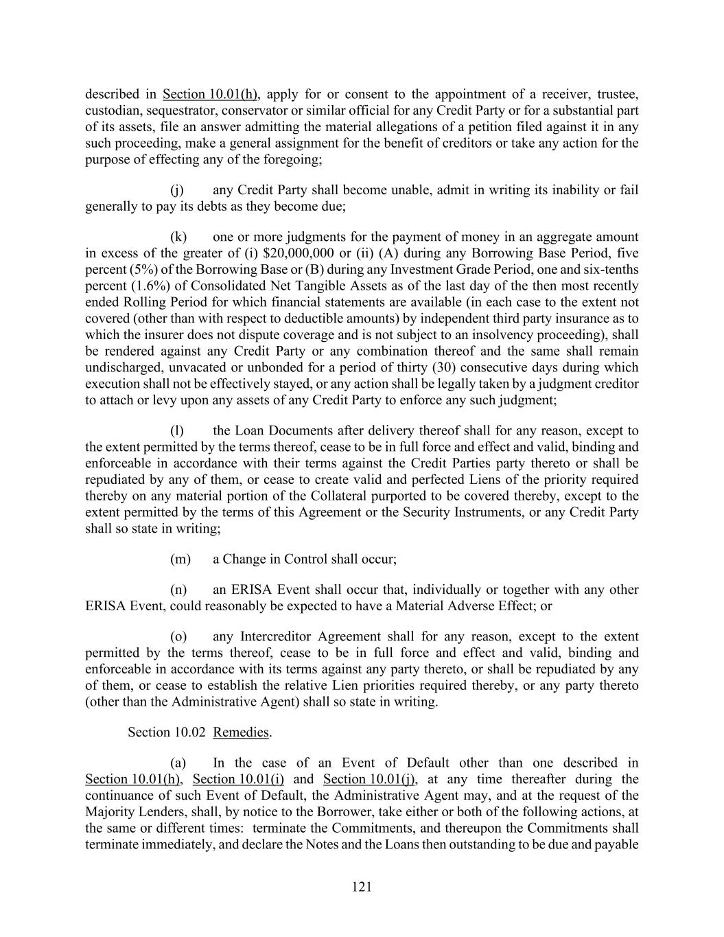 121 described in Section 10.01(h), apply for or consent to the appointment of a receiver, trustee, custodian, sequestrator, conservator or similar official for any Credit Party or for a substantial part of its assets, file an answer admitting the material allegations of a petition filed against it in any such proceeding, make a general assignment for the benefit of creditors or take any action for the purpose of effecting any of the foregoing; (j) any Credit Party shall become unable, admit in writing its inability or fail generally to pay its debts as they become due; (k) one or more judgments for the payment of money in an aggregate amount in excess of the greater of (i) $20,000,000 or (ii) (A) during any Borrowing Base Period, five percent (5%) of the Borrowing Base or (B) during any Investment Grade Period, one and six-tenths percent (1.6%) of Consolidated Net Tangible Assets as of the last day of the then most recently ended Rolling Period for which financial statements are available (in each case to the extent not covered (other than with respect to deductible amounts) by independent third party insurance as to which the insurer does not dispute coverage and is not subject to an insolvency proceeding), shall be rendered against any Credit Party or any combination thereof and the same shall remain undischarged, unvacated or unbonded for a period of thirty (30) consecutive days during which execution shall not be effectively stayed, or any action shall be legally taken by a judgment creditor to attach or levy upon any assets of any Credit Party to enforce any such judgment; (l) the Loan Documents after delivery thereof shall for any reason, except to the extent permitted by the terms thereof, cease to be in full force and effect and valid, binding and enforceable in accordance with their terms against the Credit Parties party thereto or shall be repudiated by any of them, or cease to create valid and perfected Liens of the priority required thereby on any material portion of the Collateral purported to be covered thereby, except to the extent permitted by the terms of this Agreement or the Security Instruments, or any Credit Party shall so state in writing; (m) a Change in Control shall occur; (n) an ERISA Event shall occur that, individually or together with any other ERISA Event, could reasonably be expected to have a Material Adverse Effect; or (o) any Intercreditor Agreement shall for any reason, except to the extent permitted by the terms thereof, cease to be in full force and effect and valid, binding and enforceable in accordance with its terms against any party thereto, or shall be repudiated by any of them, or cease to establish the relative Lien priorities required thereby, or any party thereto (other than the Administrative Agent) shall so state in writing. Section 10.02 Remedies. (a) In the case of an Event of Default other than one described in Section 10.01(h), Section 10.01(i) and Section 10.01(j), at any time thereafter during the continuance of such Event of Default, the Administrative Agent may, and at the request of the Majority Lenders, shall, by notice to the Borrower, take either or both of the following actions, at the same or different times: terminate the Commitments, and thereupon the Commitments shall terminate immediately, and declare the Notes and the Loans then outstanding to be due and payable