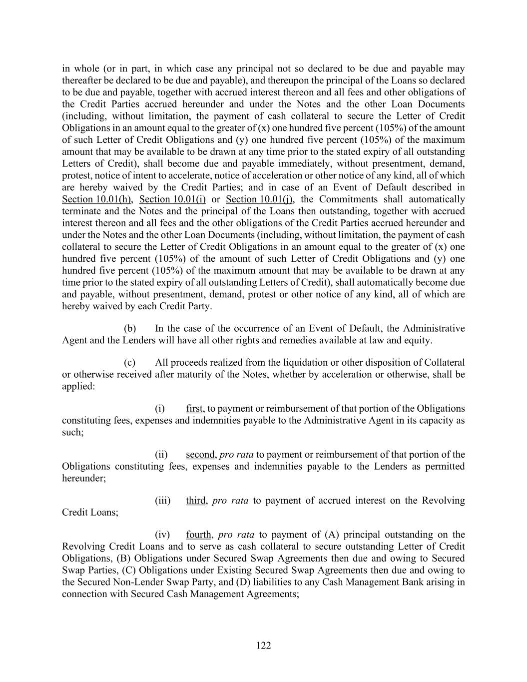 122 in whole (or in part, in which case any principal not so declared to be due and payable may thereafter be declared to be due and payable), and thereupon the principal of the Loans so declared to be due and payable, together with accrued interest thereon and all fees and other obligations of the Credit Parties accrued hereunder and under the Notes and the other Loan Documents (including, without limitation, the payment of cash collateral to secure the Letter of Credit Obligations in an amount equal to the greater of (x) one hundred five percent (105%) of the amount of such Letter of Credit Obligations and (y) one hundred five percent (105%) of the maximum amount that may be available to be drawn at any time prior to the stated expiry of all outstanding Letters of Credit), shall become due and payable immediately, without presentment, demand, protest, notice of intent to accelerate, notice of acceleration or other notice of any kind, all of which are hereby waived by the Credit Parties; and in case of an Event of Default described in Section 10.01(h), Section 10.01(i) or Section 10.01(j), the Commitments shall automatically terminate and the Notes and the principal of the Loans then outstanding, together with accrued interest thereon and all fees and the other obligations of the Credit Parties accrued hereunder and under the Notes and the other Loan Documents (including, without limitation, the payment of cash collateral to secure the Letter of Credit Obligations in an amount equal to the greater of (x) one hundred five percent (105%) of the amount of such Letter of Credit Obligations and (y) one hundred five percent (105%) of the maximum amount that may be available to be drawn at any time prior to the stated expiry of all outstanding Letters of Credit), shall automatically become due and payable, without presentment, demand, protest or other notice of any kind, all of which are hereby waived by each Credit Party. (b) In the case of the occurrence of an Event of Default, the Administrative Agent and the Lenders will have all other rights and remedies available at law and equity. (c) All proceeds realized from the liquidation or other disposition of Collateral or otherwise received after maturity of the Notes, whether by acceleration or otherwise, shall be applied: (i) first, to payment or reimbursement of that portion of the Obligations constituting fees, expenses and indemnities payable to the Administrative Agent in its capacity as such; (ii) second, pro rata to payment or reimbursement of that portion of the Obligations constituting fees, expenses and indemnities payable to the Lenders as permitted hereunder; (iii) third, pro rata to payment of accrued interest on the Revolving Credit Loans; (iv) fourth, pro rata to payment of (A) principal outstanding on the Revolving Credit Loans and to serve as cash collateral to secure outstanding Letter of Credit Obligations, (B) Obligations under Secured Swap Agreements then due and owing to Secured Swap Parties, (C) Obligations under Existing Secured Swap Agreements then due and owing to the Secured Non-Lender Swap Party, and (D) liabilities to any Cash Management Bank arising in connection with Secured Cash Management Agreements;