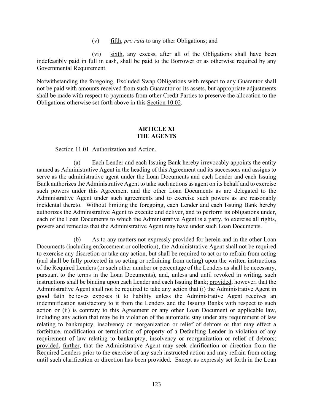 123 (v) fifth, pro rata to any other Obligations; and (vi) sixth, any excess, after all of the Obligations shall have been indefeasibly paid in full in cash, shall be paid to the Borrower or as otherwise required by any Governmental Requirement. Notwithstanding the foregoing, Excluded Swap Obligations with respect to any Guarantor shall not be paid with amounts received from such Guarantor or its assets, but appropriate adjustments shall be made with respect to payments from other Credit Parties to preserve the allocation to the Obligations otherwise set forth above in this Section 10.02. ARTICLE XI THE AGENTS Section 11.01 Authorization and Action. (a) Each Lender and each Issuing Bank hereby irrevocably appoints the entity named as Administrative Agent in the heading of this Agreement and its successors and assigns to serve as the administrative agent under the Loan Documents and each Lender and each Issuing Bank authorizes the Administrative Agent to take such actions as agent on its behalf and to exercise such powers under this Agreement and the other Loan Documents as are delegated to the Administrative Agent under such agreements and to exercise such powers as are reasonably incidental thereto. Without limiting the foregoing, each Lender and each Issuing Bank hereby authorizes the Administrative Agent to execute and deliver, and to perform its obligations under, each of the Loan Documents to which the Administrative Agent is a party, to exercise all rights, powers and remedies that the Administrative Agent may have under such Loan Documents. (b) As to any matters not expressly provided for herein and in the other Loan Documents (including enforcement or collection), the Administrative Agent shall not be required to exercise any discretion or take any action, but shall be required to act or to refrain from acting (and shall be fully protected in so acting or refraining from acting) upon the written instructions of the Required Lenders (or such other number or percentage of the Lenders as shall be necessary, pursuant to the terms in the Loan Documents), and, unless and until revoked in writing, such instructions shall be binding upon each Lender and each Issuing Bank; provided, however, that the Administrative Agent shall not be required to take any action that (i) the Administrative Agent in good faith believes exposes it to liability unless the Administrative Agent receives an indemnification satisfactory to it from the Lenders and the Issuing Banks with respect to such action or (ii) is contrary to this Agreement or any other Loan Document or applicable law, including any action that may be in violation of the automatic stay under any requirement of law relating to bankruptcy, insolvency or reorganization or relief of debtors or that may effect a forfeiture, modification or termination of property of a Defaulting Lender in violation of any requirement of law relating to bankruptcy, insolvency or reorganization or relief of debtors; provided, further, that the Administrative Agent may seek clarification or direction from the Required Lenders prior to the exercise of any such instructed action and may refrain from acting until such clarification or direction has been provided. Except as expressly set forth in the Loan