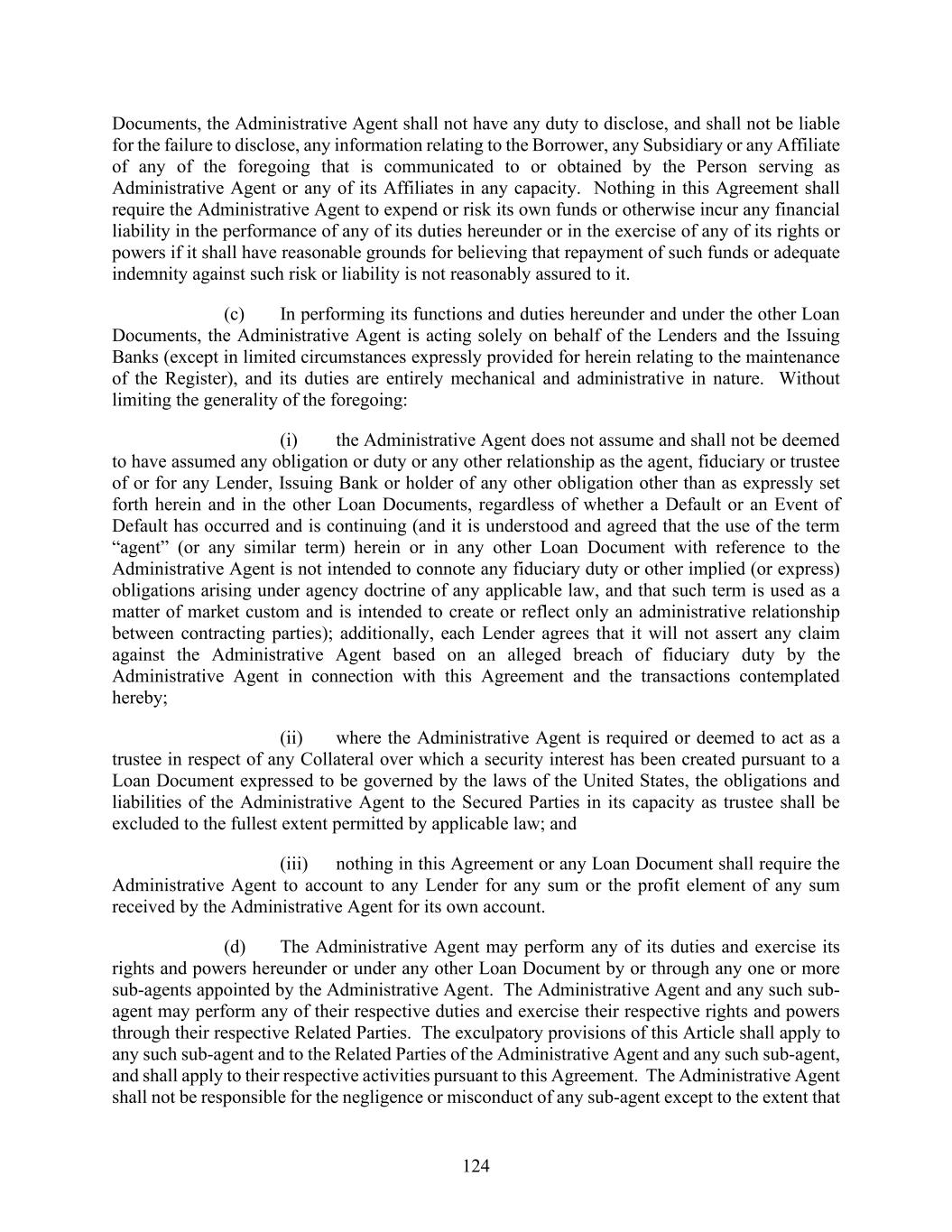 124 Documents, the Administrative Agent shall not have any duty to disclose, and shall not be liable for the failure to disclose, any information relating to the Borrower, any Subsidiary or any Affiliate of any of the foregoing that is communicated to or obtained by the Person serving as Administrative Agent or any of its Affiliates in any capacity. Nothing in this Agreement shall require the Administrative Agent to expend or risk its own funds or otherwise incur any financial liability in the performance of any of its duties hereunder or in the exercise of any of its rights or powers if it shall have reasonable grounds for believing that repayment of such funds or adequate indemnity against such risk or liability is not reasonably assured to it. (c) In performing its functions and duties hereunder and under the other Loan Documents, the Administrative Agent is acting solely on behalf of the Lenders and the Issuing Banks (except in limited circumstances expressly provided for herein relating to the maintenance of the Register), and its duties are entirely mechanical and administrative in nature. Without limiting the generality of the foregoing: (i) the Administrative Agent does not assume and shall not be deemed to have assumed any obligation or duty or any other relationship as the agent, fiduciary or trustee of or for any Lender, Issuing Bank or holder of any other obligation other than as expressly set forth herein and in the other Loan Documents, regardless of whether a Default or an Event of Default has occurred and is continuing (and it is understood and agreed that the use of the term “agent” (or any similar term) herein or in any other Loan Document with reference to the Administrative Agent is not intended to connote any fiduciary duty or other implied (or express) obligations arising under agency doctrine of any applicable law, and that such term is used as a matter of market custom and is intended to create or reflect only an administrative relationship between contracting parties); additionally, each Lender agrees that it will not assert any claim against the Administrative Agent based on an alleged breach of fiduciary duty by the Administrative Agent in connection with this Agreement and the transactions contemplated hereby; (ii) where the Administrative Agent is required or deemed to act as a trustee in respect of any Collateral over which a security interest has been created pursuant to a Loan Document expressed to be governed by the laws of the United States, the obligations and liabilities of the Administrative Agent to the Secured Parties in its capacity as trustee shall be excluded to the fullest extent permitted by applicable law; and (iii) nothing in this Agreement or any Loan Document shall require the Administrative Agent to account to any Lender for any sum or the profit element of any sum received by the Administrative Agent for its own account. (d) The Administrative Agent may perform any of its duties and exercise its rights and powers hereunder or under any other Loan Document by or through any one or more sub-agents appointed by the Administrative Agent. The Administrative Agent and any such sub- agent may perform any of their respective duties and exercise their respective rights and powers through their respective Related Parties. The exculpatory provisions of this Article shall apply to any such sub-agent and to the Related Parties of the Administrative Agent and any such sub-agent, and shall apply to their respective activities pursuant to this Agreement. The Administrative Agent shall not be responsible for the negligence or misconduct of any sub-agent except to the extent that