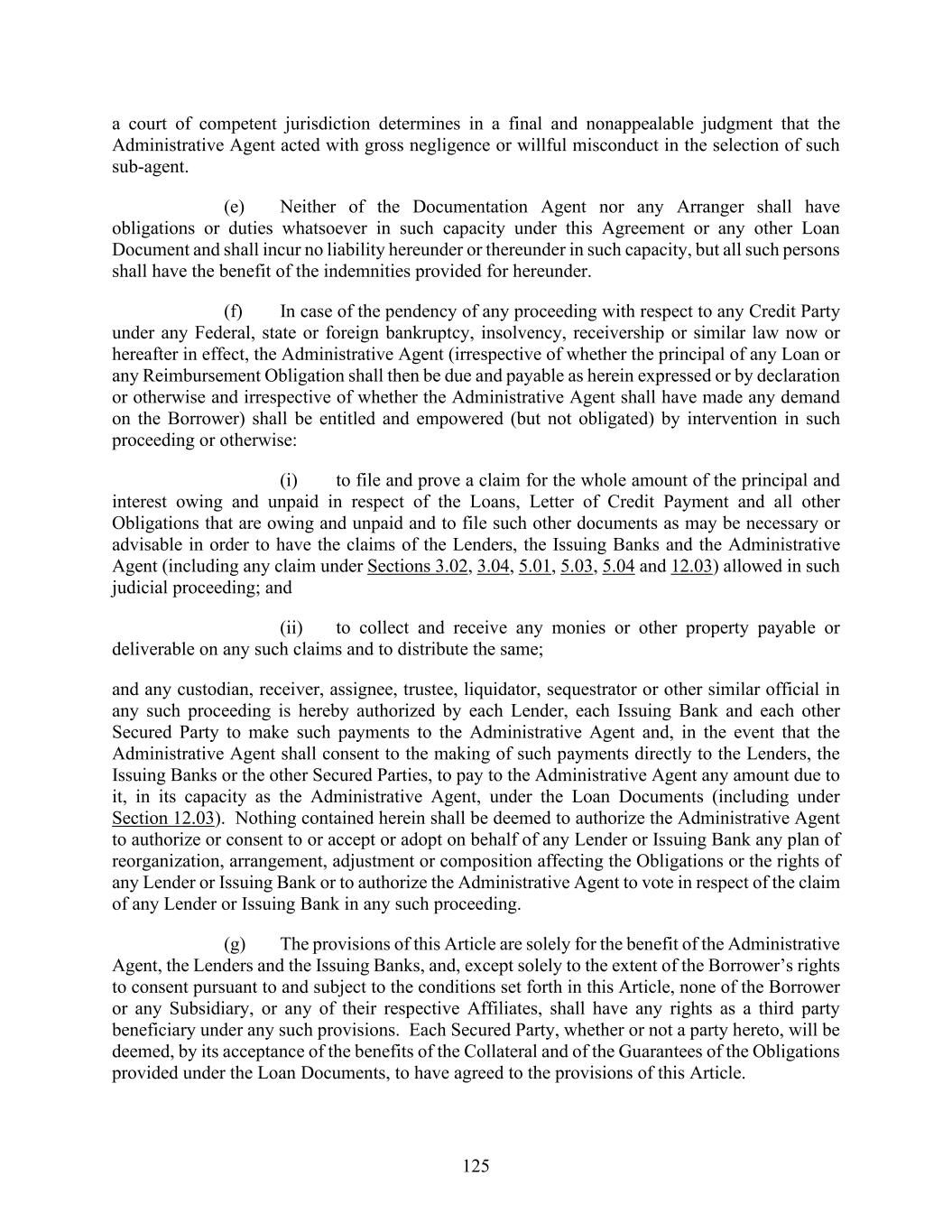 125 a court of competent jurisdiction determines in a final and nonappealable judgment that the Administrative Agent acted with gross negligence or willful misconduct in the selection of such sub-agent. (e) Neither of the Documentation Agent nor any Arranger shall have obligations or duties whatsoever in such capacity under this Agreement or any other Loan Document and shall incur no liability hereunder or thereunder in such capacity, but all such persons shall have the benefit of the indemnities provided for hereunder. (f) In case of the pendency of any proceeding with respect to any Credit Party under any Federal, state or foreign bankruptcy, insolvency, receivership or similar law now or hereafter in effect, the Administrative Agent (irrespective of whether the principal of any Loan or any Reimbursement Obligation shall then be due and payable as herein expressed or by declaration or otherwise and irrespective of whether the Administrative Agent shall have made any demand on the Borrower) shall be entitled and empowered (but not obligated) by intervention in such proceeding or otherwise: (i) to file and prove a claim for the whole amount of the principal and interest owing and unpaid in respect of the Loans, Letter of Credit Payment and all other Obligations that are owing and unpaid and to file such other documents as may be necessary or advisable in order to have the claims of the Lenders, the Issuing Banks and the Administrative Agent (including any claim under Sections 3.02, 3.04, 5.01, 5.03, 5.04 and 12.03) allowed in such judicial proceeding; and (ii) to collect and receive any monies or other property payable or deliverable on any such claims and to distribute the same; and any custodian, receiver, assignee, trustee, liquidator, sequestrator or other similar official in any such proceeding is hereby authorized by each Lender, each Issuing Bank and each other Secured Party to make such payments to the Administrative Agent and, in the event that the Administrative Agent shall consent to the making of such payments directly to the Lenders, the Issuing Banks or the other Secured Parties, to pay to the Administrative Agent any amount due to it, in its capacity as the Administrative Agent, under the Loan Documents (including under Section 12.03). Nothing contained herein shall be deemed to authorize the Administrative Agent to authorize or consent to or accept or adopt on behalf of any Lender or Issuing Bank any plan of reorganization, arrangement, adjustment or composition affecting the Obligations or the rights of any Lender or Issuing Bank or to authorize the Administrative Agent to vote in respect of the claim of any Lender or Issuing Bank in any such proceeding. (g) The provisions of this Article are solely for the benefit of the Administrative Agent, the Lenders and the Issuing Banks, and, except solely to the extent of the Borrower’s rights to consent pursuant to and subject to the conditions set forth in this Article, none of the Borrower or any Subsidiary, or any of their respective Affiliates, shall have any rights as a third party beneficiary under any such provisions. Each Secured Party, whether or not a party hereto, will be deemed, by its acceptance of the benefits of the Collateral and of the Guarantees of the Obligations provided under the Loan Documents, to have agreed to the provisions of this Article.