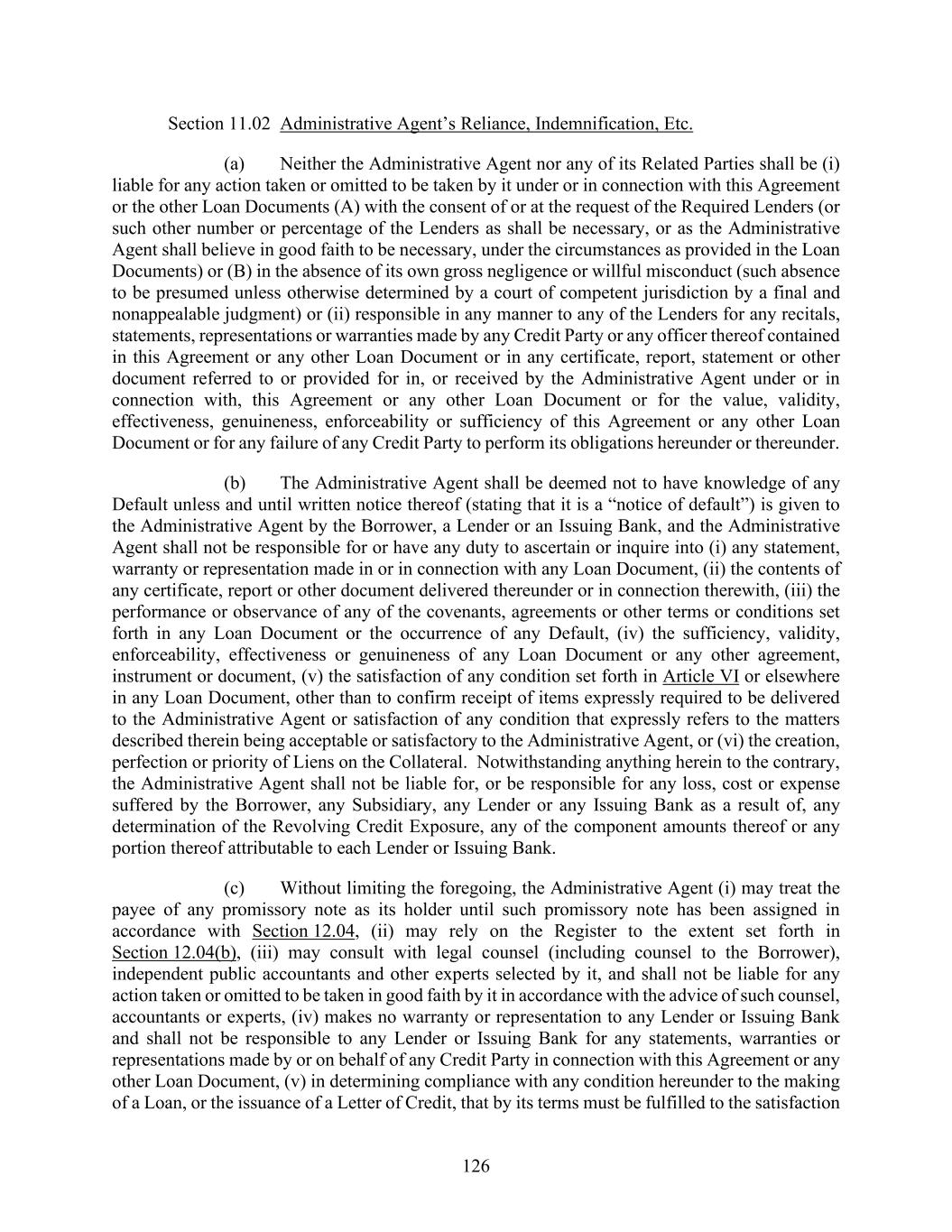 126 Section 11.02 Administrative Agent’s Reliance, Indemnification, Etc. (a) Neither the Administrative Agent nor any of its Related Parties shall be (i) liable for any action taken or omitted to be taken by it under or in connection with this Agreement or the other Loan Documents (A) with the consent of or at the request of the Required Lenders (or such other number or percentage of the Lenders as shall be necessary, or as the Administrative Agent shall believe in good faith to be necessary, under the circumstances as provided in the Loan Documents) or (B) in the absence of its own gross negligence or willful misconduct (such absence to be presumed unless otherwise determined by a court of competent jurisdiction by a final and nonappealable judgment) or (ii) responsible in any manner to any of the Lenders for any recitals, statements, representations or warranties made by any Credit Party or any officer thereof contained in this Agreement or any other Loan Document or in any certificate, report, statement or other document referred to or provided for in, or received by the Administrative Agent under or in connection with, this Agreement or any other Loan Document or for the value, validity, effectiveness, genuineness, enforceability or sufficiency of this Agreement or any other Loan Document or for any failure of any Credit Party to perform its obligations hereunder or thereunder. (b) The Administrative Agent shall be deemed not to have knowledge of any Default unless and until written notice thereof (stating that it is a “notice of default”) is given to the Administrative Agent by the Borrower, a Lender or an Issuing Bank, and the Administrative Agent shall not be responsible for or have any duty to ascertain or inquire into (i) any statement, warranty or representation made in or in connection with any Loan Document, (ii) the contents of any certificate, report or other document delivered thereunder or in connection therewith, (iii) the performance or observance of any of the covenants, agreements or other terms or conditions set forth in any Loan Document or the occurrence of any Default, (iv) the sufficiency, validity, enforceability, effectiveness or genuineness of any Loan Document or any other agreement, instrument or document, (v) the satisfaction of any condition set forth in Article VI or elsewhere in any Loan Document, other than to confirm receipt of items expressly required to be delivered to the Administrative Agent or satisfaction of any condition that expressly refers to the matters described therein being acceptable or satisfactory to the Administrative Agent, or (vi) the creation, perfection or priority of Liens on the Collateral. Notwithstanding anything herein to the contrary, the Administrative Agent shall not be liable for, or be responsible for any loss, cost or expense suffered by the Borrower, any Subsidiary, any Lender or any Issuing Bank as a result of, any determination of the Revolving Credit Exposure, any of the component amounts thereof or any portion thereof attributable to each Lender or Issuing Bank. (c) Without limiting the foregoing, the Administrative Agent (i) may treat the payee of any promissory note as its holder until such promissory note has been assigned in accordance with Section 12.04, (ii) may rely on the Register to the extent set forth in Section 12.04(b), (iii) may consult with legal counsel (including counsel to the Borrower), independent public accountants and other experts selected by it, and shall not be liable for any action taken or omitted to be taken in good faith by it in accordance with the advice of such counsel, accountants or experts, (iv) makes no warranty or representation to any Lender or Issuing Bank and shall not be responsible to any Lender or Issuing Bank for any statements, warranties or representations made by or on behalf of any Credit Party in connection with this Agreement or any other Loan Document, (v) in determining compliance with any condition hereunder to the making of a Loan, or the issuance of a Letter of Credit, that by its terms must be fulfilled to the satisfaction