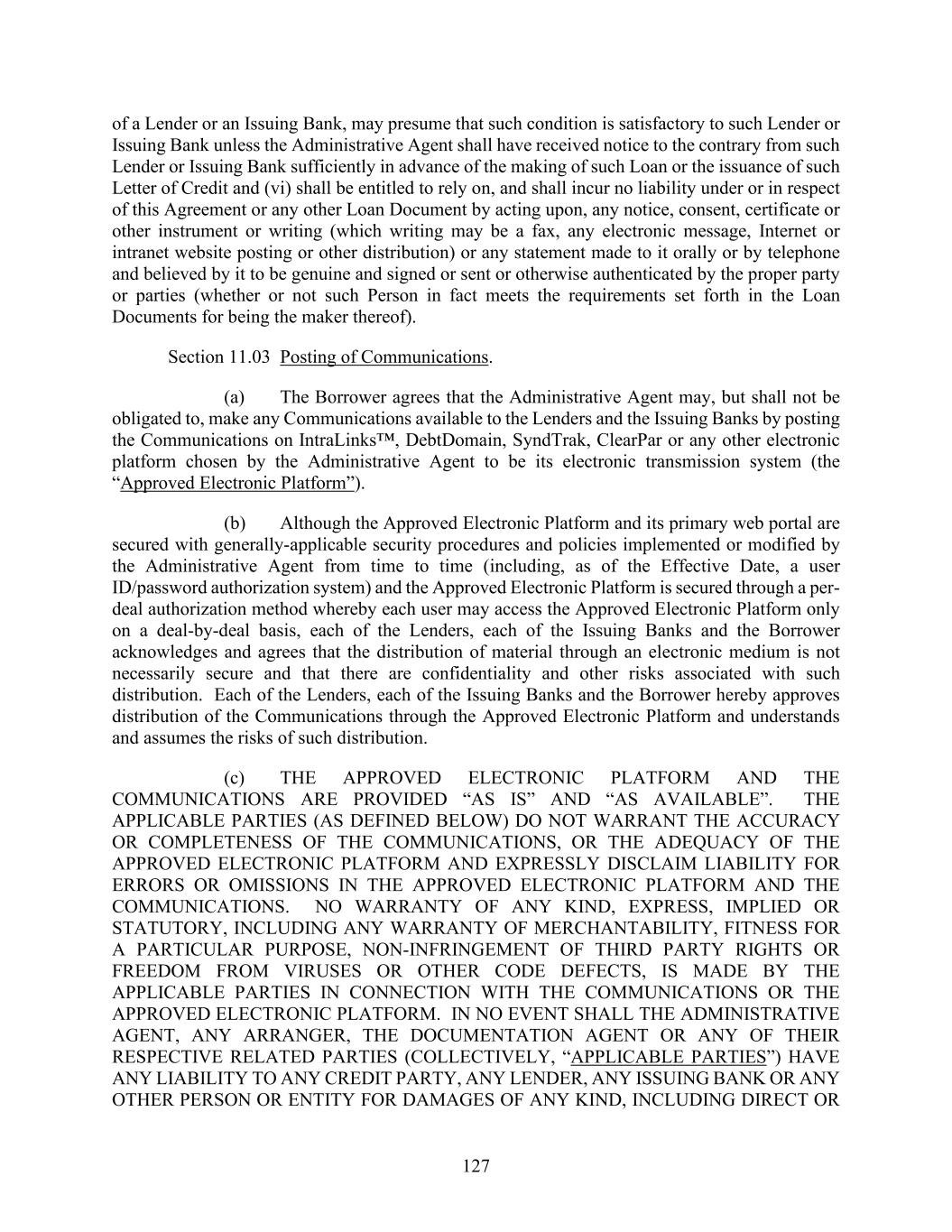 127 of a Lender or an Issuing Bank, may presume that such condition is satisfactory to such Lender or Issuing Bank unless the Administrative Agent shall have received notice to the contrary from such Lender or Issuing Bank sufficiently in advance of the making of such Loan or the issuance of such Letter of Credit and (vi) shall be entitled to rely on, and shall incur no liability under or in respect of this Agreement or any other Loan Document by acting upon, any notice, consent, certificate or other instrument or writing (which writing may be a fax, any electronic message, Internet or intranet website posting or other distribution) or any statement made to it orally or by telephone and believed by it to be genuine and signed or sent or otherwise authenticated by the proper party or parties (whether or not such Person in fact meets the requirements set forth in the Loan Documents for being the maker thereof). Section 11.03 Posting of Communications. (a) The Borrower agrees that the Administrative Agent may, but shall not be obligated to, make any Communications available to the Lenders and the Issuing Banks by posting the Communications on IntraLinks™, DebtDomain, SyndTrak, ClearPar or any other electronic platform chosen by the Administrative Agent to be its electronic transmission system (the “Approved Electronic Platform”). (b) Although the Approved Electronic Platform and its primary web portal are secured with generally-applicable security procedures and policies implemented or modified by the Administrative Agent from time to time (including, as of the Effective Date, a user ID/password authorization system) and the Approved Electronic Platform is secured through a per- deal authorization method whereby each user may access the Approved Electronic Platform only on a deal-by-deal basis, each of the Lenders, each of the Issuing Banks and the Borrower acknowledges and agrees that the distribution of material through an electronic medium is not necessarily secure and that there are confidentiality and other risks associated with such distribution. Each of the Lenders, each of the Issuing Banks and the Borrower hereby approves distribution of the Communications through the Approved Electronic Platform and understands and assumes the risks of such distribution. (c) THE APPROVED ELECTRONIC PLATFORM AND THE COMMUNICATIONS ARE PROVIDED “AS IS” AND “AS AVAILABLE”. THE APPLICABLE PARTIES (AS DEFINED BELOW) DO NOT WARRANT THE ACCURACY OR COMPLETENESS OF THE COMMUNICATIONS, OR THE ADEQUACY OF THE APPROVED ELECTRONIC PLATFORM AND EXPRESSLY DISCLAIM LIABILITY FOR ERRORS OR OMISSIONS IN THE APPROVED ELECTRONIC PLATFORM AND THE COMMUNICATIONS. NO WARRANTY OF ANY KIND, EXPRESS, IMPLIED OR STATUTORY, INCLUDING ANY WARRANTY OF MERCHANTABILITY, FITNESS FOR A PARTICULAR PURPOSE, NON-INFRINGEMENT OF THIRD PARTY RIGHTS OR FREEDOM FROM VIRUSES OR OTHER CODE DEFECTS, IS MADE BY THE APPLICABLE PARTIES IN CONNECTION WITH THE COMMUNICATIONS OR THE APPROVED ELECTRONIC PLATFORM. IN NO EVENT SHALL THE ADMINISTRATIVE AGENT, ANY ARRANGER, THE DOCUMENTATION AGENT OR ANY OF THEIR RESPECTIVE RELATED PARTIES (COLLECTIVELY, “APPLICABLE PARTIES”) HAVE ANY LIABILITY TO ANY CREDIT PARTY, ANY LENDER, ANY ISSUING BANK OR ANY OTHER PERSON OR ENTITY FOR DAMAGES OF ANY KIND, INCLUDING DIRECT OR