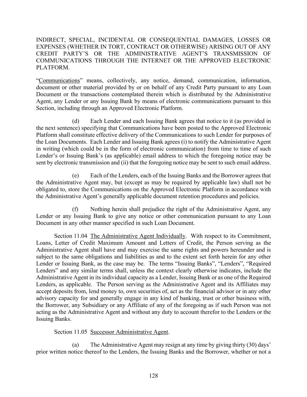 128 INDIRECT, SPECIAL, INCIDENTAL OR CONSEQUENTIAL DAMAGES, LOSSES OR EXPENSES (WHETHER IN TORT, CONTRACT OR OTHERWISE) ARISING OUT OF ANY CREDIT PARTY’S OR THE ADMINISTRATIVE AGENT’S TRANSMISSION OF COMMUNICATIONS THROUGH THE INTERNET OR THE APPROVED ELECTRONIC PLATFORM. “Communications” means, collectively, any notice, demand, communication, information, document or other material provided by or on behalf of any Credit Party pursuant to any Loan Document or the transactions contemplated therein which is distributed by the Administrative Agent, any Lender or any Issuing Bank by means of electronic communications pursuant to this Section, including through an Approved Electronic Platform. (d) Each Lender and each Issuing Bank agrees that notice to it (as provided in the next sentence) specifying that Communications have been posted to the Approved Electronic Platform shall constitute effective delivery of the Communications to such Lender for purposes of the Loan Documents. Each Lender and Issuing Bank agrees (i) to notify the Administrative Agent in writing (which could be in the form of electronic communication) from time to time of such Lender’s or Issuing Bank’s (as applicable) email address to which the foregoing notice may be sent by electronic transmission and (ii) that the foregoing notice may be sent to such email address. (e) Each of the Lenders, each of the Issuing Banks and the Borrower agrees that the Administrative Agent may, but (except as may be required by applicable law) shall not be obligated to, store the Communications on the Approved Electronic Platform in accordance with the Administrative Agent’s generally applicable document retention procedures and policies. (f) Nothing herein shall prejudice the right of the Administrative Agent, any Lender or any Issuing Bank to give any notice or other communication pursuant to any Loan Document in any other manner specified in such Loan Document. Section 11.04 The Administrative Agent Individually. With respect to its Commitment, Loans, Letter of Credit Maximum Amount and Letters of Credit, the Person serving as the Administrative Agent shall have and may exercise the same rights and powers hereunder and is subject to the same obligations and liabilities as and to the extent set forth herein for any other Lender or Issuing Bank, as the case may be. The terms “Issuing Banks”, “Lenders”, “Required Lenders” and any similar terms shall, unless the context clearly otherwise indicates, include the Administrative Agent in its individual capacity as a Lender, Issuing Bank or as one of the Required Lenders, as applicable. The Person serving as the Administrative Agent and its Affiliates may accept deposits from, lend money to, own securities of, act as the financial advisor or in any other advisory capacity for and generally engage in any kind of banking, trust or other business with, the Borrower, any Subsidiary or any Affiliate of any of the foregoing as if such Person was not acting as the Administrative Agent and without any duty to account therefor to the Lenders or the Issuing Banks. Section 11.05 Successor Administrative Agent. (a) The Administrative Agent may resign at any time by giving thirty (30) days’ prior written notice thereof to the Lenders, the Issuing Banks and the Borrower, whether or not a