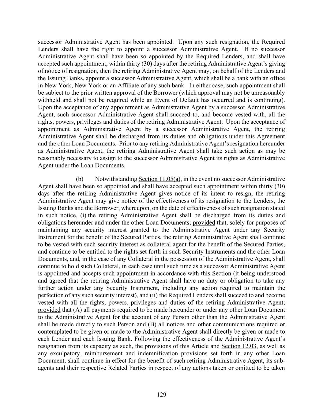 129 successor Administrative Agent has been appointed. Upon any such resignation, the Required Lenders shall have the right to appoint a successor Administrative Agent. If no successor Administrative Agent shall have been so appointed by the Required Lenders, and shall have accepted such appointment, within thirty (30) days after the retiring Administrative Agent’s giving of notice of resignation, then the retiring Administrative Agent may, on behalf of the Lenders and the Issuing Banks, appoint a successor Administrative Agent, which shall be a bank with an office in New York, New York or an Affiliate of any such bank. In either case, such appointment shall be subject to the prior written approval of the Borrower (which approval may not be unreasonably withheld and shall not be required while an Event of Default has occurred and is continuing). Upon the acceptance of any appointment as Administrative Agent by a successor Administrative Agent, such successor Administrative Agent shall succeed to, and become vested with, all the rights, powers, privileges and duties of the retiring Administrative Agent. Upon the acceptance of appointment as Administrative Agent by a successor Administrative Agent, the retiring Administrative Agent shall be discharged from its duties and obligations under this Agreement and the other Loan Documents. Prior to any retiring Administrative Agent’s resignation hereunder as Administrative Agent, the retiring Administrative Agent shall take such action as may be reasonably necessary to assign to the successor Administrative Agent its rights as Administrative Agent under the Loan Documents. (b) Notwithstanding Section 11.05(a), in the event no successor Administrative Agent shall have been so appointed and shall have accepted such appointment within thirty (30) days after the retiring Administrative Agent gives notice of its intent to resign, the retiring Administrative Agent may give notice of the effectiveness of its resignation to the Lenders, the Issuing Banks and the Borrower, whereupon, on the date of effectiveness of such resignation stated in such notice, (i) the retiring Administrative Agent shall be discharged from its duties and obligations hereunder and under the other Loan Documents; provided that, solely for purposes of maintaining any security interest granted to the Administrative Agent under any Security Instrument for the benefit of the Secured Parties, the retiring Administrative Agent shall continue to be vested with such security interest as collateral agent for the benefit of the Secured Parties, and continue to be entitled to the rights set forth in such Security Instruments and the other Loan Documents, and, in the case of any Collateral in the possession of the Administrative Agent, shall continue to hold such Collateral, in each case until such time as a successor Administrative Agent is appointed and accepts such appointment in accordance with this Section (it being understood and agreed that the retiring Administrative Agent shall have no duty or obligation to take any further action under any Security Instrument, including any action required to maintain the perfection of any such security interest), and (ii) the Required Lenders shall succeed to and become vested with all the rights, powers, privileges and duties of the retiring Administrative Agent; provided that (A) all payments required to be made hereunder or under any other Loan Document to the Administrative Agent for the account of any Person other than the Administrative Agent shall be made directly to such Person and (B) all notices and other communications required or contemplated to be given or made to the Administrative Agent shall directly be given or made to each Lender and each Issuing Bank. Following the effectiveness of the Administrative Agent’s resignation from its capacity as such, the provisions of this Article and Section 12.03, as well as any exculpatory, reimbursement and indemnification provisions set forth in any other Loan Document, shall continue in effect for the benefit of such retiring Administrative Agent, its sub- agents and their respective Related Parties in respect of any actions taken or omitted to be taken