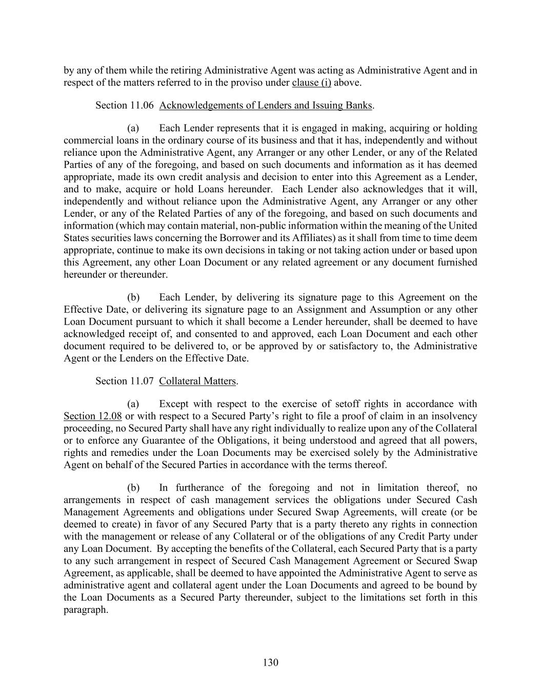 130 by any of them while the retiring Administrative Agent was acting as Administrative Agent and in respect of the matters referred to in the proviso under clause (i) above. Section 11.06 Acknowledgements of Lenders and Issuing Banks. (a) Each Lender represents that it is engaged in making, acquiring or holding commercial loans in the ordinary course of its business and that it has, independently and without reliance upon the Administrative Agent, any Arranger or any other Lender, or any of the Related Parties of any of the foregoing, and based on such documents and information as it has deemed appropriate, made its own credit analysis and decision to enter into this Agreement as a Lender, and to make, acquire or hold Loans hereunder. Each Lender also acknowledges that it will, independently and without reliance upon the Administrative Agent, any Arranger or any other Lender, or any of the Related Parties of any of the foregoing, and based on such documents and information (which may contain material, non-public information within the meaning of the United States securities laws concerning the Borrower and its Affiliates) as it shall from time to time deem appropriate, continue to make its own decisions in taking or not taking action under or based upon this Agreement, any other Loan Document or any related agreement or any document furnished hereunder or thereunder. (b) Each Lender, by delivering its signature page to this Agreement on the Effective Date, or delivering its signature page to an Assignment and Assumption or any other Loan Document pursuant to which it shall become a Lender hereunder, shall be deemed to have acknowledged receipt of, and consented to and approved, each Loan Document and each other document required to be delivered to, or be approved by or satisfactory to, the Administrative Agent or the Lenders on the Effective Date. Section 11.07 Collateral Matters. (a) Except with respect to the exercise of setoff rights in accordance with Section 12.08 or with respect to a Secured Party’s right to file a proof of claim in an insolvency proceeding, no Secured Party shall have any right individually to realize upon any of the Collateral or to enforce any Guarantee of the Obligations, it being understood and agreed that all powers, rights and remedies under the Loan Documents may be exercised solely by the Administrative Agent on behalf of the Secured Parties in accordance with the terms thereof. (b) In furtherance of the foregoing and not in limitation thereof, no arrangements in respect of cash management services the obligations under Secured Cash Management Agreements and obligations under Secured Swap Agreements, will create (or be deemed to create) in favor of any Secured Party that is a party thereto any rights in connection with the management or release of any Collateral or of the obligations of any Credit Party under any Loan Document. By accepting the benefits of the Collateral, each Secured Party that is a party to any such arrangement in respect of Secured Cash Management Agreement or Secured Swap Agreement, as applicable, shall be deemed to have appointed the Administrative Agent to serve as administrative agent and collateral agent under the Loan Documents and agreed to be bound by the Loan Documents as a Secured Party thereunder, subject to the limitations set forth in this paragraph.