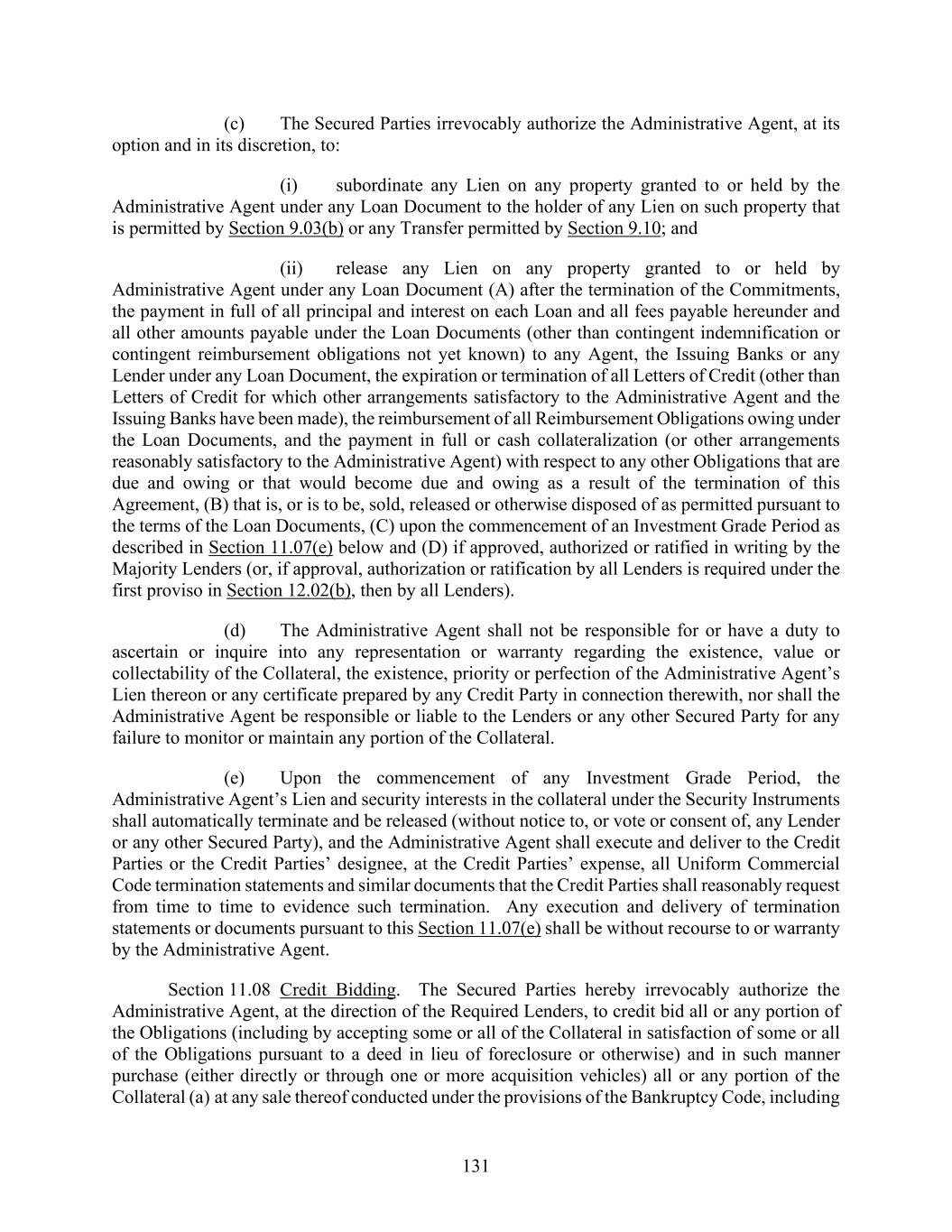 131 (c) The Secured Parties irrevocably authorize the Administrative Agent, at its option and in its discretion, to: (i) subordinate any Lien on any property granted to or held by the Administrative Agent under any Loan Document to the holder of any Lien on such property that is permitted by Section 9.03(b) or any Transfer permitted by Section 9.10; and (ii) release any Lien on any property granted to or held by Administrative Agent under any Loan Document (A) after the termination of the Commitments, the payment in full of all principal and interest on each Loan and all fees payable hereunder and all other amounts payable under the Loan Documents (other than contingent indemnification or contingent reimbursement obligations not yet known) to any Agent, the Issuing Banks or any Lender under any Loan Document, the expiration or termination of all Letters of Credit (other than Letters of Credit for which other arrangements satisfactory to the Administrative Agent and the Issuing Banks have been made), the reimbursement of all Reimbursement Obligations owing under the Loan Documents, and the payment in full or cash collateralization (or other arrangements reasonably satisfactory to the Administrative Agent) with respect to any other Obligations that are due and owing or that would become due and owing as a result of the termination of this Agreement, (B) that is, or is to be, sold, released or otherwise disposed of as permitted pursuant to the terms of the Loan Documents, (C) upon the commencement of an Investment Grade Period as described in Section 11.07(e) below and (D) if approved, authorized or ratified in writing by the Majority Lenders (or, if approval, authorization or ratification by all Lenders is required under the first proviso in Section 12.02(b), then by all Lenders). (d) The Administrative Agent shall not be responsible for or have a duty to ascertain or inquire into any representation or warranty regarding the existence, value or collectability of the Collateral, the existence, priority or perfection of the Administrative Agent’s Lien thereon or any certificate prepared by any Credit Party in connection therewith, nor shall the Administrative Agent be responsible or liable to the Lenders or any other Secured Party for any failure to monitor or maintain any portion of the Collateral. (e) Upon the commencement of any Investment Grade Period, the Administrative Agent’s Lien and security interests in the collateral under the Security Instruments shall automatically terminate and be released (without notice to, or vote or consent of, any Lender or any other Secured Party), and the Administrative Agent shall execute and deliver to the Credit Parties or the Credit Parties’ designee, at the Credit Parties’ expense, all Uniform Commercial Code termination statements and similar documents that the Credit Parties shall reasonably request from time to time to evidence such termination. Any execution and delivery of termination statements or documents pursuant to this Section 11.07(e) shall be without recourse to or warranty by the Administrative Agent. Section 11.08 Credit Bidding. The Secured Parties hereby irrevocably authorize the Administrative Agent, at the direction of the Required Lenders, to credit bid all or any portion of the Obligations (including by accepting some or all of the Collateral in satisfaction of some or all of the Obligations pursuant to a deed in lieu of foreclosure or otherwise) and in such manner purchase (either directly or through one or more acquisition vehicles) all or any portion of the Collateral (a) at any sale thereof conducted under the provisions of the Bankruptcy Code, including