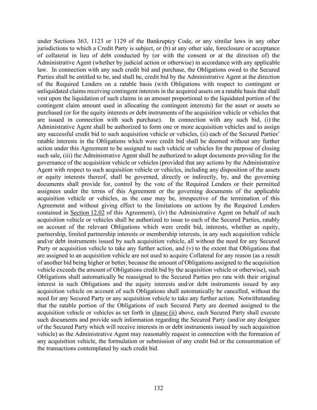 132 under Sections 363, 1123 or 1129 of the Bankruptcy Code, or any similar laws in any other jurisdictions to which a Credit Party is subject, or (b) at any other sale, foreclosure or acceptance of collateral in lieu of debt conducted by (or with the consent or at the direction of) the Administrative Agent (whether by judicial action or otherwise) in accordance with any applicable law. In connection with any such credit bid and purchase, the Obligations owed to the Secured Parties shall be entitled to be, and shall be, credit bid by the Administrative Agent at the direction of the Required Lenders on a ratable basis (with Obligations with respect to contingent or unliquidated claims receiving contingent interests in the acquired assets on a ratable basis that shall vest upon the liquidation of such claims in an amount proportional to the liquidated portion of the contingent claim amount used in allocating the contingent interests) for the asset or assets so purchased (or for the equity interests or debt instruments of the acquisition vehicle or vehicles that are issued in connection with such purchase). In connection with any such bid, (i) the Administrative Agent shall be authorized to form one or more acquisition vehicles and to assign any successful credit bid to such acquisition vehicle or vehicles, (ii) each of the Secured Parties’ ratable interests in the Obligations which were credit bid shall be deemed without any further action under this Agreement to be assigned to such vehicle or vehicles for the purpose of closing such sale, (iii) the Administrative Agent shall be authorized to adopt documents providing for the governance of the acquisition vehicle or vehicles (provided that any actions by the Administrative Agent with respect to such acquisition vehicle or vehicles, including any disposition of the assets or equity interests thereof, shall be governed, directly or indirectly, by, and the governing documents shall provide for, control by the vote of the Required Lenders or their permitted assignees under the terms of this Agreement or the governing documents of the applicable acquisition vehicle or vehicles, as the case may be, irrespective of the termination of this Agreement and without giving effect to the limitations on actions by the Required Lenders contained in Section 12.02 of this Agreement), (iv) the Administrative Agent on behalf of such acquisition vehicle or vehicles shall be authorized to issue to each of the Secured Parties, ratably on account of the relevant Obligations which were credit bid, interests, whether as equity, partnership, limited partnership interests or membership interests, in any such acquisition vehicle and/or debt instruments issued by such acquisition vehicle, all without the need for any Secured Party or acquisition vehicle to take any further action, and (v) to the extent that Obligations that are assigned to an acquisition vehicle are not used to acquire Collateral for any reason (as a result of another bid being higher or better, because the amount of Obligations assigned to the acquisition vehicle exceeds the amount of Obligations credit bid by the acquisition vehicle or otherwise), such Obligations shall automatically be reassigned to the Secured Parties pro rata with their original interest in such Obligations and the equity interests and/or debt instruments issued by any acquisition vehicle on account of such Obligations shall automatically be cancelled, without the need for any Secured Party or any acquisition vehicle to take any further action. Notwithstanding that the ratable portion of the Obligations of each Secured Party are deemed assigned to the acquisition vehicle or vehicles as set forth in clause (ii) above, each Secured Party shall execute such documents and provide such information regarding the Secured Party (and/or any designee of the Secured Party which will receive interests in or debt instruments issued by such acquisition vehicle) as the Administrative Agent may reasonably request in connection with the formation of any acquisition vehicle, the formulation or submission of any credit bid or the consummation of the transactions contemplated by such credit bid.