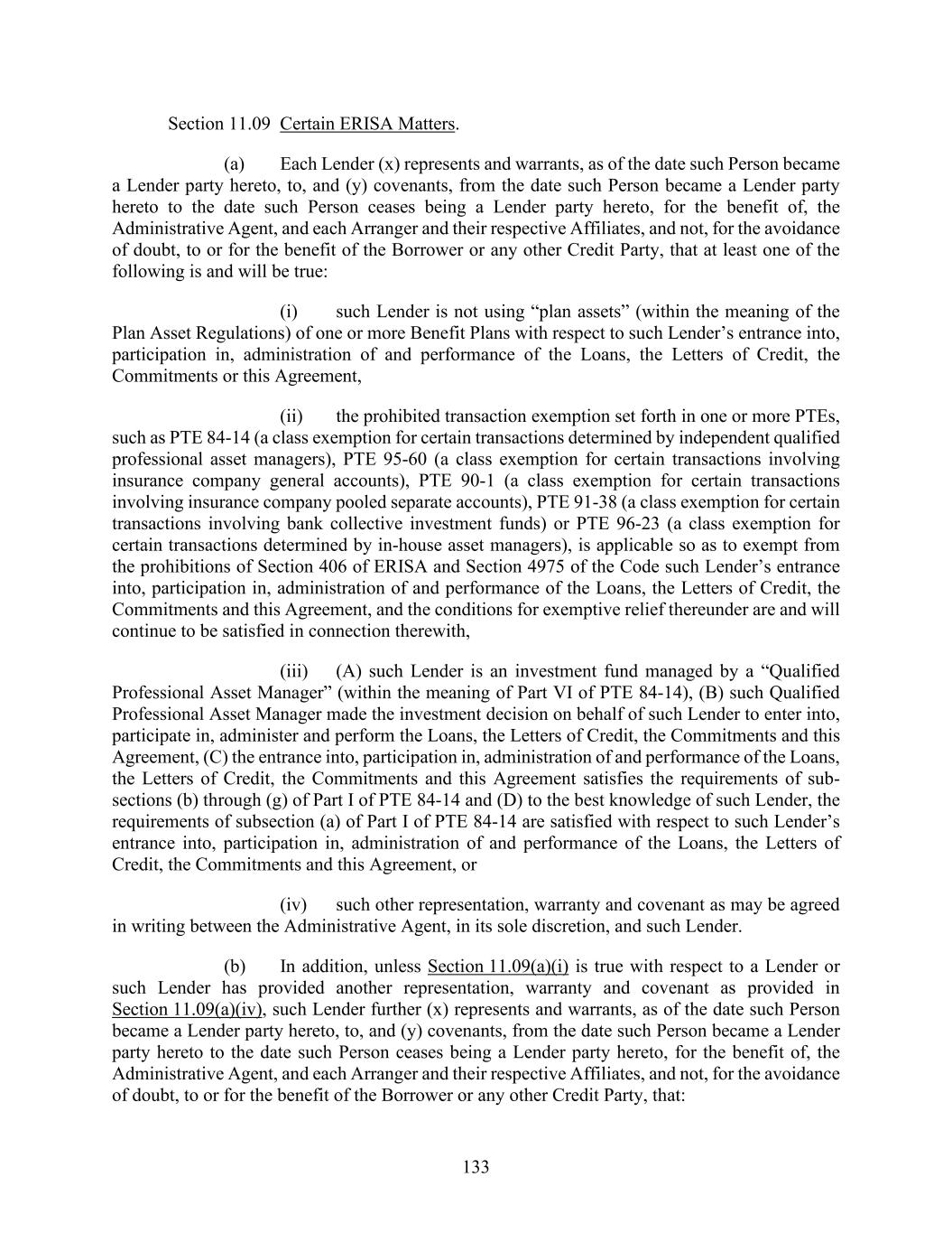 133 Section 11.09 Certain ERISA Matters. (a) Each Lender (x) represents and warrants, as of the date such Person became a Lender party hereto, to, and (y) covenants, from the date such Person became a Lender party hereto to the date such Person ceases being a Lender party hereto, for the benefit of, the Administrative Agent, and each Arranger and their respective Affiliates, and not, for the avoidance of doubt, to or for the benefit of the Borrower or any other Credit Party, that at least one of the following is and will be true: (i) such Lender is not using “plan assets” (within the meaning of the Plan Asset Regulations) of one or more Benefit Plans with respect to such Lender’s entrance into, participation in, administration of and performance of the Loans, the Letters of Credit, the Commitments or this Agreement, (ii) the prohibited transaction exemption set forth in one or more PTEs, such as PTE 84-14 (a class exemption for certain transactions determined by independent qualified professional asset managers), PTE 95-60 (a class exemption for certain transactions involving insurance company general accounts), PTE 90-1 (a class exemption for certain transactions involving insurance company pooled separate accounts), PTE 91-38 (a class exemption for certain transactions involving bank collective investment funds) or PTE 96-23 (a class exemption for certain transactions determined by in-house asset managers), is applicable so as to exempt from the prohibitions of Section 406 of ERISA and Section 4975 of the Code such Lender’s entrance into, participation in, administration of and performance of the Loans, the Letters of Credit, the Commitments and this Agreement, and the conditions for exemptive relief thereunder are and will continue to be satisfied in connection therewith, (iii) (A) such Lender is an investment fund managed by a “Qualified Professional Asset Manager” (within the meaning of Part VI of PTE 84-14), (B) such Qualified Professional Asset Manager made the investment decision on behalf of such Lender to enter into, participate in, administer and perform the Loans, the Letters of Credit, the Commitments and this Agreement, (C) the entrance into, participation in, administration of and performance of the Loans, the Letters of Credit, the Commitments and this Agreement satisfies the requirements of sub- sections (b) through (g) of Part I of PTE 84-14 and (D) to the best knowledge of such Lender, the requirements of subsection (a) of Part I of PTE 84-14 are satisfied with respect to such Lender’s entrance into, participation in, administration of and performance of the Loans, the Letters of Credit, the Commitments and this Agreement, or (iv) such other representation, warranty and covenant as may be agreed in writing between the Administrative Agent, in its sole discretion, and such Lender. (b) In addition, unless Section 11.09(a)(i) is true with respect to a Lender or such Lender has provided another representation, warranty and covenant as provided in Section 11.09(a)(iv), such Lender further (x) represents and warrants, as of the date such Person became a Lender party hereto, to, and (y) covenants, from the date such Person became a Lender party hereto to the date such Person ceases being a Lender party hereto, for the benefit of, the Administrative Agent, and each Arranger and their respective Affiliates, and not, for the avoidance of doubt, to or for the benefit of the Borrower or any other Credit Party, that: