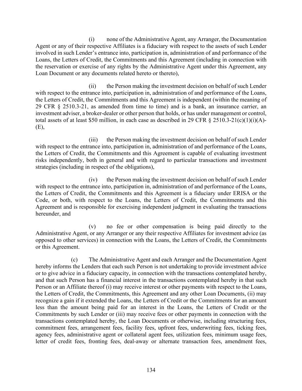 134 (i) none of the Administrative Agent, any Arranger, the Documentation Agent or any of their respective Affiliates is a fiduciary with respect to the assets of such Lender involved in such Lender’s entrance into, participation in, administration of and performance of the Loans, the Letters of Credit, the Commitments and this Agreement (including in connection with the reservation or exercise of any rights by the Administrative Agent under this Agreement, any Loan Document or any documents related hereto or thereto), (ii) the Person making the investment decision on behalf of such Lender with respect to the entrance into, participation in, administration of and performance of the Loans, the Letters of Credit, the Commitments and this Agreement is independent (within the meaning of 29 CFR § 2510.3-21, as amended from time to time) and is a bank, an insurance carrier, an investment adviser, a broker-dealer or other person that holds, or has under management or control, total assets of at least $50 million, in each case as described in 29 CFR § 2510.3-21(c)(1)(i)(A)- (E), (iii) the Person making the investment decision on behalf of such Lender with respect to the entrance into, participation in, administration of and performance of the Loans, the Letters of Credit, the Commitments and this Agreement is capable of evaluating investment risks independently, both in general and with regard to particular transactions and investment strategies (including in respect of the obligations), (iv) the Person making the investment decision on behalf of such Lender with respect to the entrance into, participation in, administration of and performance of the Loans, the Letters of Credit, the Commitments and this Agreement is a fiduciary under ERISA or the Code, or both, with respect to the Loans, the Letters of Credit, the Commitments and this Agreement and is responsible for exercising independent judgment in evaluating the transactions hereunder, and (v) no fee or other compensation is being paid directly to the Administrative Agent, or any Arranger or any their respective Affiliates for investment advice (as opposed to other services) in connection with the Loans, the Letters of Credit, the Commitments or this Agreement. (c) The Administrative Agent and each Arranger and the Documentation Agent hereby informs the Lenders that each such Person is not undertaking to provide investment advice or to give advice in a fiduciary capacity, in connection with the transactions contemplated hereby, and that such Person has a financial interest in the transactions contemplated hereby in that such Person or an Affiliate thereof (i) may receive interest or other payments with respect to the Loans, the Letters of Credit, the Commitments, this Agreement and any other Loan Documents, (ii) may recognize a gain if it extended the Loans, the Letters of Credit or the Commitments for an amount less than the amount being paid for an interest in the Loans, the Letters of Credit or the Commitments by such Lender or (iii) may receive fees or other payments in connection with the transactions contemplated hereby, the Loan Documents or otherwise, including structuring fees, commitment fees, arrangement fees, facility fees, upfront fees, underwriting fees, ticking fees, agency fees, administrative agent or collateral agent fees, utilization fees, minimum usage fees, letter of credit fees, fronting fees, deal-away or alternate transaction fees, amendment fees,