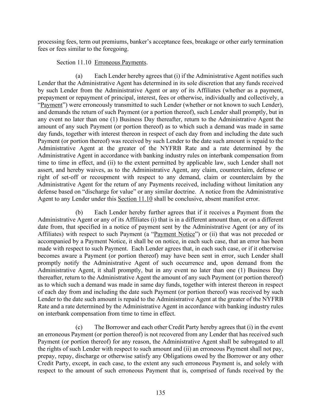 135 processing fees, term out premiums, banker’s acceptance fees, breakage or other early termination fees or fees similar to the foregoing. Section 11.10 Erroneous Payments. (a) Each Lender hereby agrees that (i) if the Administrative Agent notifies such Lender that the Administrative Agent has determined in its sole discretion that any funds received by such Lender from the Administrative Agent or any of its Affiliates (whether as a payment, prepayment or repayment of principal, interest, fees or otherwise, individually and collectively, a “Payment”) were erroneously transmitted to such Lender (whether or not known to such Lender), and demands the return of such Payment (or a portion thereof), such Lender shall promptly, but in any event no later than one (1) Business Day thereafter, return to the Administrative Agent the amount of any such Payment (or portion thereof) as to which such a demand was made in same day funds, together with interest thereon in respect of each day from and including the date such Payment (or portion thereof) was received by such Lender to the date such amount is repaid to the Administrative Agent at the greater of the NYFRB Rate and a rate determined by the Administrative Agent in accordance with banking industry rules on interbank compensation from time to time in effect, and (ii) to the extent permitted by applicable law, such Lender shall not assert, and hereby waives, as to the Administrative Agent, any claim, counterclaim, defense or right of set-off or recoupment with respect to any demand, claim or counterclaim by the Administrative Agent for the return of any Payments received, including without limitation any defense based on “discharge for value” or any similar doctrine. A notice from the Administrative Agent to any Lender under this Section 11.10 shall be conclusive, absent manifest error. (b) Each Lender hereby further agrees that if it receives a Payment from the Administrative Agent or any of its Affiliates (i) that is in a different amount than, or on a different date from, that specified in a notice of payment sent by the Administrative Agent (or any of its Affiliates) with respect to such Payment (a “Payment Notice”) or (ii) that was not preceded or accompanied by a Payment Notice, it shall be on notice, in each such case, that an error has been made with respect to such Payment. Each Lender agrees that, in each such case, or if it otherwise becomes aware a Payment (or portion thereof) may have been sent in error, such Lender shall promptly notify the Administrative Agent of such occurrence and, upon demand from the Administrative Agent, it shall promptly, but in any event no later than one (1) Business Day thereafter, return to the Administrative Agent the amount of any such Payment (or portion thereof) as to which such a demand was made in same day funds, together with interest thereon in respect of each day from and including the date such Payment (or portion thereof) was received by such Lender to the date such amount is repaid to the Administrative Agent at the greater of the NYFRB Rate and a rate determined by the Administrative Agent in accordance with banking industry rules on interbank compensation from time to time in effect. (c) The Borrower and each other Credit Party hereby agrees that (i) in the event an erroneous Payment (or portion thereof) is not recovered from any Lender that has received such Payment (or portion thereof) for any reason, the Administrative Agent shall be subrogated to all the rights of such Lender with respect to such amount and (ii) an erroneous Payment shall not pay, prepay, repay, discharge or otherwise satisfy any Obligations owed by the Borrower or any other Credit Party, except, in each case, to the extent any such erroneous Payment is, and solely with respect to the amount of such erroneous Payment that is, comprised of funds received by the