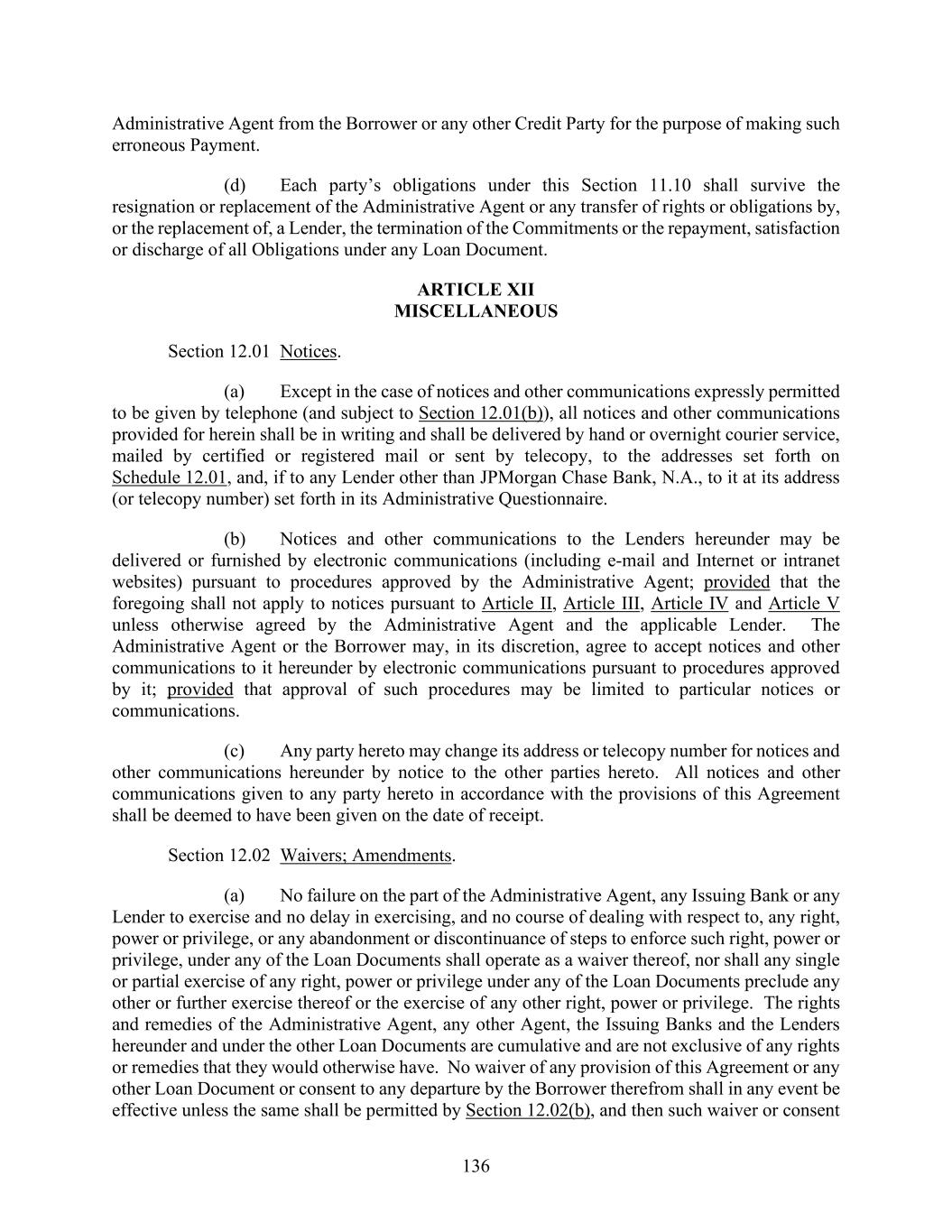136 Administrative Agent from the Borrower or any other Credit Party for the purpose of making such erroneous Payment. (d) Each party’s obligations under this Section 11.10 shall survive the resignation or replacement of the Administrative Agent or any transfer of rights or obligations by, or the replacement of, a Lender, the termination of the Commitments or the repayment, satisfaction or discharge of all Obligations under any Loan Document. ARTICLE XII MISCELLANEOUS Section 12.01 Notices. (a) Except in the case of notices and other communications expressly permitted to be given by telephone (and subject to Section 12.01(b)), all notices and other communications provided for herein shall be in writing and shall be delivered by hand or overnight courier service, mailed by certified or registered mail or sent by telecopy, to the addresses set forth on Schedule 12.01, and, if to any Lender other than JPMorgan Chase Bank, N.A., to it at its address (or telecopy number) set forth in its Administrative Questionnaire. (b) Notices and other communications to the Lenders hereunder may be delivered or furnished by electronic communications (including e-mail and Internet or intranet websites) pursuant to procedures approved by the Administrative Agent; provided that the foregoing shall not apply to notices pursuant to Article II, Article III, Article IV and Article V unless otherwise agreed by the Administrative Agent and the applicable Lender. The Administrative Agent or the Borrower may, in its discretion, agree to accept notices and other communications to it hereunder by electronic communications pursuant to procedures approved by it; provided that approval of such procedures may be limited to particular notices or communications. (c) Any party hereto may change its address or telecopy number for notices and other communications hereunder by notice to the other parties hereto. All notices and other communications given to any party hereto in accordance with the provisions of this Agreement shall be deemed to have been given on the date of receipt. Section 12.02 Waivers; Amendments. (a) No failure on the part of the Administrative Agent, any Issuing Bank or any Lender to exercise and no delay in exercising, and no course of dealing with respect to, any right, power or privilege, or any abandonment or discontinuance of steps to enforce such right, power or privilege, under any of the Loan Documents shall operate as a waiver thereof, nor shall any single or partial exercise of any right, power or privilege under any of the Loan Documents preclude any other or further exercise thereof or the exercise of any other right, power or privilege. The rights and remedies of the Administrative Agent, any other Agent, the Issuing Banks and the Lenders hereunder and under the other Loan Documents are cumulative and are not exclusive of any rights or remedies that they would otherwise have. No waiver of any provision of this Agreement or any other Loan Document or consent to any departure by the Borrower therefrom shall in any event be effective unless the same shall be permitted by Section 12.02(b), and then such waiver or consent