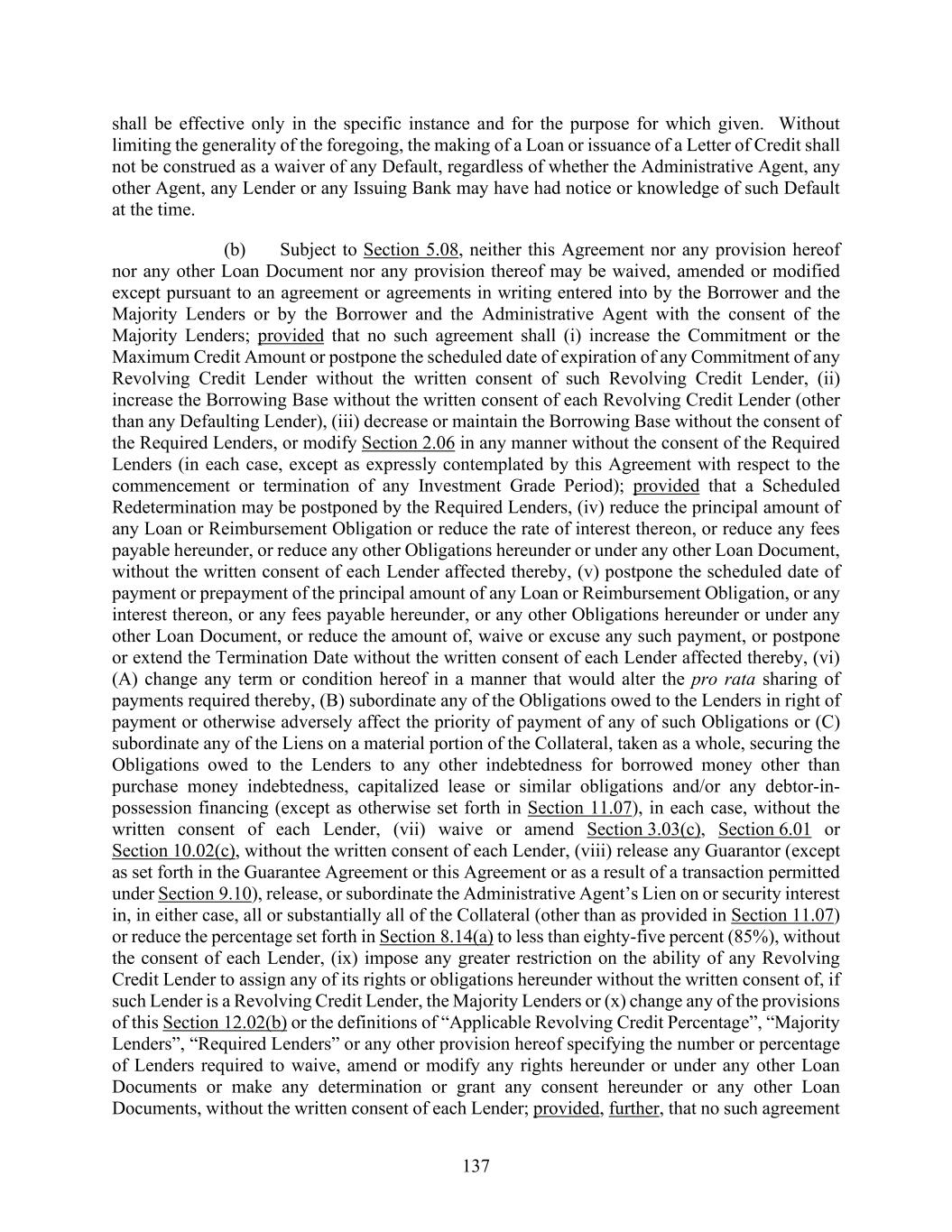 137 shall be effective only in the specific instance and for the purpose for which given. Without limiting the generality of the foregoing, the making of a Loan or issuance of a Letter of Credit shall not be construed as a waiver of any Default, regardless of whether the Administrative Agent, any other Agent, any Lender or any Issuing Bank may have had notice or knowledge of such Default at the time. (b) Subject to Section 5.08, neither this Agreement nor any provision hereof nor any other Loan Document nor any provision thereof may be waived, amended or modified except pursuant to an agreement or agreements in writing entered into by the Borrower and the Majority Lenders or by the Borrower and the Administrative Agent with the consent of the Majority Lenders; provided that no such agreement shall (i) increase the Commitment or the Maximum Credit Amount or postpone the scheduled date of expiration of any Commitment of any Revolving Credit Lender without the written consent of such Revolving Credit Lender, (ii) increase the Borrowing Base without the written consent of each Revolving Credit Lender (other than any Defaulting Lender), (iii) decrease or maintain the Borrowing Base without the consent of the Required Lenders, or modify Section 2.06 in any manner without the consent of the Required Lenders (in each case, except as expressly contemplated by this Agreement with respect to the commencement or termination of any Investment Grade Period); provided that a Scheduled Redetermination may be postponed by the Required Lenders, (iv) reduce the principal amount of any Loan or Reimbursement Obligation or reduce the rate of interest thereon, or reduce any fees payable hereunder, or reduce any other Obligations hereunder or under any other Loan Document, without the written consent of each Lender affected thereby, (v) postpone the scheduled date of payment or prepayment of the principal amount of any Loan or Reimbursement Obligation, or any interest thereon, or any fees payable hereunder, or any other Obligations hereunder or under any other Loan Document, or reduce the amount of, waive or excuse any such payment, or postpone or extend the Termination Date without the written consent of each Lender affected thereby, (vi) (A) change any term or condition hereof in a manner that would alter the pro rata sharing of payments required thereby, (B) subordinate any of the Obligations owed to the Lenders in right of payment or otherwise adversely affect the priority of payment of any of such Obligations or (C) subordinate any of the Liens on a material portion of the Collateral, taken as a whole, securing the Obligations owed to the Lenders to any other indebtedness for borrowed money other than purchase money indebtedness, capitalized lease or similar obligations and/or any debtor-in- possession financing (except as otherwise set forth in Section 11.07), in each case, without the written consent of each Lender, (vii) waive or amend Section 3.03(c), Section 6.01 or Section 10.02(c), without the written consent of each Lender, (viii) release any Guarantor (except as set forth in the Guarantee Agreement or this Agreement or as a result of a transaction permitted under Section 9.10), release, or subordinate the Administrative Agent’s Lien on or security interest in, in either case, all or substantially all of the Collateral (other than as provided in Section 11.07) or reduce the percentage set forth in Section 8.14(a) to less than eighty-five percent (85%), without the consent of each Lender, (ix) impose any greater restriction on the ability of any Revolving Credit Lender to assign any of its rights or obligations hereunder without the written consent of, if such Lender is a Revolving Credit Lender, the Majority Lenders or (x) change any of the provisions of this Section 12.02(b) or the definitions of “Applicable Revolving Credit Percentage”, “Majority Lenders”, “Required Lenders” or any other provision hereof specifying the number or percentage of Lenders required to waive, amend or modify any rights hereunder or under any other Loan Documents or make any determination or grant any consent hereunder or any other Loan Documents, without the written consent of each Lender; provided, further, that no such agreement