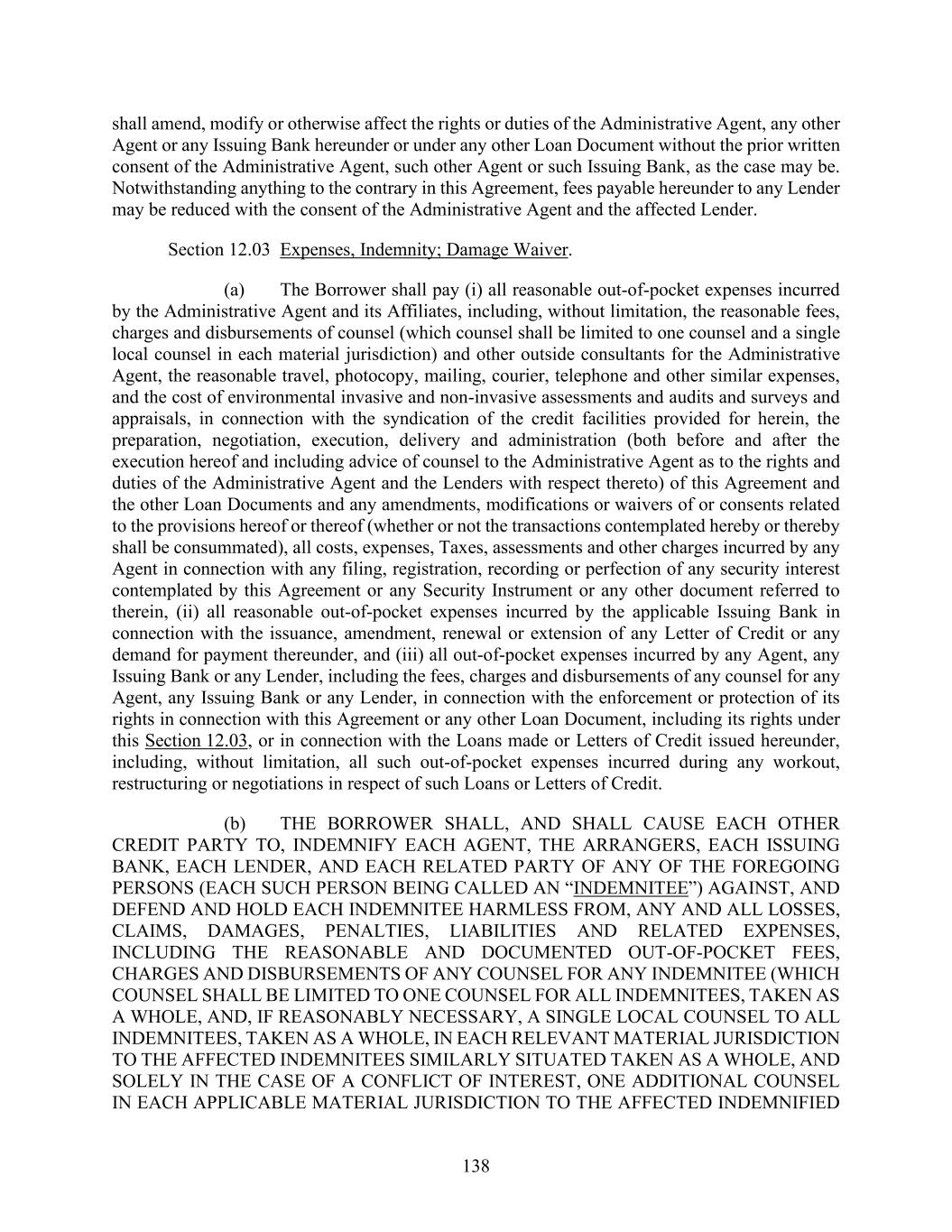 138 shall amend, modify or otherwise affect the rights or duties of the Administrative Agent, any other Agent or any Issuing Bank hereunder or under any other Loan Document without the prior written consent of the Administrative Agent, such other Agent or such Issuing Bank, as the case may be. Notwithstanding anything to the contrary in this Agreement, fees payable hereunder to any Lender may be reduced with the consent of the Administrative Agent and the affected Lender. Section 12.03 Expenses, Indemnity; Damage Waiver. (a) The Borrower shall pay (i) all reasonable out-of-pocket expenses incurred by the Administrative Agent and its Affiliates, including, without limitation, the reasonable fees, charges and disbursements of counsel (which counsel shall be limited to one counsel and a single local counsel in each material jurisdiction) and other outside consultants for the Administrative Agent, the reasonable travel, photocopy, mailing, courier, telephone and other similar expenses, and the cost of environmental invasive and non-invasive assessments and audits and surveys and appraisals, in connection with the syndication of the credit facilities provided for herein, the preparation, negotiation, execution, delivery and administration (both before and after the execution hereof and including advice of counsel to the Administrative Agent as to the rights and duties of the Administrative Agent and the Lenders with respect thereto) of this Agreement and the other Loan Documents and any amendments, modifications or waivers of or consents related to the provisions hereof or thereof (whether or not the transactions contemplated hereby or thereby shall be consummated), all costs, expenses, Taxes, assessments and other charges incurred by any Agent in connection with any filing, registration, recording or perfection of any security interest contemplated by this Agreement or any Security Instrument or any other document referred to therein, (ii) all reasonable out-of-pocket expenses incurred by the applicable Issuing Bank in connection with the issuance, amendment, renewal or extension of any Letter of Credit or any demand for payment thereunder, and (iii) all out-of-pocket expenses incurred by any Agent, any Issuing Bank or any Lender, including the fees, charges and disbursements of any counsel for any Agent, any Issuing Bank or any Lender, in connection with the enforcement or protection of its rights in connection with this Agreement or any other Loan Document, including its rights under this Section 12.03, or in connection with the Loans made or Letters of Credit issued hereunder, including, without limitation, all such out-of-pocket expenses incurred during any workout, restructuring or negotiations in respect of such Loans or Letters of Credit. (b) THE BORROWER SHALL, AND SHALL CAUSE EACH OTHER CREDIT PARTY TO, INDEMNIFY EACH AGENT, THE ARRANGERS, EACH ISSUING BANK, EACH LENDER, AND EACH RELATED PARTY OF ANY OF THE FOREGOING PERSONS (EACH SUCH PERSON BEING CALLED AN “INDEMNITEE”) AGAINST, AND DEFEND AND HOLD EACH INDEMNITEE HARMLESS FROM, ANY AND ALL LOSSES, CLAIMS, DAMAGES, PENALTIES, LIABILITIES AND RELATED EXPENSES, INCLUDING THE REASONABLE AND DOCUMENTED OUT-OF-POCKET FEES, CHARGES AND DISBURSEMENTS OF ANY COUNSEL FOR ANY INDEMNITEE (WHICH COUNSEL SHALL BE LIMITED TO ONE COUNSEL FOR ALL INDEMNITEES, TAKEN AS A WHOLE, AND, IF REASONABLY NECESSARY, A SINGLE LOCAL COUNSEL TO ALL INDEMNITEES, TAKEN AS A WHOLE, IN EACH RELEVANT MATERIAL JURISDICTION TO THE AFFECTED INDEMNITEES SIMILARLY SITUATED TAKEN AS A WHOLE, AND SOLELY IN THE CASE OF A CONFLICT OF INTEREST, ONE ADDITIONAL COUNSEL IN EACH APPLICABLE MATERIAL JURISDICTION TO THE AFFECTED INDEMNIFIED