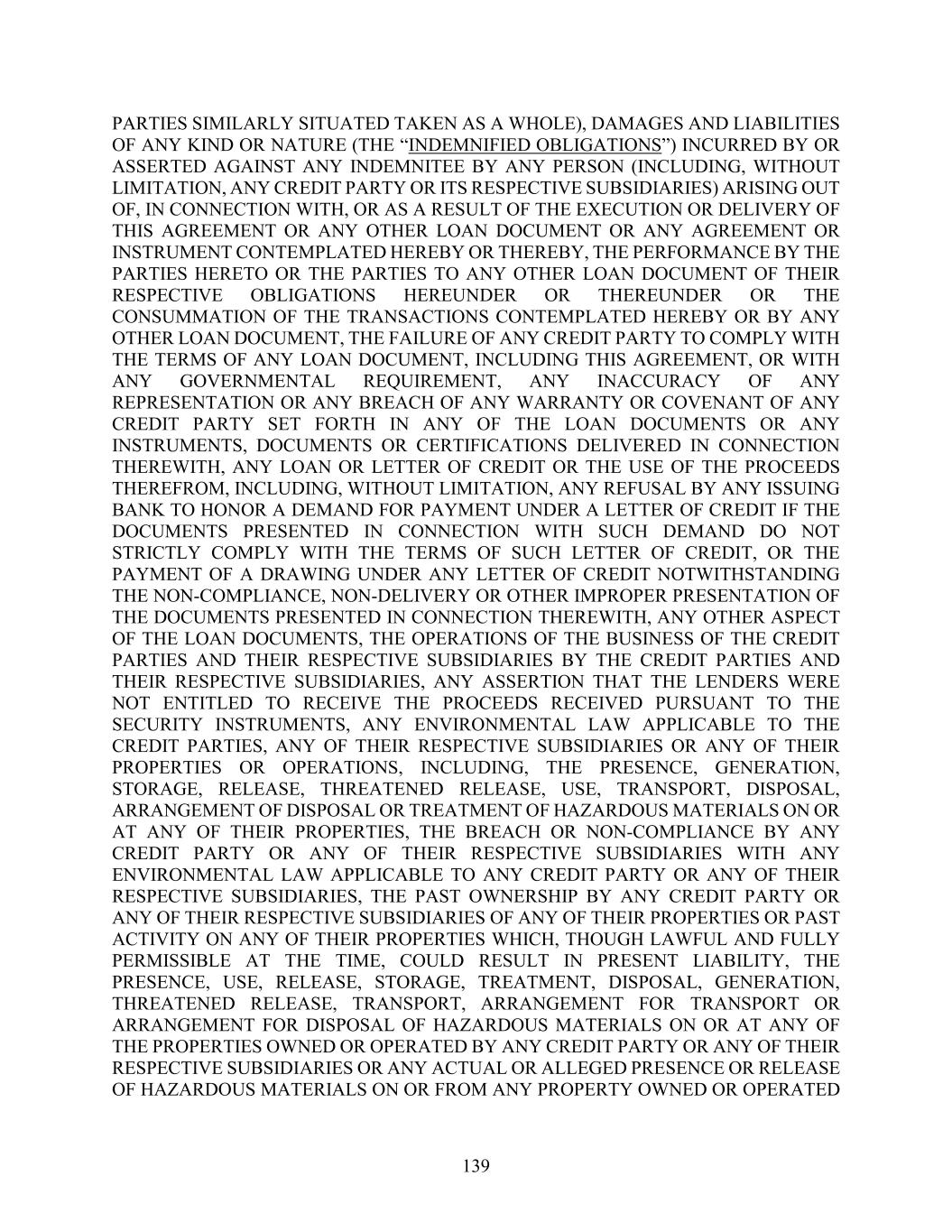 139 PARTIES SIMILARLY SITUATED TAKEN AS A WHOLE), DAMAGES AND LIABILITIES OF ANY KIND OR NATURE (THE “INDEMNIFIED OBLIGATIONS”) INCURRED BY OR ASSERTED AGAINST ANY INDEMNITEE BY ANY PERSON (INCLUDING, WITHOUT LIMITATION, ANY CREDIT PARTY OR ITS RESPECTIVE SUBSIDIARIES) ARISING OUT OF, IN CONNECTION WITH, OR AS A RESULT OF THE EXECUTION OR DELIVERY OF THIS AGREEMENT OR ANY OTHER LOAN DOCUMENT OR ANY AGREEMENT OR INSTRUMENT CONTEMPLATED HEREBY OR THEREBY, THE PERFORMANCE BY THE PARTIES HERETO OR THE PARTIES TO ANY OTHER LOAN DOCUMENT OF THEIR RESPECTIVE OBLIGATIONS HEREUNDER OR THEREUNDER OR THE CONSUMMATION OF THE TRANSACTIONS CONTEMPLATED HEREBY OR BY ANY OTHER LOAN DOCUMENT, THE FAILURE OF ANY CREDIT PARTY TO COMPLY WITH THE TERMS OF ANY LOAN DOCUMENT, INCLUDING THIS AGREEMENT, OR WITH ANY GOVERNMENTAL REQUIREMENT, ANY INACCURACY OF ANY REPRESENTATION OR ANY BREACH OF ANY WARRANTY OR COVENANT OF ANY CREDIT PARTY SET FORTH IN ANY OF THE LOAN DOCUMENTS OR ANY INSTRUMENTS, DOCUMENTS OR CERTIFICATIONS DELIVERED IN CONNECTION THEREWITH, ANY LOAN OR LETTER OF CREDIT OR THE USE OF THE PROCEEDS THEREFROM, INCLUDING, WITHOUT LIMITATION, ANY REFUSAL BY ANY ISSUING BANK TO HONOR A DEMAND FOR PAYMENT UNDER A LETTER OF CREDIT IF THE DOCUMENTS PRESENTED IN CONNECTION WITH SUCH DEMAND DO NOT STRICTLY COMPLY WITH THE TERMS OF SUCH LETTER OF CREDIT, OR THE PAYMENT OF A DRAWING UNDER ANY LETTER OF CREDIT NOTWITHSTANDING THE NON-COMPLIANCE, NON-DELIVERY OR OTHER IMPROPER PRESENTATION OF THE DOCUMENTS PRESENTED IN CONNECTION THEREWITH, ANY OTHER ASPECT OF THE LOAN DOCUMENTS, THE OPERATIONS OF THE BUSINESS OF THE CREDIT PARTIES AND THEIR RESPECTIVE SUBSIDIARIES BY THE CREDIT PARTIES AND THEIR RESPECTIVE SUBSIDIARIES, ANY ASSERTION THAT THE LENDERS WERE NOT ENTITLED TO RECEIVE THE PROCEEDS RECEIVED PURSUANT TO THE SECURITY INSTRUMENTS, ANY ENVIRONMENTAL LAW APPLICABLE TO THE CREDIT PARTIES, ANY OF THEIR RESPECTIVE SUBSIDIARIES OR ANY OF THEIR PROPERTIES OR OPERATIONS, INCLUDING, THE PRESENCE, GENERATION, STORAGE, RELEASE, THREATENED RELEASE, USE, TRANSPORT, DISPOSAL, ARRANGEMENT OF DISPOSAL OR TREATMENT OF HAZARDOUS MATERIALS ON OR AT ANY OF THEIR PROPERTIES, THE BREACH OR NON-COMPLIANCE BY ANY CREDIT PARTY OR ANY OF THEIR RESPECTIVE SUBSIDIARIES WITH ANY ENVIRONMENTAL LAW APPLICABLE TO ANY CREDIT PARTY OR ANY OF THEIR RESPECTIVE SUBSIDIARIES, THE PAST OWNERSHIP BY ANY CREDIT PARTY OR ANY OF THEIR RESPECTIVE SUBSIDIARIES OF ANY OF THEIR PROPERTIES OR PAST ACTIVITY ON ANY OF THEIR PROPERTIES WHICH, THOUGH LAWFUL AND FULLY PERMISSIBLE AT THE TIME, COULD RESULT IN PRESENT LIABILITY, THE PRESENCE, USE, RELEASE, STORAGE, TREATMENT, DISPOSAL, GENERATION, THREATENED RELEASE, TRANSPORT, ARRANGEMENT FOR TRANSPORT OR ARRANGEMENT FOR DISPOSAL OF HAZARDOUS MATERIALS ON OR AT ANY OF THE PROPERTIES OWNED OR OPERATED BY ANY CREDIT PARTY OR ANY OF THEIR RESPECTIVE SUBSIDIARIES OR ANY ACTUAL OR ALLEGED PRESENCE OR RELEASE OF HAZARDOUS MATERIALS ON OR FROM ANY PROPERTY OWNED OR OPERATED