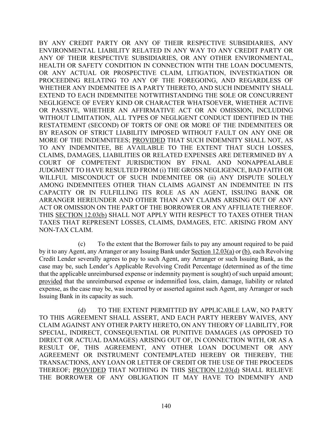 140 BY ANY CREDIT PARTY OR ANY OF THEIR RESPECTIVE SUBSIDIARIES, ANY ENVIRONMENTAL LIABILITY RELATED IN ANY WAY TO ANY CREDIT PARTY OR ANY OF THEIR RESPECTIVE SUBSIDIARIES, OR ANY OTHER ENVIRONMENTAL, HEALTH OR SAFETY CONDITION IN CONNECTION WITH THE LOAN DOCUMENTS, OR ANY ACTUAL OR PROSPECTIVE CLAIM, LITIGATION, INVESTIGATION OR PROCEEDING RELATING TO ANY OF THE FOREGOING, AND REGARDLESS OF WHETHER ANY INDEMNITEE IS A PARTY THERETO, AND SUCH INDEMNITY SHALL EXTEND TO EACH INDEMNITEE NOTWITHSTANDING THE SOLE OR CONCURRENT NEGLIGENCE OF EVERY KIND OR CHARACTER WHATSOEVER, WHETHER ACTIVE OR PASSIVE, WHETHER AN AFFIRMATIVE ACT OR AN OMISSION, INCLUDING WITHOUT LIMITATION, ALL TYPES OF NEGLIGENT CONDUCT IDENTIFIED IN THE RESTATEMENT (SECOND) OF TORTS OF ONE OR MORE OF THE INDEMNITEES OR BY REASON OF STRICT LIABILITY IMPOSED WITHOUT FAULT ON ANY ONE OR MORE OF THE INDEMNITEES; PROVIDED THAT SUCH INDEMNITY SHALL NOT, AS TO ANY INDEMNITEE, BE AVAILABLE TO THE EXTENT THAT SUCH LOSSES, CLAIMS, DAMAGES, LIABILITIES OR RELATED EXPENSES ARE DETERMINED BY A COURT OF COMPETENT JURISDICTION BY FINAL AND NONAPPEALABLE JUDGMENT TO HAVE RESULTED FROM (i) THE GROSS NEGLIGENCE, BAD FAITH OR WILLFUL MISCONDUCT OF SUCH INDEMNITEE OR (ii) ANY DISPUTE SOLELY AMONG INDEMNITEES OTHER THAN CLAIMS AGAINST AN INDEMNITEE IN ITS CAPACITY OR IN FULFILLING ITS ROLE AS AN AGENT, ISSUING BANK OR ARRANGER HEREUNDER AND OTHER THAN ANY CLAIMS ARISING OUT OF ANY ACT OR OMISSION ON THE PART OF THE BORROWER OR ANY AFFILIATE THEREOF. THIS SECTION 12.03(b) SHALL NOT APPLY WITH RESPECT TO TAXES OTHER THAN TAXES THAT REPRESENT LOSSES, CLAIMS, DAMAGES, ETC. ARISING FROM ANY NON-TAX CLAIM. (c) To the extent that the Borrower fails to pay any amount required to be paid by it to any Agent, any Arranger or any Issuing Bank under Section 12.03(a) or (b), each Revolving Credit Lender severally agrees to pay to such Agent, any Arranger or such Issuing Bank, as the case may be, such Lender’s Applicable Revolving Credit Percentage (determined as of the time that the applicable unreimbursed expense or indemnity payment is sought) of such unpaid amount; provided that the unreimbursed expense or indemnified loss, claim, damage, liability or related expense, as the case may be, was incurred by or asserted against such Agent, any Arranger or such Issuing Bank in its capacity as such. (d) TO THE EXTENT PERMITTED BY APPLICABLE LAW, NO PARTY TO THIS AGREEMENT SHALL ASSERT, AND EACH PARTY HEREBY WAIVES, ANY CLAIM AGAINST ANY OTHER PARTY HERETO, ON ANY THEORY OF LIABILITY, FOR SPECIAL, INDIRECT, CONSEQUENTIAL OR PUNITIVE DAMAGES (AS OPPOSED TO DIRECT OR ACTUAL DAMAGES) ARISING OUT OF, IN CONNECTION WITH, OR AS A RESULT OF, THIS AGREEMENT, ANY OTHER LOAN DOCUMENT OR ANY AGREEMENT OR INSTRUMENT CONTEMPLATED HEREBY OR THEREBY, THE TRANSACTIONS, ANY LOAN OR LETTER OF CREDIT OR THE USE OF THE PROCEEDS THEREOF; PROVIDED THAT NOTHING IN THIS SECTION 12.03(d) SHALL RELIEVE THE BORROWER OF ANY OBLIGATION IT MAY HAVE TO INDEMNIFY AND