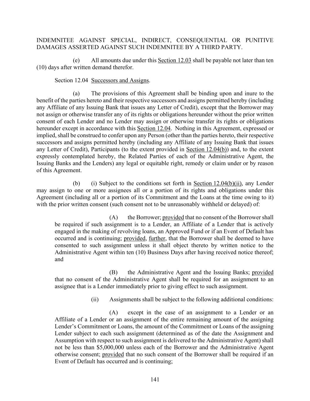 141 INDEMNITEE AGAINST SPECIAL, INDIRECT, CONSEQUENTIAL OR PUNITIVE DAMAGES ASSERTED AGAINST SUCH INDEMNITEE BY A THIRD PARTY. (e) All amounts due under this Section 12.03 shall be payable not later than ten (10) days after written demand therefor. Section 12.04 Successors and Assigns. (a) The provisions of this Agreement shall be binding upon and inure to the benefit of the parties hereto and their respective successors and assigns permitted hereby (including any Affiliate of any Issuing Bank that issues any Letter of Credit), except that the Borrower may not assign or otherwise transfer any of its rights or obligations hereunder without the prior written consent of each Lender and no Lender may assign or otherwise transfer its rights or obligations hereunder except in accordance with this Section 12.04. Nothing in this Agreement, expressed or implied, shall be construed to confer upon any Person (other than the parties hereto, their respective successors and assigns permitted hereby (including any Affiliate of any Issuing Bank that issues any Letter of Credit), Participants (to the extent provided in Section 12.04(b)) and, to the extent expressly contemplated hereby, the Related Parties of each of the Administrative Agent, the Issuing Banks and the Lenders) any legal or equitable right, remedy or claim under or by reason of this Agreement. (b) (i) Subject to the conditions set forth in Section 12.04(b)(ii), any Lender may assign to one or more assignees all or a portion of its rights and obligations under this Agreement (including all or a portion of its Commitment and the Loans at the time owing to it) with the prior written consent (such consent not to be unreasonably withheld or delayed) of: (A) the Borrower; provided that no consent of the Borrower shall be required if such assignment is to a Lender, an Affiliate of a Lender that is actively engaged in the making of revolving loans, an Approved Fund or if an Event of Default has occurred and is continuing; provided, further, that the Borrower shall be deemed to have consented to such assignment unless it shall object thereto by written notice to the Administrative Agent within ten (10) Business Days after having received notice thereof; and (B) the Administrative Agent and the Issuing Banks; provided that no consent of the Administrative Agent shall be required for an assignment to an assignee that is a Lender immediately prior to giving effect to such assignment. (ii) Assignments shall be subject to the following additional conditions: (A) except in the case of an assignment to a Lender or an Affiliate of a Lender or an assignment of the entire remaining amount of the assigning Lender’s Commitment or Loans, the amount of the Commitment or Loans of the assigning Lender subject to each such assignment (determined as of the date the Assignment and Assumption with respect to such assignment is delivered to the Administrative Agent) shall not be less than $5,000,000 unless each of the Borrower and the Administrative Agent otherwise consent; provided that no such consent of the Borrower shall be required if an Event of Default has occurred and is continuing;