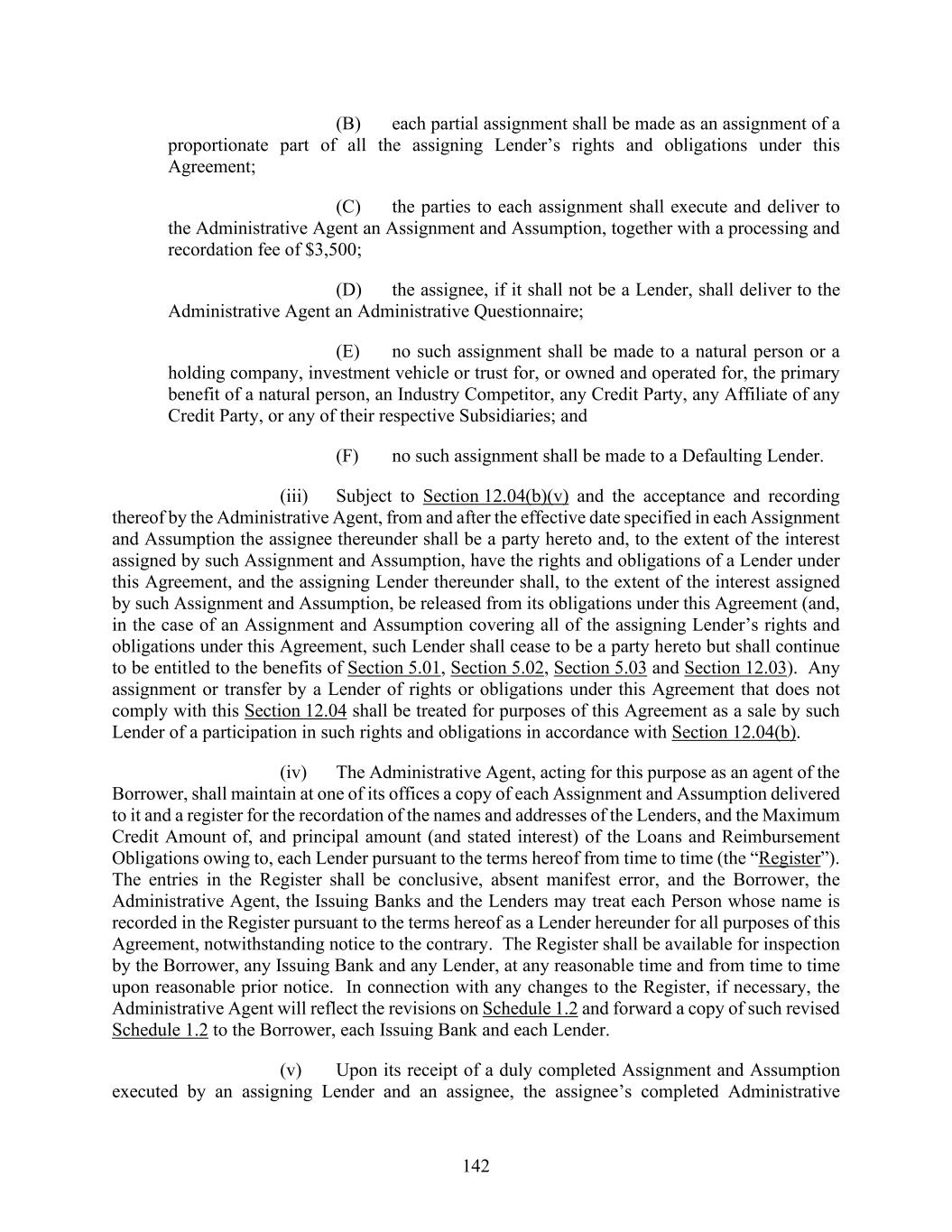 142 (B) each partial assignment shall be made as an assignment of a proportionate part of all the assigning Lender’s rights and obligations under this Agreement; (C) the parties to each assignment shall execute and deliver to the Administrative Agent an Assignment and Assumption, together with a processing and recordation fee of $3,500; (D) the assignee, if it shall not be a Lender, shall deliver to the Administrative Agent an Administrative Questionnaire; (E) no such assignment shall be made to a natural person or a holding company, investment vehicle or trust for, or owned and operated for, the primary benefit of a natural person, an Industry Competitor, any Credit Party, any Affiliate of any Credit Party, or any of their respective Subsidiaries; and (F) no such assignment shall be made to a Defaulting Lender. (iii) Subject to Section 12.04(b)(v) and the acceptance and recording thereof by the Administrative Agent, from and after the effective date specified in each Assignment and Assumption the assignee thereunder shall be a party hereto and, to the extent of the interest assigned by such Assignment and Assumption, have the rights and obligations of a Lender under this Agreement, and the assigning Lender thereunder shall, to the extent of the interest assigned by such Assignment and Assumption, be released from its obligations under this Agreement (and, in the case of an Assignment and Assumption covering all of the assigning Lender’s rights and obligations under this Agreement, such Lender shall cease to be a party hereto but shall continue to be entitled to the benefits of Section 5.01, Section 5.02, Section 5.03 and Section 12.03). Any assignment or transfer by a Lender of rights or obligations under this Agreement that does not comply with this Section 12.04 shall be treated for purposes of this Agreement as a sale by such Lender of a participation in such rights and obligations in accordance with Section 12.04(b). (iv) The Administrative Agent, acting for this purpose as an agent of the Borrower, shall maintain at one of its offices a copy of each Assignment and Assumption delivered to it and a register for the recordation of the names and addresses of the Lenders, and the Maximum Credit Amount of, and principal amount (and stated interest) of the Loans and Reimbursement Obligations owing to, each Lender pursuant to the terms hereof from time to time (the “Register”). The entries in the Register shall be conclusive, absent manifest error, and the Borrower, the Administrative Agent, the Issuing Banks and the Lenders may treat each Person whose name is recorded in the Register pursuant to the terms hereof as a Lender hereunder for all purposes of this Agreement, notwithstanding notice to the contrary. The Register shall be available for inspection by the Borrower, any Issuing Bank and any Lender, at any reasonable time and from time to time upon reasonable prior notice. In connection with any changes to the Register, if necessary, the Administrative Agent will reflect the revisions on Schedule 1.2 and forward a copy of such revised Schedule 1.2 to the Borrower, each Issuing Bank and each Lender. (v) Upon its receipt of a duly completed Assignment and Assumption executed by an assigning Lender and an assignee, the assignee’s completed Administrative
