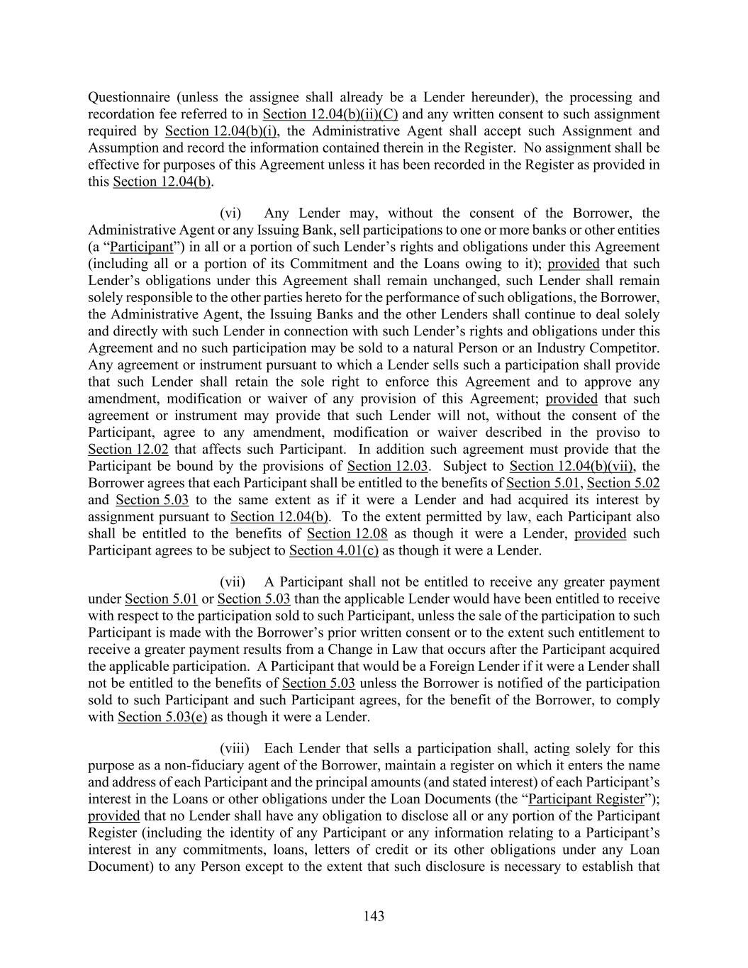 143 Questionnaire (unless the assignee shall already be a Lender hereunder), the processing and recordation fee referred to in Section 12.04(b)(ii)(C) and any written consent to such assignment required by Section 12.04(b)(i), the Administrative Agent shall accept such Assignment and Assumption and record the information contained therein in the Register. No assignment shall be effective for purposes of this Agreement unless it has been recorded in the Register as provided in this Section 12.04(b). (vi) Any Lender may, without the consent of the Borrower, the Administrative Agent or any Issuing Bank, sell participations to one or more banks or other entities (a “Participant”) in all or a portion of such Lender’s rights and obligations under this Agreement (including all or a portion of its Commitment and the Loans owing to it); provided that such Lender’s obligations under this Agreement shall remain unchanged, such Lender shall remain solely responsible to the other parties hereto for the performance of such obligations, the Borrower, the Administrative Agent, the Issuing Banks and the other Lenders shall continue to deal solely and directly with such Lender in connection with such Lender’s rights and obligations under this Agreement and no such participation may be sold to a natural Person or an Industry Competitor. Any agreement or instrument pursuant to which a Lender sells such a participation shall provide that such Lender shall retain the sole right to enforce this Agreement and to approve any amendment, modification or waiver of any provision of this Agreement; provided that such agreement or instrument may provide that such Lender will not, without the consent of the Participant, agree to any amendment, modification or waiver described in the proviso to Section 12.02 that affects such Participant. In addition such agreement must provide that the Participant be bound by the provisions of Section 12.03. Subject to Section 12.04(b)(vii), the Borrower agrees that each Participant shall be entitled to the benefits of Section 5.01, Section 5.02 and Section 5.03 to the same extent as if it were a Lender and had acquired its interest by assignment pursuant to Section 12.04(b). To the extent permitted by law, each Participant also shall be entitled to the benefits of Section 12.08 as though it were a Lender, provided such Participant agrees to be subject to Section 4.01(c) as though it were a Lender. (vii) A Participant shall not be entitled to receive any greater payment under Section 5.01 or Section 5.03 than the applicable Lender would have been entitled to receive with respect to the participation sold to such Participant, unless the sale of the participation to such Participant is made with the Borrower’s prior written consent or to the extent such entitlement to receive a greater payment results from a Change in Law that occurs after the Participant acquired the applicable participation. A Participant that would be a Foreign Lender if it were a Lender shall not be entitled to the benefits of Section 5.03 unless the Borrower is notified of the participation sold to such Participant and such Participant agrees, for the benefit of the Borrower, to comply with Section 5.03(e) as though it were a Lender. (viii) Each Lender that sells a participation shall, acting solely for this purpose as a non-fiduciary agent of the Borrower, maintain a register on which it enters the name and address of each Participant and the principal amounts (and stated interest) of each Participant’s interest in the Loans or other obligations under the Loan Documents (the “Participant Register”); provided that no Lender shall have any obligation to disclose all or any portion of the Participant Register (including the identity of any Participant or any information relating to a Participant’s interest in any commitments, loans, letters of credit or its other obligations under any Loan Document) to any Person except to the extent that such disclosure is necessary to establish that