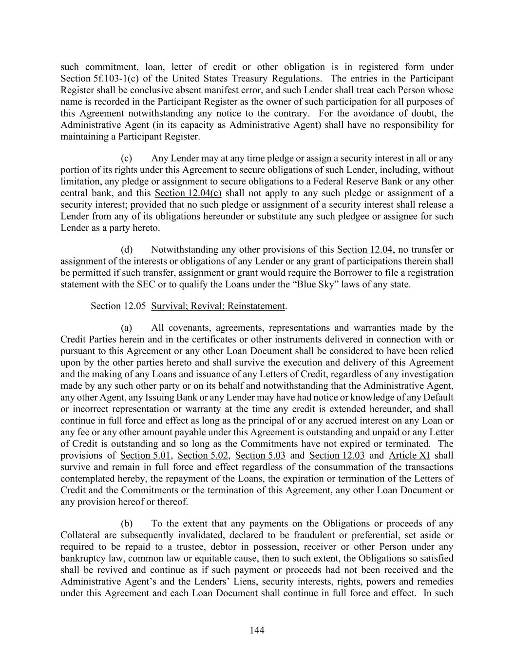 144 such commitment, loan, letter of credit or other obligation is in registered form under Section 5f.103-1(c) of the United States Treasury Regulations. The entries in the Participant Register shall be conclusive absent manifest error, and such Lender shall treat each Person whose name is recorded in the Participant Register as the owner of such participation for all purposes of this Agreement notwithstanding any notice to the contrary. For the avoidance of doubt, the Administrative Agent (in its capacity as Administrative Agent) shall have no responsibility for maintaining a Participant Register. (c) Any Lender may at any time pledge or assign a security interest in all or any portion of its rights under this Agreement to secure obligations of such Lender, including, without limitation, any pledge or assignment to secure obligations to a Federal Reserve Bank or any other central bank, and this Section 12.04(c) shall not apply to any such pledge or assignment of a security interest; provided that no such pledge or assignment of a security interest shall release a Lender from any of its obligations hereunder or substitute any such pledgee or assignee for such Lender as a party hereto. (d) Notwithstanding any other provisions of this Section 12.04, no transfer or assignment of the interests or obligations of any Lender or any grant of participations therein shall be permitted if such transfer, assignment or grant would require the Borrower to file a registration statement with the SEC or to qualify the Loans under the “Blue Sky” laws of any state. Section 12.05 Survival; Revival; Reinstatement. (a) All covenants, agreements, representations and warranties made by the Credit Parties herein and in the certificates or other instruments delivered in connection with or pursuant to this Agreement or any other Loan Document shall be considered to have been relied upon by the other parties hereto and shall survive the execution and delivery of this Agreement and the making of any Loans and issuance of any Letters of Credit, regardless of any investigation made by any such other party or on its behalf and notwithstanding that the Administrative Agent, any other Agent, any Issuing Bank or any Lender may have had notice or knowledge of any Default or incorrect representation or warranty at the time any credit is extended hereunder, and shall continue in full force and effect as long as the principal of or any accrued interest on any Loan or any fee or any other amount payable under this Agreement is outstanding and unpaid or any Letter of Credit is outstanding and so long as the Commitments have not expired or terminated. The provisions of Section 5.01, Section 5.02, Section 5.03 and Section 12.03 and Article XI shall survive and remain in full force and effect regardless of the consummation of the transactions contemplated hereby, the repayment of the Loans, the expiration or termination of the Letters of Credit and the Commitments or the termination of this Agreement, any other Loan Document or any provision hereof or thereof. (b) To the extent that any payments on the Obligations or proceeds of any Collateral are subsequently invalidated, declared to be fraudulent or preferential, set aside or required to be repaid to a trustee, debtor in possession, receiver or other Person under any bankruptcy law, common law or equitable cause, then to such extent, the Obligations so satisfied shall be revived and continue as if such payment or proceeds had not been received and the Administrative Agent’s and the Lenders’ Liens, security interests, rights, powers and remedies under this Agreement and each Loan Document shall continue in full force and effect. In such