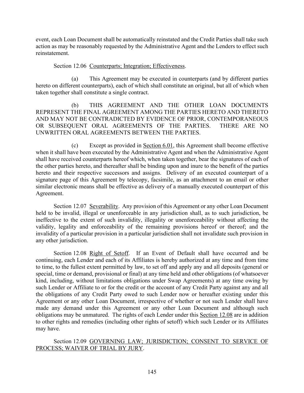 145 event, each Loan Document shall be automatically reinstated and the Credit Parties shall take such action as may be reasonably requested by the Administrative Agent and the Lenders to effect such reinstatement. Section 12.06 Counterparts; Integration; Effectiveness. (a) This Agreement may be executed in counterparts (and by different parties hereto on different counterparts), each of which shall constitute an original, but all of which when taken together shall constitute a single contract. (b) THIS AGREEMENT AND THE OTHER LOAN DOCUMENTS REPRESENT THE FINAL AGREEMENT AMONG THE PARTIES HERETO AND THERETO AND MAY NOT BE CONTRADICTED BY EVIDENCE OF PRIOR, CONTEMPORANEOUS OR SUBSEQUENT ORAL AGREEMENTS OF THE PARTIES. THERE ARE NO UNWRITTEN ORAL AGREEMENTS BETWEEN THE PARTIES. (c) Except as provided in Section 6.01, this Agreement shall become effective when it shall have been executed by the Administrative Agent and when the Administrative Agent shall have received counterparts hereof which, when taken together, bear the signatures of each of the other parties hereto, and thereafter shall be binding upon and inure to the benefit of the parties hereto and their respective successors and assigns. Delivery of an executed counterpart of a signature page of this Agreement by telecopy, facsimile, as an attachment to an email or other similar electronic means shall be effective as delivery of a manually executed counterpart of this Agreement. Section 12.07 Severability. Any provision of this Agreement or any other Loan Document held to be invalid, illegal or unenforceable in any jurisdiction shall, as to such jurisdiction, be ineffective to the extent of such invalidity, illegality or unenforceability without affecting the validity, legality and enforceability of the remaining provisions hereof or thereof; and the invalidity of a particular provision in a particular jurisdiction shall not invalidate such provision in any other jurisdiction. Section 12.08 Right of Setoff. If an Event of Default shall have occurred and be continuing, each Lender and each of its Affiliates is hereby authorized at any time and from time to time, to the fullest extent permitted by law, to set off and apply any and all deposits (general or special, time or demand, provisional or final) at any time held and other obligations (of whatsoever kind, including, without limitations obligations under Swap Agreements) at any time owing by such Lender or Affiliate to or for the credit or the account of any Credit Party against any and all the obligations of any Credit Party owed to such Lender now or hereafter existing under this Agreement or any other Loan Document, irrespective of whether or not such Lender shall have made any demand under this Agreement or any other Loan Document and although such obligations may be unmatured. The rights of each Lender under this Section 12.08 are in addition to other rights and remedies (including other rights of setoff) which such Lender or its Affiliates may have. Section 12.09 GOVERNING LAW; JURISDICTION; CONSENT TO SERVICE OF PROCESS; WAIVER OF TRIAL BY JURY.
