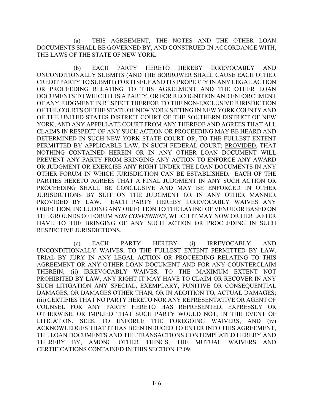 146 (a) THIS AGREEMENT, THE NOTES AND THE OTHER LOAN DOCUMENTS SHALL BE GOVERNED BY, AND CONSTRUED IN ACCORDANCE WITH, THE LAWS OF THE STATE OF NEW YORK. (b) EACH PARTY HERETO HEREBY IRREVOCABLY AND UNCONDITIONALLY SUBMITS (AND THE BORROWER SHALL CAUSE EACH OTHER CREDIT PARTY TO SUBMIT) FOR ITSELF AND ITS PROPERTY IN ANY LEGAL ACTION OR PROCEEDING RELATING TO THIS AGREEMENT AND THE OTHER LOAN DOCUMENTS TO WHICH IT IS A PARTY, OR FOR RECOGNITION AND ENFORCEMENT OF ANY JUDGMENT IN RESPECT THEREOF, TO THE NON-EXCLUSIVE JURISDICTION OF THE COURTS OF THE STATE OF NEW YORK SITTING IN NEW YORK COUNTY AND OF THE UNITED STATES DISTRICT COURT OF THE SOUTHERN DISTRICT OF NEW YORK, AND ANY APPELLATE COURT FROM ANY THEREOF AND AGREES THAT ALL CLAIMS IN RESPECT OF ANY SUCH ACTION OR PROCEEDING MAY BE HEARD AND DETERMINED IN SUCH NEW YORK STATE COURT OR, TO THE FULLEST EXTENT PERMITTED BY APPLICABLE LAW, IN SUCH FEDERAL COURT; PROVIDED, THAT NOTHING CONTAINED HEREIN OR IN ANY OTHER LOAN DOCUMENT WILL PREVENT ANY PARTY FROM BRINGING ANY ACTION TO ENFORCE ANY AWARD OR JUDGMENT OR EXERCISE ANY RIGHT UNDER THE LOAN DOCUMENTS IN ANY OTHER FORUM IN WHICH JURISDICTION CAN BE ESTABLISHED. EACH OF THE PARTIES HERETO AGREES THAT A FINAL JUDGMENT IN ANY SUCH ACTION OR PROCEEDING SHALL BE CONCLUSIVE AND MAY BE ENFORCED IN OTHER JURISDICTIONS BY SUIT ON THE JUDGMENT OR IN ANY OTHER MANNER PROVIDED BY LAW. EACH PARTY HEREBY IRREVOCABLY WAIVES ANY OBJECTION, INCLUDING ANY OBJECTION TO THE LAYING OF VENUE OR BASED ON THE GROUNDS OF FORUM NON CONVENIENS, WHICH IT MAY NOW OR HEREAFTER HAVE TO THE BRINGING OF ANY SUCH ACTION OR PROCEEDING IN SUCH RESPECTIVE JURISDICTIONS. (c) EACH PARTY HEREBY (i) IRREVOCABLY AND UNCONDITIONALLY WAIVES, TO THE FULLEST EXTENT PERMITTED BY LAW, TRIAL BY JURY IN ANY LEGAL ACTION OR PROCEEDING RELATING TO THIS AGREEMENT OR ANY OTHER LOAN DOCUMENT AND FOR ANY COUNTERCLAIM THEREIN; (ii) IRREVOCABLY WAIVES, TO THE MAXIMUM EXTENT NOT PROHIBITED BY LAW, ANY RIGHT IT MAY HAVE TO CLAIM OR RECOVER IN ANY SUCH LITIGATION ANY SPECIAL, EXEMPLARY, PUNITIVE OR CONSEQUENTIAL DAMAGES, OR DAMAGES OTHER THAN, OR IN ADDITION TO, ACTUAL DAMAGES; (iii) CERTIFIES THAT NO PARTY HERETO NOR ANY REPRESENTATIVE OR AGENT OF COUNSEL FOR ANY PARTY HERETO HAS REPRESENTED, EXPRESSLY OR OTHERWISE, OR IMPLIED THAT SUCH PARTY WOULD NOT, IN THE EVENT OF LITIGATION, SEEK TO ENFORCE THE FOREGOING WAIVERS, AND (iv) ACKNOWLEDGES THAT IT HAS BEEN INDUCED TO ENTER INTO THIS AGREEMENT, THE LOAN DOCUMENTS AND THE TRANSACTIONS CONTEMPLATED HEREBY AND THEREBY BY, AMONG OTHER THINGS, THE MUTUAL WAIVERS AND CERTIFICATIONS CONTAINED IN THIS SECTION 12.09.