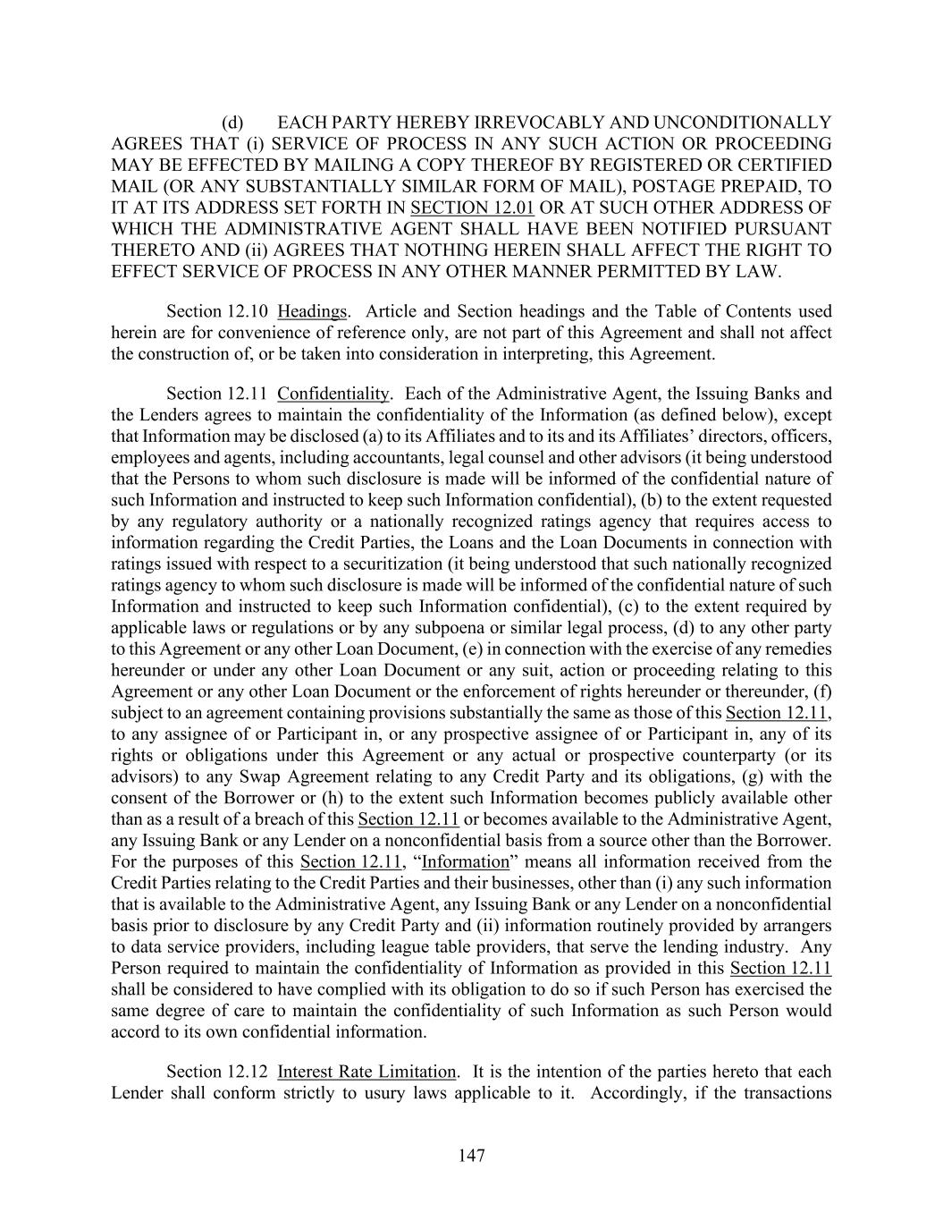 147 (d) EACH PARTY HEREBY IRREVOCABLY AND UNCONDITIONALLY AGREES THAT (i) SERVICE OF PROCESS IN ANY SUCH ACTION OR PROCEEDING MAY BE EFFECTED BY MAILING A COPY THEREOF BY REGISTERED OR CERTIFIED MAIL (OR ANY SUBSTANTIALLY SIMILAR FORM OF MAIL), POSTAGE PREPAID, TO IT AT ITS ADDRESS SET FORTH IN SECTION 12.01 OR AT SUCH OTHER ADDRESS OF WHICH THE ADMINISTRATIVE AGENT SHALL HAVE BEEN NOTIFIED PURSUANT THERETO AND (ii) AGREES THAT NOTHING HEREIN SHALL AFFECT THE RIGHT TO EFFECT SERVICE OF PROCESS IN ANY OTHER MANNER PERMITTED BY LAW. Section 12.10 Headings. Article and Section headings and the Table of Contents used herein are for convenience of reference only, are not part of this Agreement and shall not affect the construction of, or be taken into consideration in interpreting, this Agreement. Section 12.11 Confidentiality. Each of the Administrative Agent, the Issuing Banks and the Lenders agrees to maintain the confidentiality of the Information (as defined below), except that Information may be disclosed (a) to its Affiliates and to its and its Affiliates’ directors, officers, employees and agents, including accountants, legal counsel and other advisors (it being understood that the Persons to whom such disclosure is made will be informed of the confidential nature of such Information and instructed to keep such Information confidential), (b) to the extent requested by any regulatory authority or a nationally recognized ratings agency that requires access to information regarding the Credit Parties, the Loans and the Loan Documents in connection with ratings issued with respect to a securitization (it being understood that such nationally recognized ratings agency to whom such disclosure is made will be informed of the confidential nature of such Information and instructed to keep such Information confidential), (c) to the extent required by applicable laws or regulations or by any subpoena or similar legal process, (d) to any other party to this Agreement or any other Loan Document, (e) in connection with the exercise of any remedies hereunder or under any other Loan Document or any suit, action or proceeding relating to this Agreement or any other Loan Document or the enforcement of rights hereunder or thereunder, (f) subject to an agreement containing provisions substantially the same as those of this Section 12.11, to any assignee of or Participant in, or any prospective assignee of or Participant in, any of its rights or obligations under this Agreement or any actual or prospective counterparty (or its advisors) to any Swap Agreement relating to any Credit Party and its obligations, (g) with the consent of the Borrower or (h) to the extent such Information becomes publicly available other than as a result of a breach of this Section 12.11 or becomes available to the Administrative Agent, any Issuing Bank or any Lender on a nonconfidential basis from a source other than the Borrower. For the purposes of this Section 12.11, “Information” means all information received from the Credit Parties relating to the Credit Parties and their businesses, other than (i) any such information that is available to the Administrative Agent, any Issuing Bank or any Lender on a nonconfidential basis prior to disclosure by any Credit Party and (ii) information routinely provided by arrangers to data service providers, including league table providers, that serve the lending industry. Any Person required to maintain the confidentiality of Information as provided in this Section 12.11 shall be considered to have complied with its obligation to do so if such Person has exercised the same degree of care to maintain the confidentiality of such Information as such Person would accord to its own confidential information. Section 12.12 Interest Rate Limitation. It is the intention of the parties hereto that each Lender shall conform strictly to usury laws applicable to it. Accordingly, if the transactions