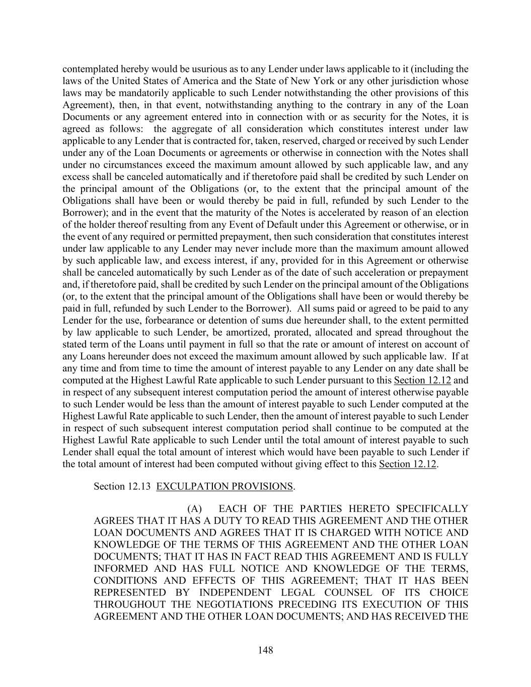 148 contemplated hereby would be usurious as to any Lender under laws applicable to it (including the laws of the United States of America and the State of New York or any other jurisdiction whose laws may be mandatorily applicable to such Lender notwithstanding the other provisions of this Agreement), then, in that event, notwithstanding anything to the contrary in any of the Loan Documents or any agreement entered into in connection with or as security for the Notes, it is agreed as follows: the aggregate of all consideration which constitutes interest under law applicable to any Lender that is contracted for, taken, reserved, charged or received by such Lender under any of the Loan Documents or agreements or otherwise in connection with the Notes shall under no circumstances exceed the maximum amount allowed by such applicable law, and any excess shall be canceled automatically and if theretofore paid shall be credited by such Lender on the principal amount of the Obligations (or, to the extent that the principal amount of the Obligations shall have been or would thereby be paid in full, refunded by such Lender to the Borrower); and in the event that the maturity of the Notes is accelerated by reason of an election of the holder thereof resulting from any Event of Default under this Agreement or otherwise, or in the event of any required or permitted prepayment, then such consideration that constitutes interest under law applicable to any Lender may never include more than the maximum amount allowed by such applicable law, and excess interest, if any, provided for in this Agreement or otherwise shall be canceled automatically by such Lender as of the date of such acceleration or prepayment and, if theretofore paid, shall be credited by such Lender on the principal amount of the Obligations (or, to the extent that the principal amount of the Obligations shall have been or would thereby be paid in full, refunded by such Lender to the Borrower). All sums paid or agreed to be paid to any Lender for the use, forbearance or detention of sums due hereunder shall, to the extent permitted by law applicable to such Lender, be amortized, prorated, allocated and spread throughout the stated term of the Loans until payment in full so that the rate or amount of interest on account of any Loans hereunder does not exceed the maximum amount allowed by such applicable law. If at any time and from time to time the amount of interest payable to any Lender on any date shall be computed at the Highest Lawful Rate applicable to such Lender pursuant to this Section 12.12 and in respect of any subsequent interest computation period the amount of interest otherwise payable to such Lender would be less than the amount of interest payable to such Lender computed at the Highest Lawful Rate applicable to such Lender, then the amount of interest payable to such Lender in respect of such subsequent interest computation period shall continue to be computed at the Highest Lawful Rate applicable to such Lender until the total amount of interest payable to such Lender shall equal the total amount of interest which would have been payable to such Lender if the total amount of interest had been computed without giving effect to this Section 12.12. Section 12.13 EXCULPATION PROVISIONS. (A) EACH OF THE PARTIES HERETO SPECIFICALLY AGREES THAT IT HAS A DUTY TO READ THIS AGREEMENT AND THE OTHER LOAN DOCUMENTS AND AGREES THAT IT IS CHARGED WITH NOTICE AND KNOWLEDGE OF THE TERMS OF THIS AGREEMENT AND THE OTHER LOAN DOCUMENTS; THAT IT HAS IN FACT READ THIS AGREEMENT AND IS FULLY INFORMED AND HAS FULL NOTICE AND KNOWLEDGE OF THE TERMS, CONDITIONS AND EFFECTS OF THIS AGREEMENT; THAT IT HAS BEEN REPRESENTED BY INDEPENDENT LEGAL COUNSEL OF ITS CHOICE THROUGHOUT THE NEGOTIATIONS PRECEDING ITS EXECUTION OF THIS AGREEMENT AND THE OTHER LOAN DOCUMENTS; AND HAS RECEIVED THE