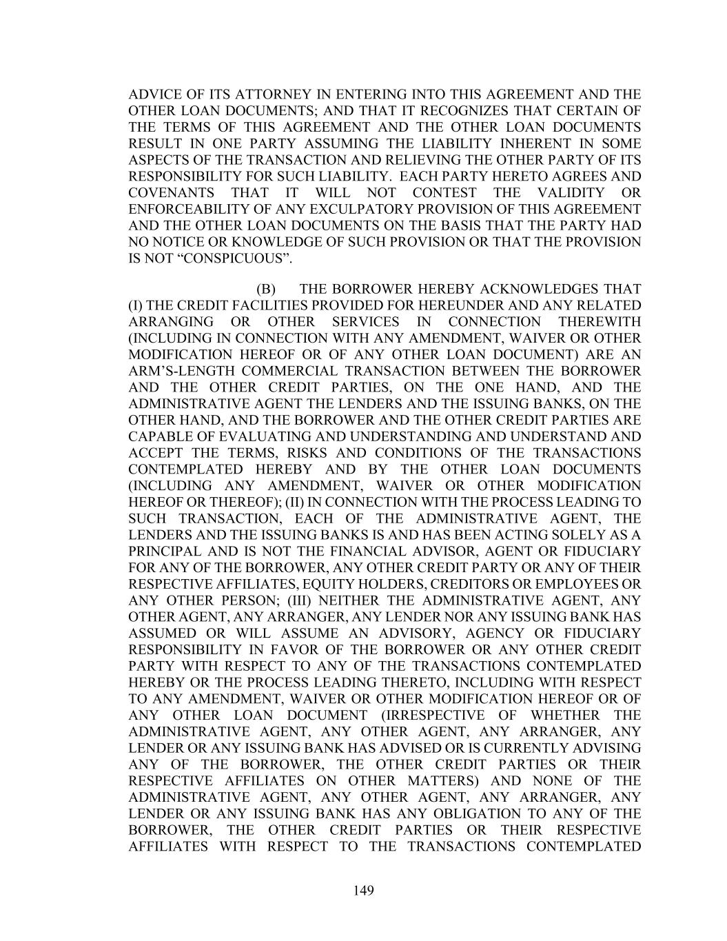 149 ADVICE OF ITS ATTORNEY IN ENTERING INTO THIS AGREEMENT AND THE OTHER LOAN DOCUMENTS; AND THAT IT RECOGNIZES THAT CERTAIN OF THE TERMS OF THIS AGREEMENT AND THE OTHER LOAN DOCUMENTS RESULT IN ONE PARTY ASSUMING THE LIABILITY INHERENT IN SOME ASPECTS OF THE TRANSACTION AND RELIEVING THE OTHER PARTY OF ITS RESPONSIBILITY FOR SUCH LIABILITY. EACH PARTY HERETO AGREES AND COVENANTS THAT IT WILL NOT CONTEST THE VALIDITY OR ENFORCEABILITY OF ANY EXCULPATORY PROVISION OF THIS AGREEMENT AND THE OTHER LOAN DOCUMENTS ON THE BASIS THAT THE PARTY HAD NO NOTICE OR KNOWLEDGE OF SUCH PROVISION OR THAT THE PROVISION IS NOT “CONSPICUOUS”. (B) THE BORROWER HEREBY ACKNOWLEDGES THAT (I) THE CREDIT FACILITIES PROVIDED FOR HEREUNDER AND ANY RELATED ARRANGING OR OTHER SERVICES IN CONNECTION THEREWITH (INCLUDING IN CONNECTION WITH ANY AMENDMENT, WAIVER OR OTHER MODIFICATION HEREOF OR OF ANY OTHER LOAN DOCUMENT) ARE AN ARM’S-LENGTH COMMERCIAL TRANSACTION BETWEEN THE BORROWER AND THE OTHER CREDIT PARTIES, ON THE ONE HAND, AND THE ADMINISTRATIVE AGENT THE LENDERS AND THE ISSUING BANKS, ON THE OTHER HAND, AND THE BORROWER AND THE OTHER CREDIT PARTIES ARE CAPABLE OF EVALUATING AND UNDERSTANDING AND UNDERSTAND AND ACCEPT THE TERMS, RISKS AND CONDITIONS OF THE TRANSACTIONS CONTEMPLATED HEREBY AND BY THE OTHER LOAN DOCUMENTS (INCLUDING ANY AMENDMENT, WAIVER OR OTHER MODIFICATION HEREOF OR THEREOF); (II) IN CONNECTION WITH THE PROCESS LEADING TO SUCH TRANSACTION, EACH OF THE ADMINISTRATIVE AGENT, THE LENDERS AND THE ISSUING BANKS IS AND HAS BEEN ACTING SOLELY AS A PRINCIPAL AND IS NOT THE FINANCIAL ADVISOR, AGENT OR FIDUCIARY FOR ANY OF THE BORROWER, ANY OTHER CREDIT PARTY OR ANY OF THEIR RESPECTIVE AFFILIATES, EQUITY HOLDERS, CREDITORS OR EMPLOYEES OR ANY OTHER PERSON; (III) NEITHER THE ADMINISTRATIVE AGENT, ANY OTHER AGENT, ANY ARRANGER, ANY LENDER NOR ANY ISSUING BANK HAS ASSUMED OR WILL ASSUME AN ADVISORY, AGENCY OR FIDUCIARY RESPONSIBILITY IN FAVOR OF THE BORROWER OR ANY OTHER CREDIT PARTY WITH RESPECT TO ANY OF THE TRANSACTIONS CONTEMPLATED HEREBY OR THE PROCESS LEADING THERETO, INCLUDING WITH RESPECT TO ANY AMENDMENT, WAIVER OR OTHER MODIFICATION HEREOF OR OF ANY OTHER LOAN DOCUMENT (IRRESPECTIVE OF WHETHER THE ADMINISTRATIVE AGENT, ANY OTHER AGENT, ANY ARRANGER, ANY LENDER OR ANY ISSUING BANK HAS ADVISED OR IS CURRENTLY ADVISING ANY OF THE BORROWER, THE OTHER CREDIT PARTIES OR THEIR RESPECTIVE AFFILIATES ON OTHER MATTERS) AND NONE OF THE ADMINISTRATIVE AGENT, ANY OTHER AGENT, ANY ARRANGER, ANY LENDER OR ANY ISSUING BANK HAS ANY OBLIGATION TO ANY OF THE BORROWER, THE OTHER CREDIT PARTIES OR THEIR RESPECTIVE AFFILIATES WITH RESPECT TO THE TRANSACTIONS CONTEMPLATED