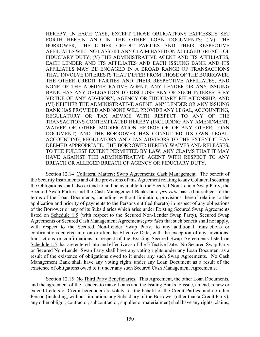 150 HEREBY, IN EACH CASE, EXCEPT THOSE OBLIGATIONS EXPRESSLY SET FORTH HEREIN AND IN THE OTHER LOAN DOCUMENTS; (IV) THE BORROWER, THE OTHER CREDIT PARTIES AND THEIR RESPECTIVE AFFILIATES WILL NOT ASSERT ANY CLAIM BASED ON ALLEGED BREACH OF FIDUCIARY DUTY; (V) THE ADMINISTRATIVE AGENT AND ITS AFFILIATES, EACH LENDER AND ITS AFFILIATES AND EACH ISSUING BANK AND ITS AFFILIATES MAY BE ENGAGED IN A BROAD RANGE OF TRANSACTIONS THAT INVOLVE INTERESTS THAT DIFFER FROM THOSE OF THE BORROWER, THE OTHER CREDIT PARTIES AND THEIR RESPECTIVE AFFILIATES, AND NONE OF THE ADMINISTRATIVE AGENT, ANY LENDER OR ANY ISSUING BANK HAS ANY OBLIGATION TO DISCLOSE ANY OF SUCH INTERESTS BY VIRTUE OF ANY ADVISORY, AGENCY OR FIDUCIARY RELATIONSHIP; AND (VI) NEITHER THE ADMINISTRATIVE AGENT, ANY LENDER OR ANY ISSUING BANK HAS PROVIDED AND NONE WILL PROVIDE ANY LEGAL, ACCOUNTING, REGULATORY OR TAX ADVICE WITH RESPECT TO ANY OF THE TRANSACTIONS CONTEMPLATED HEREBY (INCLUDING ANY AMENDMENT, WAIVER OR OTHER MODIFICATION HEREOF OR OF ANY OTHER LOAN DOCUMENT) AND THE BORROWER HAS CONSULTED ITS OWN LEGAL, ACCOUNTING, REGULATORY AND TAX ADVISORS TO THE EXTENT IT HAS DEEMED APPROPRIATE. THE BORROWER HEREBY WAIVES AND RELEASES, TO THE FULLEST EXTENT PERMITTED BY LAW, ANY CLAIMS THAT IT MAY HAVE AGAINST THE ADMINISTRATIVE AGENT WITH RESPECT TO ANY BREACH OR ALLEGED BREACH OF AGENCY OR FIDUCIARY DUTY. Section 12.14 Collateral Matters; Swap Agreements; Cash Management. The benefit of the Security Instruments and of the provisions of this Agreement relating to any Collateral securing the Obligations shall also extend to and be available to the Secured Non-Lender Swap Party, the Secured Swap Parties and the Cash Management Banks on a pro rata basis (but subject to the terms of the Loan Documents, including, without limitation, provisions thereof relating to the application and priority of payments to the Persons entitled thereto) in respect of any obligations of the Borrower or any of its Subsidiaries which arise under Existing Secured Swap Agreements listed on Schedule 1.5 (with respect to the Secured Non-Lender Swap Party), Secured Swap Agreements or Secured Cash Management Agreements; provided that such benefit shall not apply, with respect to the Secured Non-Lender Swap Party, to any additional transactions or confirmations entered into on or after the Effective Date, with the exception of any novations, transactions or confirmations in respect of the Existing Secured Swap Agreements listed on Schedule 1.5 that are entered into and effective as of the Effective Date. No Secured Swap Party or Secured Non-Lender Swap Party shall have any voting rights under any Loan Document as a result of the existence of obligations owed to it under any such Swap Agreements. No Cash Management Bank shall have any voting rights under any Loan Document as a result of the existence of obligations owed to it under any such Secured Cash Management Agreements. Section 12.15 No Third Party Beneficiaries. This Agreement, the other Loan Documents, and the agreement of the Lenders to make Loans and the Issuing Banks to issue, amend, renew or extend Letters of Credit hereunder are solely for the benefit of the Credit Parties, and no other Person (including, without limitation, any Subsidiary of the Borrower (other than a Credit Party), any other obligor, contractor, subcontractor, supplier or materialmen) shall have any rights, claims,