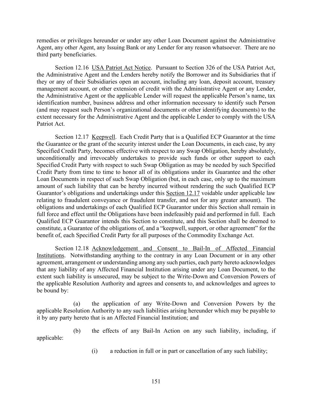 151 remedies or privileges hereunder or under any other Loan Document against the Administrative Agent, any other Agent, any Issuing Bank or any Lender for any reason whatsoever. There are no third party beneficiaries. Section 12.16 USA Patriot Act Notice. Pursuant to Section 326 of the USA Patriot Act, the Administrative Agent and the Lenders hereby notify the Borrower and its Subsidiaries that if they or any of their Subsidiaries open an account, including any loan, deposit account, treasury management account, or other extension of credit with the Administrative Agent or any Lender, the Administrative Agent or the applicable Lender will request the applicable Person’s name, tax identification number, business address and other information necessary to identify such Person (and may request such Person’s organizational documents or other identifying documents) to the extent necessary for the Administrative Agent and the applicable Lender to comply with the USA Patriot Act. Section 12.17 Keepwell. Each Credit Party that is a Qualified ECP Guarantor at the time the Guarantee or the grant of the security interest under the Loan Documents, in each case, by any Specified Credit Party, becomes effective with respect to any Swap Obligation, hereby absolutely, unconditionally and irrevocably undertakes to provide such funds or other support to each Specified Credit Party with respect to such Swap Obligation as may be needed by such Specified Credit Party from time to time to honor all of its obligations under its Guarantee and the other Loan Documents in respect of such Swap Obligation (but, in each case, only up to the maximum amount of such liability that can be hereby incurred without rendering the such Qualified ECP Guarantor’s obligations and undertakings under this Section 12.17 voidable under applicable law relating to fraudulent conveyance or fraudulent transfer, and not for any greater amount). The obligations and undertakings of each Qualified ECP Guarantor under this Section shall remain in full force and effect until the Obligations have been indefeasibly paid and performed in full. Each Qualified ECP Guarantor intends this Section to constitute, and this Section shall be deemed to constitute, a Guarantee of the obligations of, and a “keepwell, support, or other agreement” for the benefit of, each Specified Credit Party for all purposes of the Commodity Exchange Act. Section 12.18 Acknowledgement and Consent to Bail-In of Affected Financial Institutions. Notwithstanding anything to the contrary in any Loan Document or in any other agreement, arrangement or understanding among any such parties, each party hereto acknowledges that any liability of any Affected Financial Institution arising under any Loan Document, to the extent such liability is unsecured, may be subject to the Write-Down and Conversion Powers of the applicable Resolution Authority and agrees and consents to, and acknowledges and agrees to be bound by: (a) the application of any Write-Down and Conversion Powers by the applicable Resolution Authority to any such liabilities arising hereunder which may be payable to it by any party hereto that is an Affected Financial Institution; and (b) the effects of any Bail-In Action on any such liability, including, if applicable: (i) a reduction in full or in part or cancellation of any such liability;