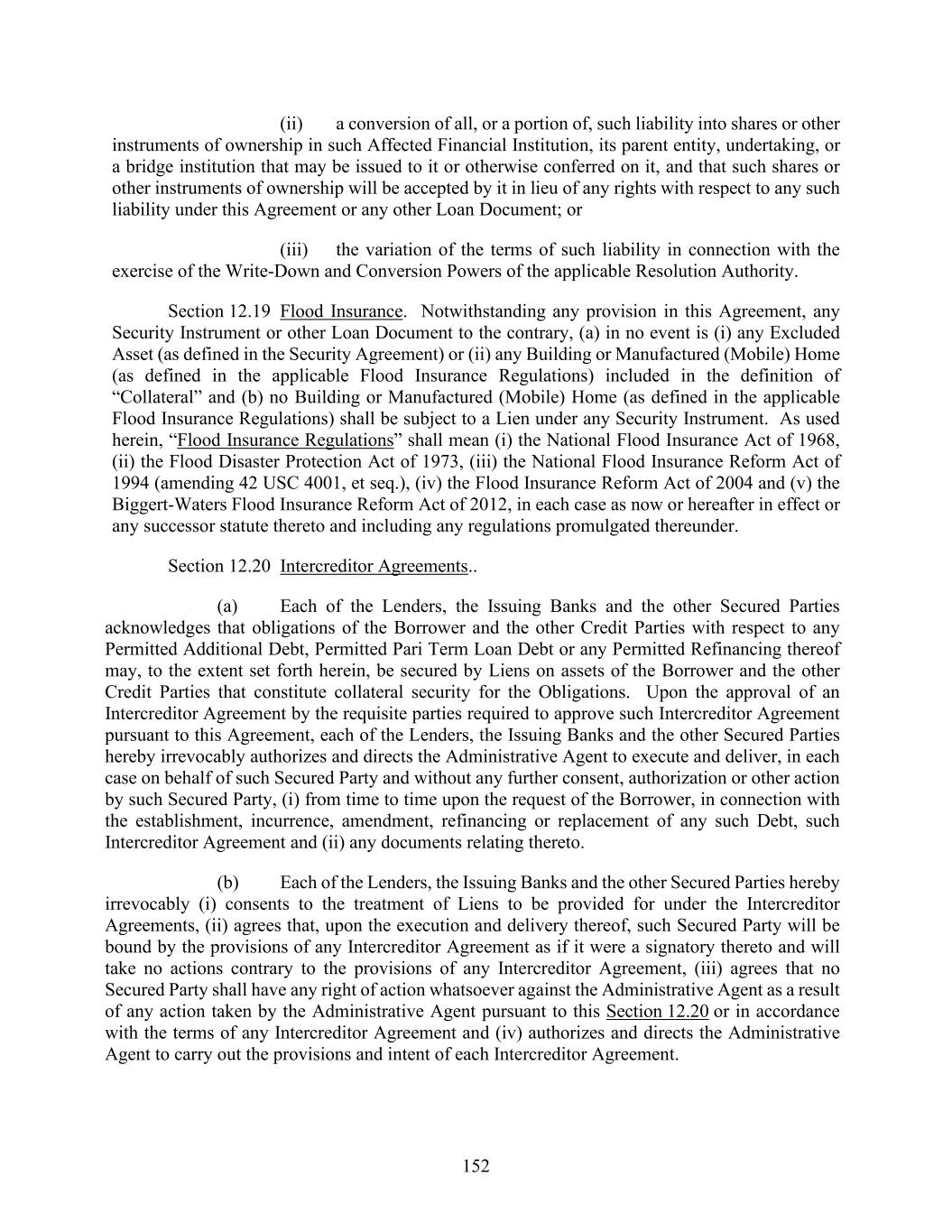 152 (ii) a conversion of all, or a portion of, such liability into shares or other instruments of ownership in such Affected Financial Institution, its parent entity, undertaking, or a bridge institution that may be issued to it or otherwise conferred on it, and that such shares or other instruments of ownership will be accepted by it in lieu of any rights with respect to any such liability under this Agreement or any other Loan Document; or (iii) the variation of the terms of such liability in connection with the exercise of the Write-Down and Conversion Powers of the applicable Resolution Authority. Section 12.19 Flood Insurance. Notwithstanding any provision in this Agreement, any Security Instrument or other Loan Document to the contrary, (a) in no event is (i) any Excluded Asset (as defined in the Security Agreement) or (ii) any Building or Manufactured (Mobile) Home (as defined in the applicable Flood Insurance Regulations) included in the definition of “Collateral” and (b) no Building or Manufactured (Mobile) Home (as defined in the applicable Flood Insurance Regulations) shall be subject to a Lien under any Security Instrument. As used herein, “Flood Insurance Regulations” shall mean (i) the National Flood Insurance Act of 1968, (ii) the Flood Disaster Protection Act of 1973, (iii) the National Flood Insurance Reform Act of 1994 (amending 42 USC 4001, et seq.), (iv) the Flood Insurance Reform Act of 2004 and (v) the Biggert-Waters Flood Insurance Reform Act of 2012, in each case as now or hereafter in effect or any successor statute thereto and including any regulations promulgated thereunder. Section 12.20 Intercreditor Agreements.. (a) Each of the Lenders, the Issuing Banks and the other Secured Parties acknowledges that obligations of the Borrower and the other Credit Parties with respect to any Permitted Additional Debt, Permitted Pari Term Loan Debt or any Permitted Refinancing thereof may, to the extent set forth herein, be secured by Liens on assets of the Borrower and the other Credit Parties that constitute collateral security for the Obligations. Upon the approval of an Intercreditor Agreement by the requisite parties required to approve such Intercreditor Agreement pursuant to this Agreement, each of the Lenders, the Issuing Banks and the other Secured Parties hereby irrevocably authorizes and directs the Administrative Agent to execute and deliver, in each case on behalf of such Secured Party and without any further consent, authorization or other action by such Secured Party, (i) from time to time upon the request of the Borrower, in connection with the establishment, incurrence, amendment, refinancing or replacement of any such Debt, such Intercreditor Agreement and (ii) any documents relating thereto. (b) Each of the Lenders, the Issuing Banks and the other Secured Parties hereby irrevocably (i) consents to the treatment of Liens to be provided for under the Intercreditor Agreements, (ii) agrees that, upon the execution and delivery thereof, such Secured Party will be bound by the provisions of any Intercreditor Agreement as if it were a signatory thereto and will take no actions contrary to the provisions of any Intercreditor Agreement, (iii) agrees that no Secured Party shall have any right of action whatsoever against the Administrative Agent as a result of any action taken by the Administrative Agent pursuant to this Section 12.20 or in accordance with the terms of any Intercreditor Agreement and (iv) authorizes and directs the Administrative Agent to carry out the provisions and intent of each Intercreditor Agreement.