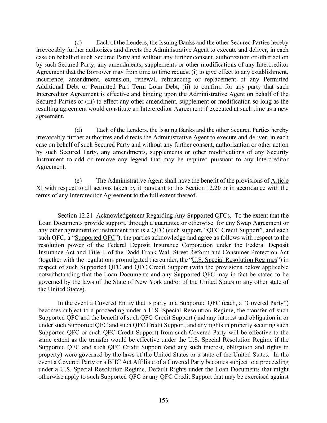 153 (c) Each of the Lenders, the Issuing Banks and the other Secured Parties hereby irrevocably further authorizes and directs the Administrative Agent to execute and deliver, in each case on behalf of such Secured Party and without any further consent, authorization or other action by such Secured Party, any amendments, supplements or other modifications of any Intercreditor Agreement that the Borrower may from time to time request (i) to give effect to any establishment, incurrence, amendment, extension, renewal, refinancing or replacement of any Permitted Additional Debt or Permitted Pari Term Loan Debt, (ii) to confirm for any party that such Intercreditor Agreement is effective and binding upon the Administrative Agent on behalf of the Secured Parties or (iii) to effect any other amendment, supplement or modification so long as the resulting agreement would constitute an Intercreditor Agreement if executed at such time as a new agreement. (d) Each of the Lenders, the Issuing Banks and the other Secured Parties hereby irrevocably further authorizes and directs the Administrative Agent to execute and deliver, in each case on behalf of such Secured Party and without any further consent, authorization or other action by such Secured Party, any amendments, supplements or other modifications of any Security Instrument to add or remove any legend that may be required pursuant to any Intercreditor Agreement. (e) The Administrative Agent shall have the benefit of the provisions of Article XI with respect to all actions taken by it pursuant to this Section 12.20 or in accordance with the terms of any Intercreditor Agreement to the full extent thereof. Section 12.21 Acknowledgement Regarding Any Supported QFCs. To the extent that the Loan Documents provide support, through a guarantee or otherwise, for any Swap Agreement or any other agreement or instrument that is a QFC (such support, “QFC Credit Support”, and each such QFC, a “Supported QFC”), the parties acknowledge and agree as follows with respect to the resolution power of the Federal Deposit Insurance Corporation under the Federal Deposit Insurance Act and Title II of the Dodd-Frank Wall Street Reform and Consumer Protection Act (together with the regulations promulgated thereunder, the “U.S. Special Resolution Regimes”) in respect of such Supported QFC and QFC Credit Support (with the provisions below applicable notwithstanding that the Loan Documents and any Supported QFC may in fact be stated to be governed by the laws of the State of New York and/or of the United States or any other state of the United States). In the event a Covered Entity that is party to a Supported QFC (each, a “Covered Party”) becomes subject to a proceeding under a U.S. Special Resolution Regime, the transfer of such Supported QFC and the benefit of such QFC Credit Support (and any interest and obligation in or under such Supported QFC and such QFC Credit Support, and any rights in property securing such Supported QFC or such QFC Credit Support) from such Covered Party will be effective to the same extent as the transfer would be effective under the U.S. Special Resolution Regime if the Supported QFC and such QFC Credit Support (and any such interest, obligation and rights in property) were governed by the laws of the United States or a state of the United States. In the event a Covered Party or a BHC Act Affiliate of a Covered Party becomes subject to a proceeding under a U.S. Special Resolution Regime, Default Rights under the Loan Documents that might otherwise apply to such Supported QFC or any QFC Credit Support that may be exercised against