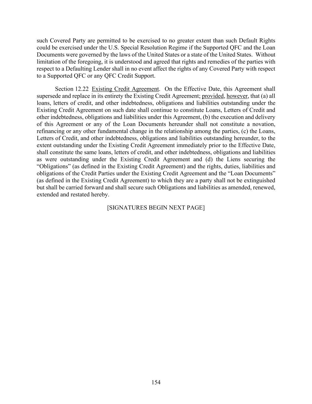 154 such Covered Party are permitted to be exercised to no greater extent than such Default Rights could be exercised under the U.S. Special Resolution Regime if the Supported QFC and the Loan Documents were governed by the laws of the United States or a state of the United States. Without limitation of the foregoing, it is understood and agreed that rights and remedies of the parties with respect to a Defaulting Lender shall in no event affect the rights of any Covered Party with respect to a Supported QFC or any QFC Credit Support. Section 12.22 Existing Credit Agreement. On the Effective Date, this Agreement shall supersede and replace in its entirety the Existing Credit Agreement; provided, however, that (a) all loans, letters of credit, and other indebtedness, obligations and liabilities outstanding under the Existing Credit Agreement on such date shall continue to constitute Loans, Letters of Credit and other indebtedness, obligations and liabilities under this Agreement, (b) the execution and delivery of this Agreement or any of the Loan Documents hereunder shall not constitute a novation, refinancing or any other fundamental change in the relationship among the parties, (c) the Loans, Letters of Credit, and other indebtedness, obligations and liabilities outstanding hereunder, to the extent outstanding under the Existing Credit Agreement immediately prior to the Effective Date, shall constitute the same loans, letters of credit, and other indebtedness, obligations and liabilities as were outstanding under the Existing Credit Agreement and (d) the Liens securing the “Obligations” (as defined in the Existing Credit Agreement) and the rights, duties, liabilities and obligations of the Credit Parties under the Existing Credit Agreement and the “Loan Documents” (as defined in the Existing Credit Agreement) to which they are a party shall not be extinguished but shall be carried forward and shall secure such Obligations and liabilities as amended, renewed, extended and restated hereby. [SIGNATURES BEGIN NEXT PAGE]