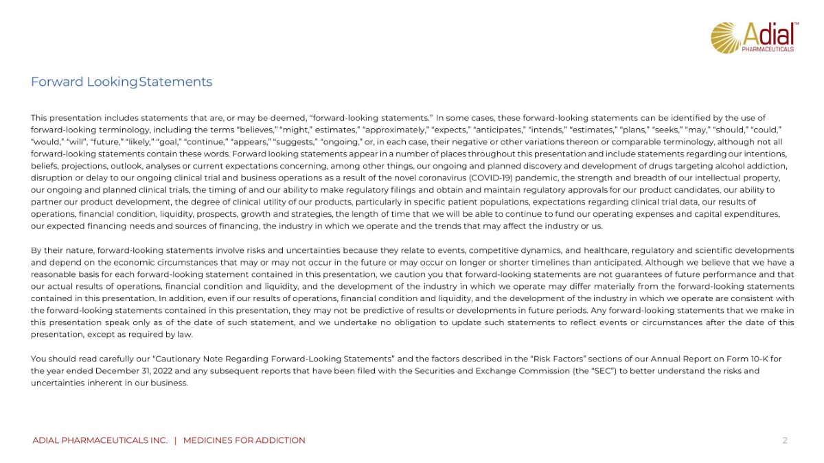 This presentation includes statements that are, or may be deemed, ‘‘forward - looking statements.’’ In some cases, these forward - looking statements can be identified by the use of forward - looking terminology, including the terms “believes,” “might,” estimates,” “approximately,” “expects,” “anticipates,” “intends,” “estimates,” “plans,” “seeks,” “may,” “should,” “could,” “would,” “will”, “future,” “likely,” “goal,” “continue,” “appears,” “suggests,” “ongoing,” or, in each case, their negative or other variations thereon or comparable terminology, although not all forward - looking statements contain these words. Forward looking statements appear in a number of places throughout this presentation and include statements regarding our intentions, beliefs, projections, outlook, analyses or current expectations concerning, among other things, our ongoing and planned discovery and development of drugs targeting alcohol addiction, disruption or delay to our ongoing clinical trial and business operations as a result of the novel coronavirus (COVID - 19) pandemic, the strength and breadth of our intellectual property, our ongoing and planned clinical trials, the timing of and our ability to make regulatory filings and obtain and maintain regulatory approvals for our product candidates, our ability to partner our product development, the degree of clinical utility of our products, particularly in specific patient populations, expectations regarding clinical trial data, our results of operations, financial condition, liquidity, prospects, growth and strategies, the length of time that we will be able to continue to fund our operating expenses and capital expenditures, our expected financing needs and sources of financing, the industry in which we operate and the trends that may affect the industry or us. By their nature, forward - looking statements involve risks and uncertainties because they relate to events, competitive dynamics, and healthcare, regulatory and scientific developments and depend on the economic circumstances that may or may not occur in the future or may occur on longer or shorter timelines than anticipated . Although we believe that we have a reasonable basis for each forward - looking statement contained in this presentation, we caution you that forward - looking statements are not guarantees of future performance and that our actual results of operations, financial condition and liquidity, and the development of the industry in which we operate may differ materially from the forward - looking statements contained in this presentation . In addition, even if our results of operations, financial condition and liquidity, and the development of the industry in which we operate are consistent with the forward - looking statements contained in this presentation, they may not be predictive of results or developments in future periods . Any forward - looking statements that we make in this presentation speak only as of the date of such statement, and we undertake no obligation to update such statements to reflect events or circumstances after the date of this presentation, except as required by law . You should read carefully our “Cautionary Note Regarding Forward - Looking Statements” and the factors described in the “Risk Factors” sections of our Annual Report on Form 10 - K for the year ended December 31, 202 2 and any subsequent reports that have been filed with the Securities and Exchange Commission (the “SEC”) to better understand the risks and uncertainties inherent in our business. 2 Forward Looking Statements ADIAL PHARMACEUTICALS INC. | MEDICINES FOR ADDICTION