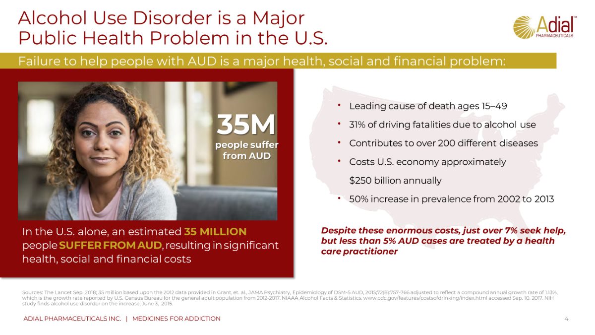 Significant Segment of Market Not Being Addressed in U.S. • The vast majority of patients that have AUD remain undiagnosed and untreated , creating a large market opportunity for a product that can address patient needs • AUD is a potentially multi - billion dollar market with limited competition & unmet need (accounts for ~5.3% of deaths worldwide and ~5.1% of disease worldwide) • The Lancet reports that alcohol is the number one cause of death in the U.S. & globally among both men and women ages 15 to 49 years Sources: Prevalence of AUD over 12 - months as reported by Grant, et. al., JAMA Psychiatry, Epidemiology of DSM - 5 AUD, 2015;72(8):757 - 766. 3 5M Patients with AUD 5 ADIAL PHARMACEUTICALS INC. | MEDICINES FOR ADDICTION Sources: NIAAA Alcohol Facts & Statistics. www.cdc.gov/features/costsofdrinking/index.html accessed June 3, 2020. The Lancet Sep. 2018., WHO Fact Sheets www.who.int/news - room/fact - sheets/detail/alcohol ~2.7M patients seeking treatment AUD Due to limitations of existing therapies, over 95% of people with AUD do not receive medical treatment