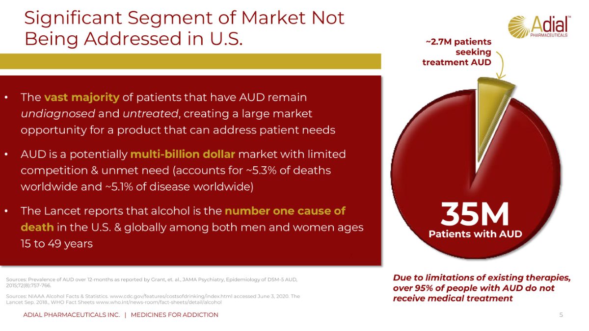 Alcohol Use Disorder is a Major Public Health Problem in the U.S. 4 In the U.S. alone, an estimated 35 MILLION people SUFFER FROM AUD , resulting in significant health, social and financial costs • Leading cause of death ages 15 – 49 • 31% of driving fatalities due to alcohol use • Contributes to over 200 different diseases • Costs U.S. economy approximately $250 billion annually • 50% increase in prevalence from 2002 to 2013 Despite these enormous costs, just over 7% seek help, but less than 5% AUD cases are treated by a health care practitioner 3 5M people suffer from AUD Sources: The Lancet Sep. 2018; 35 million based upon the 2012 data provided in Grant, et. al., JAMA Psychiatry, Epidemiology of DSM - 5 AUD, 2015;72(8):757 - 766 adjusted to reflect a compound annual growth rate of 1.13%, which is the growth rate reported by U.S. Census Bureau for the general adult population from 2012 - 2017. NIAAA Alcohol Facts & Statistics. www.cdc.gov/features/costsofdrinking/index.html accessed Sep. 10. 2017. NIH study finds alcohol use disorder on the increase, June 3, 2015. ADIAL PHARMACEUTICALS INC. | MEDICINES FOR ADDICTION Failure to help people with AUD is a major health, social and financial problem: