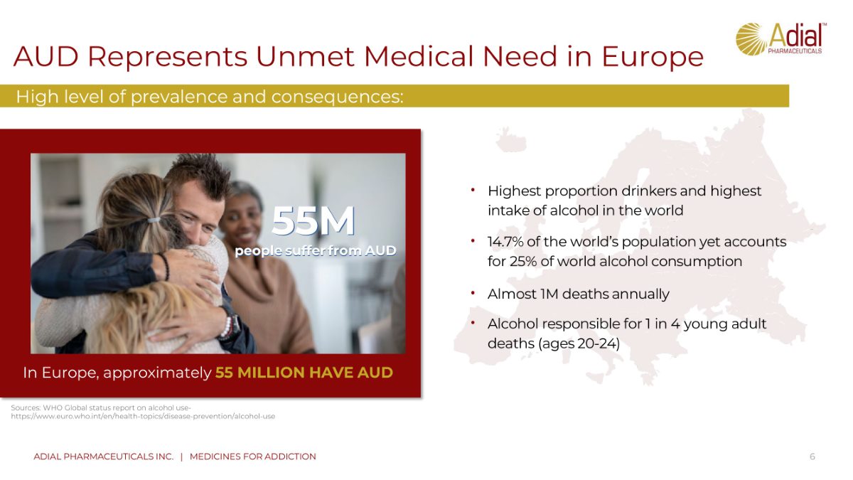 AUD Represents U nmet Medical Need in Europe In Europe, approximately 55 MILLION HAVE AUD • Highest proportion drinkers and highest intake of alcohol in the world • 14.7% of the world’s population yet accounts for 25% of world alcohol consumption • Almost 1M deaths annually • Alcohol responsible for 1 in 4 young adult deaths (ages 20 - 24) Sources: WHO Global status report on alcohol use - https://www.euro.who.int/en/health - topics/disease - prevention/alcohol - use 5 5M people suffer from AUD 5 5M people suffer from AUD 6 ADIAL PHARMACEUTICALS INC. | MEDICINES FOR ADDICTION High level of prevalence and consequences: