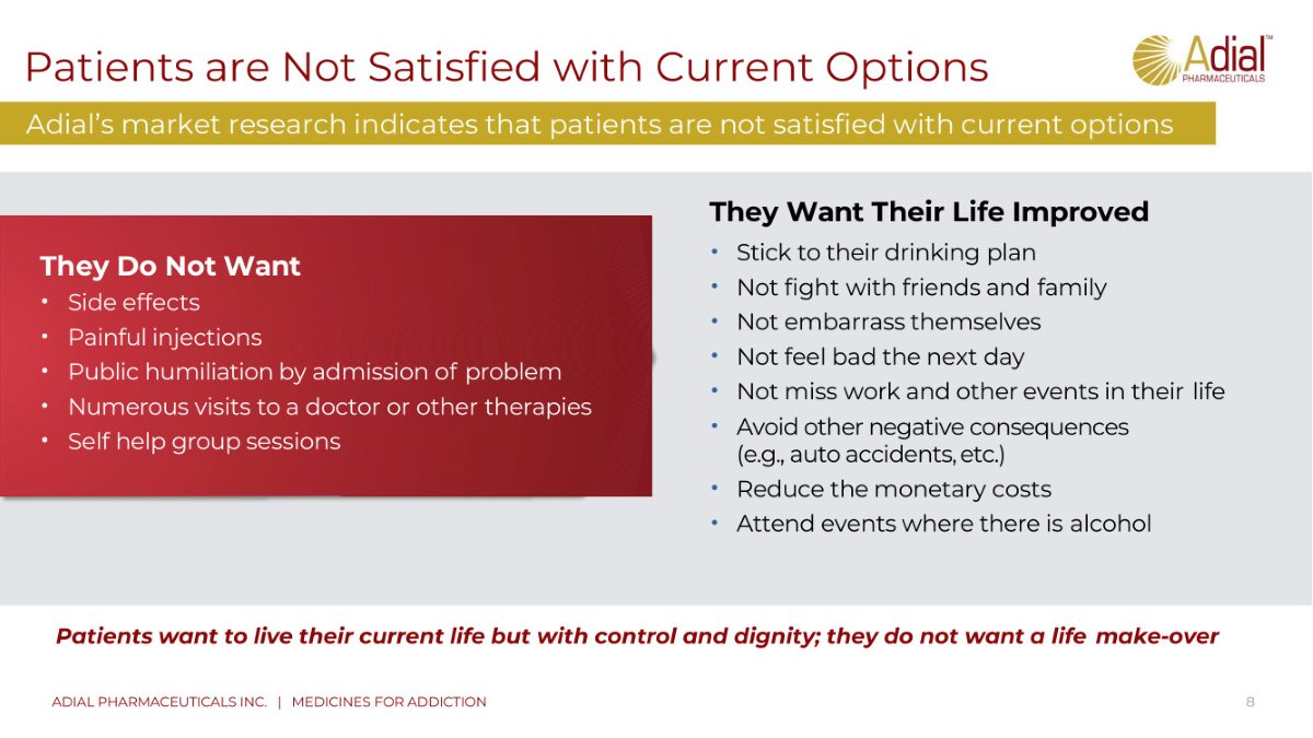 Abstinence is often the only goal, and current therapies require abstinence prior to initiating therapy • Causes a mismatch between problem and solution • Abstinence requires dramatic changes and often serious work and social consequences Patients face extreme solutions • Req uire significant lifestyle changes – e.g., Abstinence – e.g., Vivitrol is injected by physician • Need to avoid friends, family and social events • Social & professional damage for admitting problem Significant side effects of current therapies • Mental — Nausea, dizziness, psychiatric disorders and depressive symptoms • Physical — Vomiting, abdominal pain, arthritis and joint stiffness Data show that current therapeutic solutions are ineffective • 90% of patients do not achieve long - term abstinence • AUD largely goes untreated … fears of stigmatization and beliefs that treatment is ineffective may explain the lack of AUD treatment in the U.S. Abstinence Barrier Side Effect Barrier Efficacy Barrier Ease of Use & Stigmatization Barriers Sources: JAMA Psychiatry, Epidemiology of DSM - 5 AUD, 2015. Dodes, et. al., The Sober Truth: Debunking the Bad Science Behind 12 - Step Programs and the Rehab Industry, 2014 7 ADIAL PHARMACEUTICALS INC. | MEDICINES FOR ADDICTION Current Market Solutions are Failing Major characteristics of current therapeutic approaches are significant barriers to patient adoption