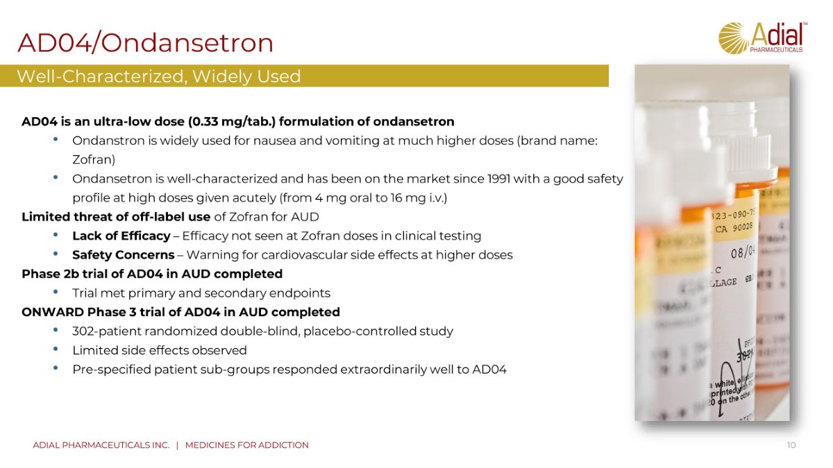 AD04 is believed to interfere with the dopamine reward system and lead to reduced alcohol intake Sources: Barnes, NM and Sharp, T, 1999; Dawes, MA et al., 2005b; Johnson, BA et al., 1993; Johnson, BA and Cowen, PJ, 1993; Lovinger, DM, 1991, 1999a; Swift, RM et al., 1996; Tomkins, DM et al., 1995 Novel Mechanism of Action for Treating AUD Studies suggest that blockade of serotonin - 3 receptors will influence the dopamine reward system activated by alcohol, decreasing dopamine release and attenuating alcohol craving s Reduced Serotonin - 3 Receptor Signaling D ec r e ased Cravings Reduced Release of Dopamine 9 ADIAL PHARMACEUTICALS INC. | MEDICINES FOR ADDICTION