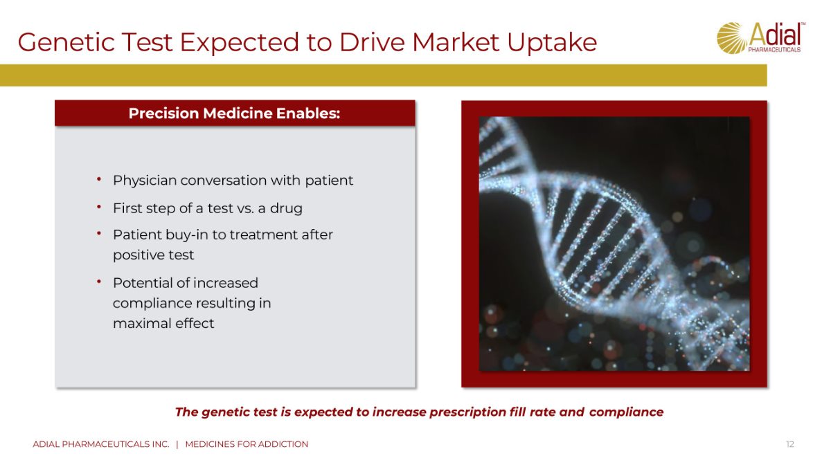 Designed to reduce craving in order to effectively curb alcohol intake Brings 20+ year record of acute clinical use with positive safety and tolerability profile Maximal patient compliance, ease of use & increased effect Ends need for abstinence, a major hurdle in starting & continuing pharmacologic therapy Takes treatment from detox clinics & group therapy - realizes patients’ desire of reduced drinking Companion genetic biomarker test identifies the patients likely to benefit from AD04 New Me chanism of Action (MOA) for treating AUD Good safety profile, high tolerability Oral daily dosing (twice - a - day now, once - a - day expected) Reduction of heavy drinking target indication Lowers the stigma of AUD and empowers the patient Genetic Tests for Precision Medicine Designed to address needs of patients who desire to control their drinking but cannot/will not undertak e abstinence or significant side effects ADIAL PHARMACEUTICALS INC. | MEDICINES FOR ADDICTION 11 AD04 is Designed to Meet the Market Need And Allow Management of Heavy Drinking