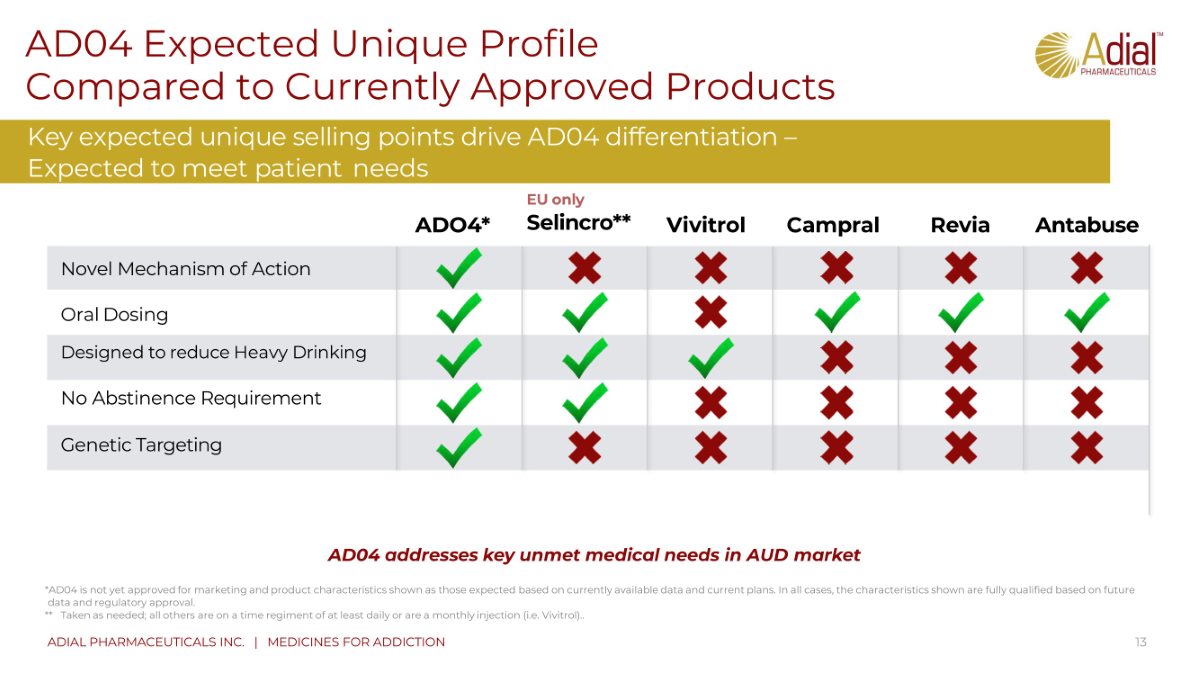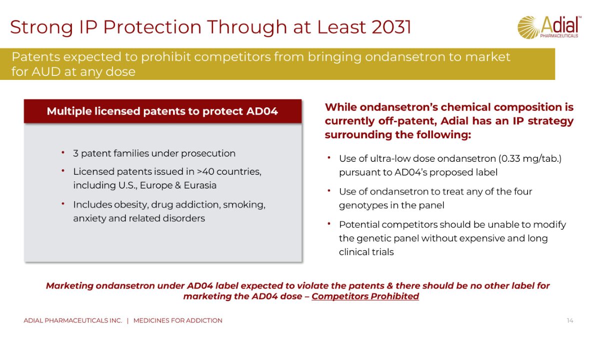 AD04 addresses key unmet medical needs in AUD market *AD04 is not yet approved for marketing and product characteristics shown as those expected based on currently available data and current plans. In all cases, the characteristics shown are fully qualified based on future data and regulatory approval. ** Taken as needed; all others are on a time regiment of at least daily or are a monthly injection (i.e. Vivitrol). . A DO 4 * EU only S e l in c r o * * V iv i tr o l C a m p ral R e v i a A nta b us e Novel Mechanism of Action Oral Dosing Designed to reduce Heavy Drinking No Abstinence Requirement Genetic Targeting ADIAL PHARMACEUTICALS INC. | MEDICINES FOR ADDICTION 13 AD04 Expected Unique Profile Compared to Currently Approved Products Key expected unique selling points drive AD04 differentiation – Expected to meet patient needs