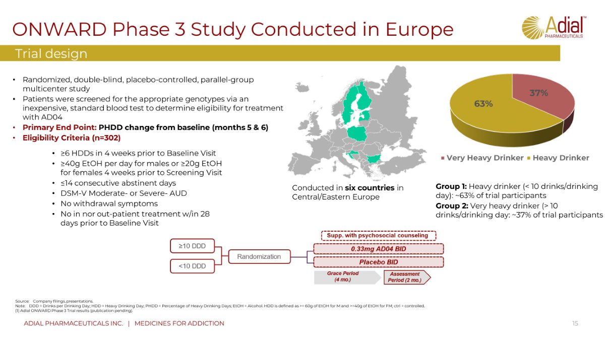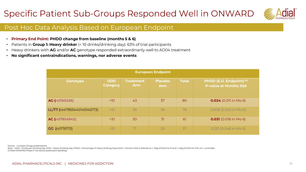 ONWARD Phase 3 Study Conducted in Europe 15 • Randomized, double - blind, placebo - c ontrolled , parallel - group multicenter study • Patients were screened for the appropriate genotypes via an inexpensive, standard blood test to determine eligibility for treatment with AD04 • Primary End Point: PHDD change from baseline (months 5 & 6) • Eligibility Criteria (n=302) Source: Company filings, presentations. Note: DDD = Drinks per Drinking Day; HDD = Heavy Drinking Day; PHDD = Percentage of Heavy Drinking Days; EtOH = Alcohol. HDD is defined as >= 60g of EtOH for M and >=40g of EtOH for FM; ctrl = controlled. (1) Adial ONWARD Phase 3 Trial results (publication pending). • ≥6 HDDs in 4 weeks prior to Baseline Visit • ≥40g EtOH per day for males or ≥20g EtOH for females 4 weeks prior to Screening Visit • ≤14 consecutive abstinent days • DSM - V Moderate - or Severe - AUD • No withdrawal symptoms • No in n or out - patient treatment w/in 28 days prior to Baseline Visit Conducted in six countries in Central/Eastern Europe Group 1: Heavy drinker (< 10 drinks/drinking day): ~63% of trial participants Group 2: Very heavy drinker (> 10 drinks/drinking day: ~37% of trial participants ADIAL PHARMACEUTICALS INC. | MEDICINES FOR ADDICTION 37% 63% Very Heavy Drinker Heavy Drinker Trial design