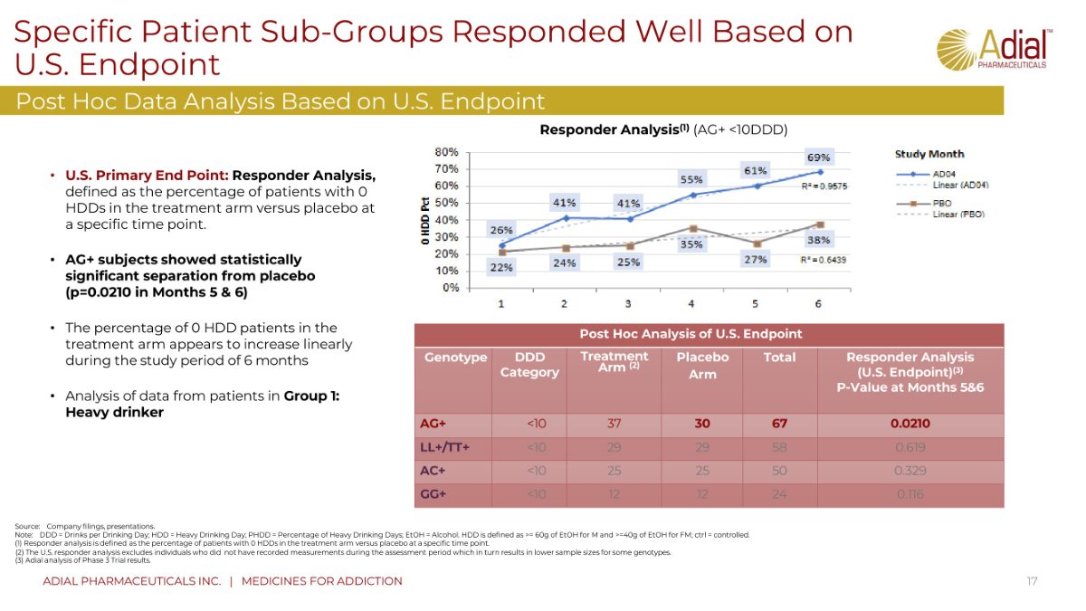 Specific Patient Sub - Groups Responded Well in ONWARD 16 E uropean Endpoint Genotype DDD Category Treatment Arm Placebo Arm Total PHDD (E . U . Endpoint) (4) P - value at Months 5&6 AG ( rs1150226) <10 43 37 80 0.024 (0.011 in Mo 6) LL/TT ( rs47955441/rs1042173) <10 39 39 78 0.608 (0.552 in Mo 6) AC ( rs17614942) <10 30 31 61 0.031 (0.018 in Mo 6) GG ( rs1176713) <10 17 20 37 0.251 (0.248 in Mo 6) Source: Company filings, presentations. Note: DDD = Drinks per Drinking Day; HDD = Heavy Drinking Day; PHDD = Percentage of Heavy Drinking Days; EtOH = Alcohol. HDD is defined as >= 60g of EtOH for M and >=40g of EtOH for FM; ctrl = controlled. (1) Adial ONWARD Phase 3 Trial results (publication pending). • Primary End Point: PHDD change from baseline (months 5 & 6) • Patients in Group 1: Heavy drinker (< 10 drinks/drinking day): 63% of trial participants • Heavy drinkers with AG and/or AC genotype responded extraordinarily well to AD04 treatment • No significant contraindications, warnings, nor adverse events ADIAL PHARMACEUTICALS INC. | MEDICINES FOR ADDICTION Post Hoc Data Analysis Based on European Endpoint