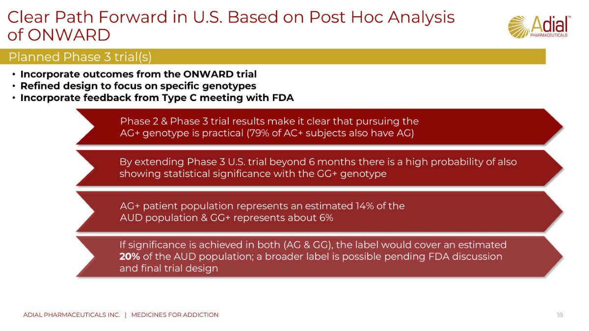 Clear Path Forward in U.S. Based on Post Hoc Analysis of ONWARD 18 • Incorporate outcomes from the ONWARD trial • Refined design to focus on specific genotypes • Incorporate feedback from Type C meeting with FDA Planned Phase 3 trial(s) AG+ patient population represents an estimated 14% of the AUD population & GG + represents about 6% By extending Phase 3 U.S. trial beyond 6 months there is a high probability of also showing statistical significance with the G G+ genotype Phase 2 & Phase 3 trial results make it clear that pursuing the AG+ genotype is practical (79% of AC+ subjects also have AG) If significance is achieved in both (AG & GG), the label would cover an estimated 20 % of the AUD population; a broader label is possible pending FDA discussion and final trial design ADIAL PHARMACEUTICALS INC. | MEDICINES FOR ADDICTION