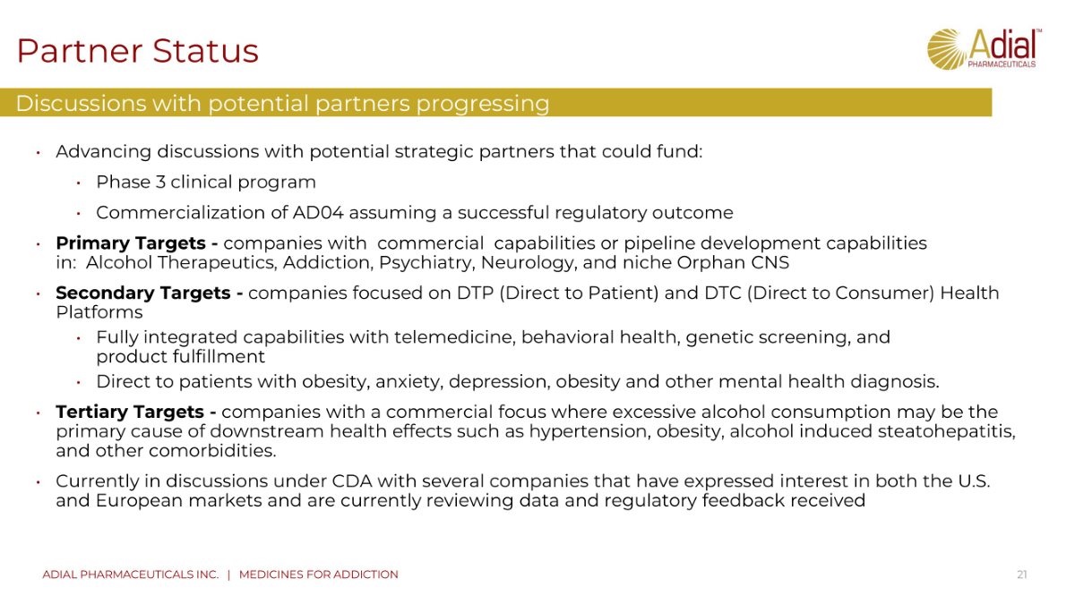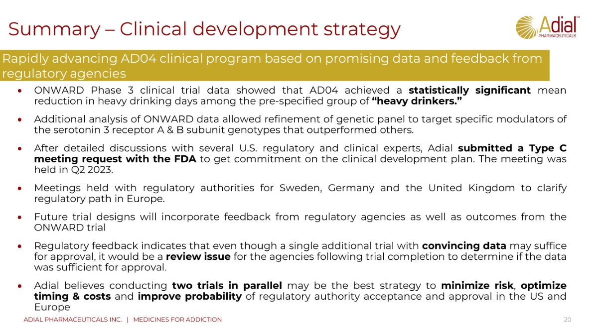 Summary – Clinical development strategy 20 ADIAL PHARMACEUTICALS INC. | MEDICINES FOR ADDICTION Rapidly advancing AD04 clinical program based on promising data and feedback from regulatory agencies ONWARD Phase 3 clinical trial data showed that AD 04 achieved a statistically significant mean reduction in heavy drinking days among the pre - specified group of “heavy drinkers . ” Additional analysis of ONWARD data allowed refinement of genetic panel to target specific modulators of the serotonin 3 receptor A & B subunit genotypes that outperformed others . After detailed discussions with several U . S . regulatory and clinical experts, Adial submitted a Type C meeting request with the FDA to get commitment on the clinical development plan . The meeting was held in Q 2 2023 . Meetings held with regulatory authorities for Sweden, Germany and the United Kingdom to clarify regulatory path in Europe . Future trial designs will incorporate feedback from regulatory agencies as well as outcomes from the ONWARD trial Regulatory feedback indicates that even though a single additional trial with convincing data may suffice for approval, it would be a review issue for the agencies following trial completion to determine if the data was sufficient for approval . Adial believes conducting two trials in parallel may be the best strategy to minimize risk , optimize timing & costs and improve probability of regulatory authority acceptance and approval in the US and Europe
